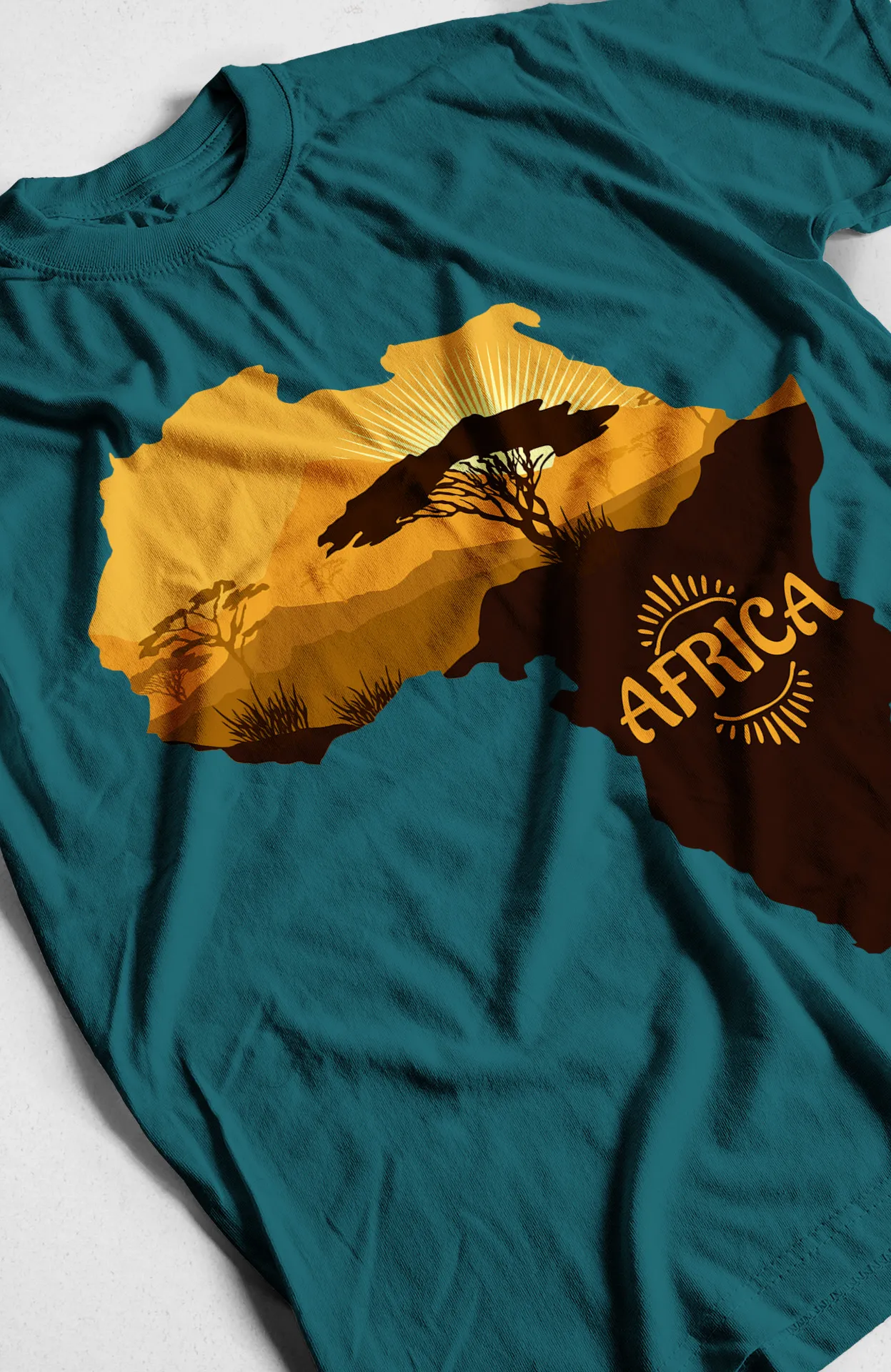 La camiseta "Africa" es la prenda perfecta para quienes quieren llevar el espíritu y la esencia de África en su día a día. Con un diseño artístico del continente africano, acompañado de una colorida paleta de tonos cálidos y un mensaje que refleja la grandeza natural, esta camiseta es más que una prenda, es una declaración de admiración por un continente lleno de historia y cultura.