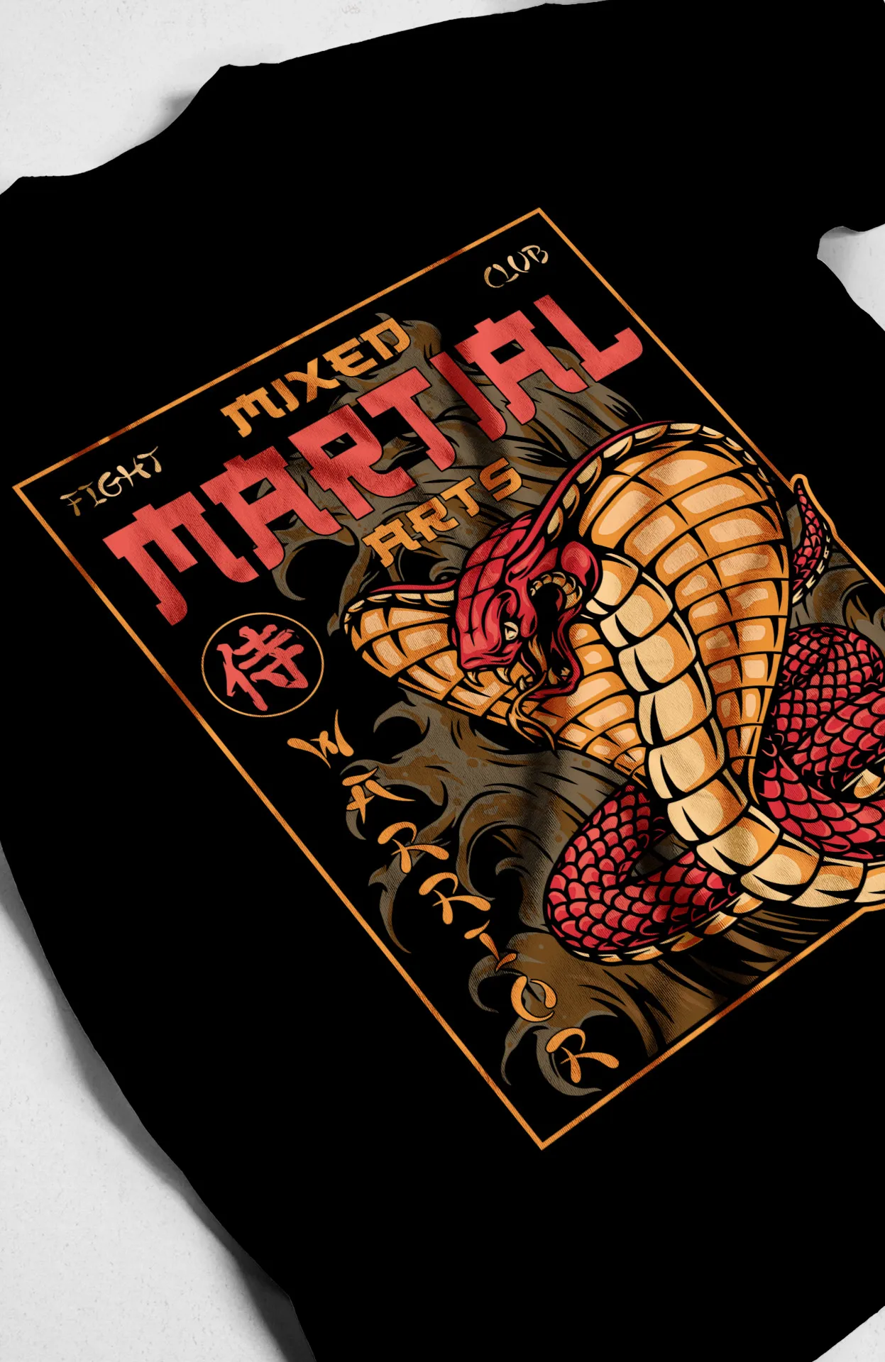 Diseño Gráfico de cobra con texto "MARTIAL ARTS" y kanjis