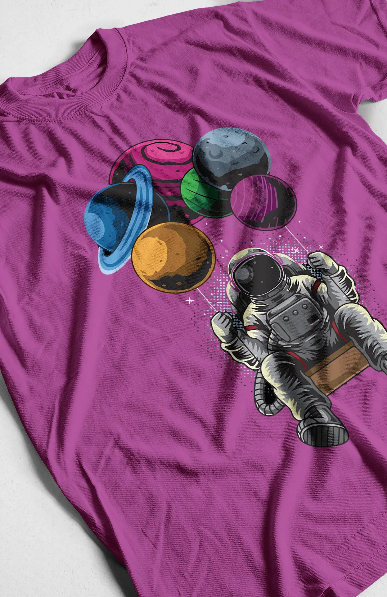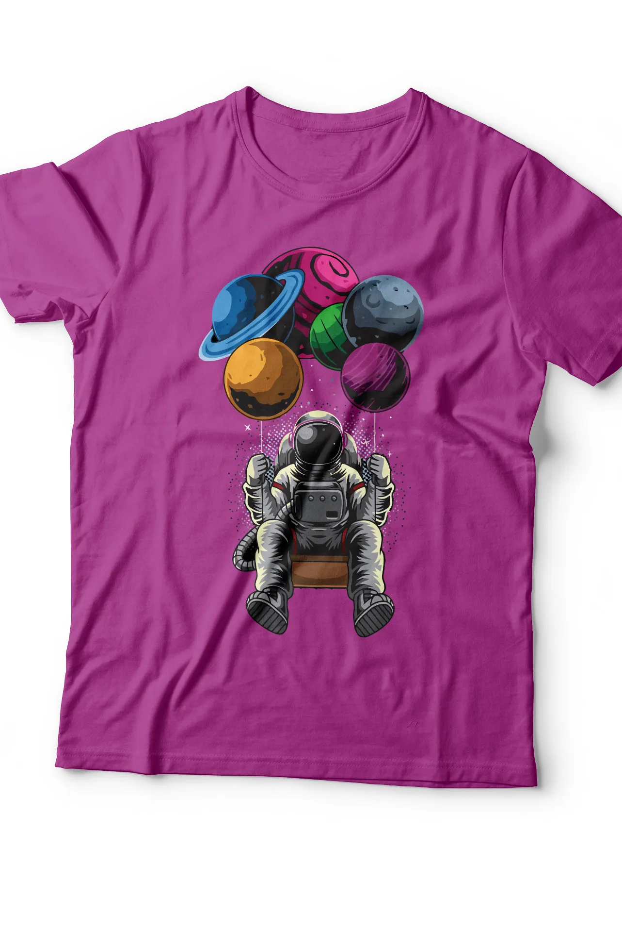 Deja volar tu imaginación con nuestra camiseta de astronauta. Este diseño caprichoso y único muestra a un astronauta balanceándose en un columpio suspendido de planetas, transformando el espacio en un patio de juegos personal. Es la pieza ideal para aquellos que aman el cosmos y la aventura de soñar sin límites. Con su vibrante color y su tejido suave, te sentirás cómodo mientras proyectas un estilo que es tan único como tus propios sueños. Una prenda que no solo se ve bien, sino que también te inspira a explorar lo desconocido.