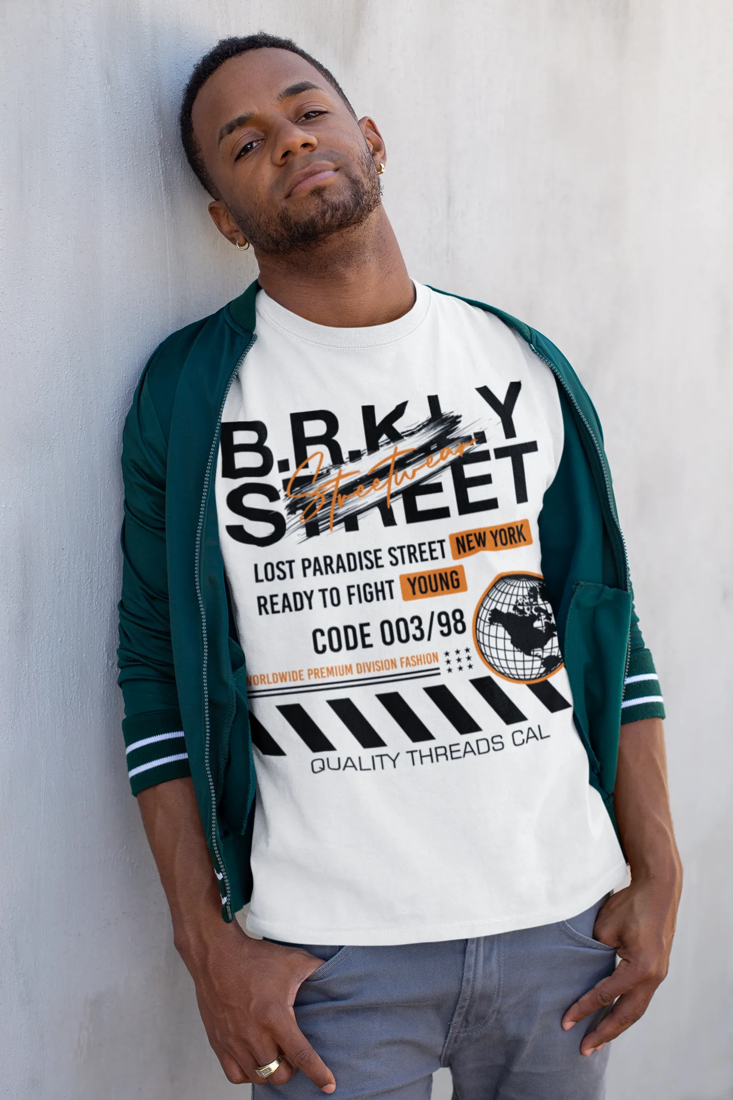 Ponte los audífonos y déjate llevar por el ritmo con la camiseta "B.R.K.L.Y Street". Esta prenda no es solo ropa; es un manifiesto de tu compromiso con la creatividad y el estilo. El diseño frontal presenta una tipografía con un estilo de ilustración audaz, con un toque minimalista que le da un toque de arte urbano. Es la pieza perfecta para quienes viven el mundo del arte con un toque de humor y audacia. Con esta camiseta, llevarás un símbolo de tu propia visión y audacia.