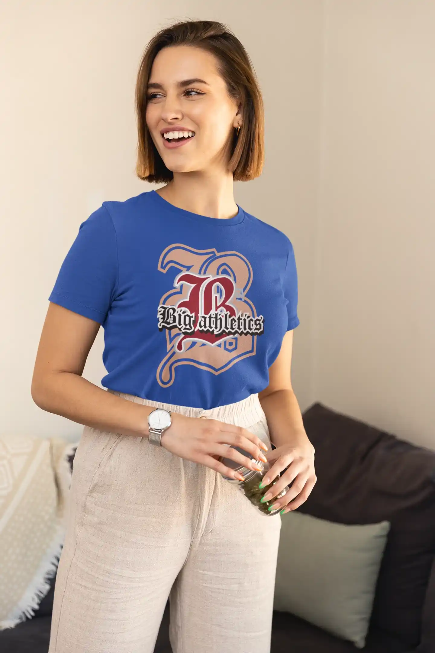- Estampado: Diseño gráfico "Big Athletics" en colores vibrantes sobre fondo azul.