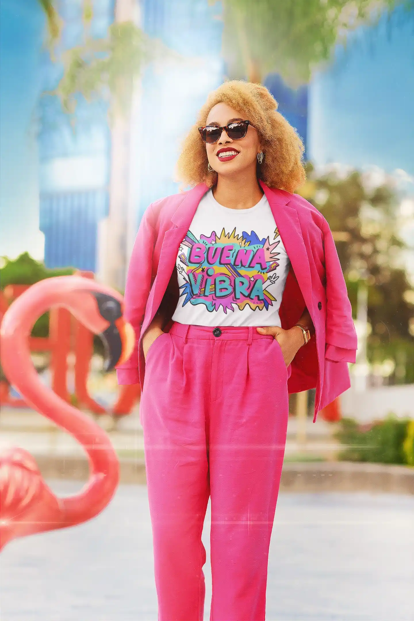 La Camiseta "Buena Vibra" es la base perfecta para un look lleno de personalidad. Combínala con jeans de mezclilla para un estilo sencillo y fresco, o úsala con pantalones de colores vibrantes como en la foto para un outfit más audaz y coordinado. También puedes llevarla con una chaqueta de cuero para un contraste interesante, o con shorts y zapatillas para un estilo veraniego y despreocupado. Su diseño llamativo es el toque final que necesitas para destacar.