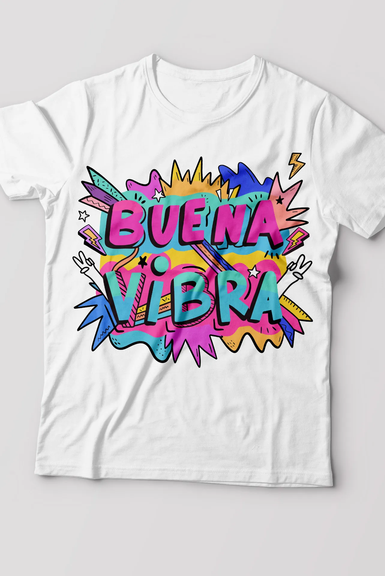- Diseño: Gráfico frontal con la frase "BUENA VIBRA" en un estilo de explosión de cómic con tipografía gruesa y contornos de color.