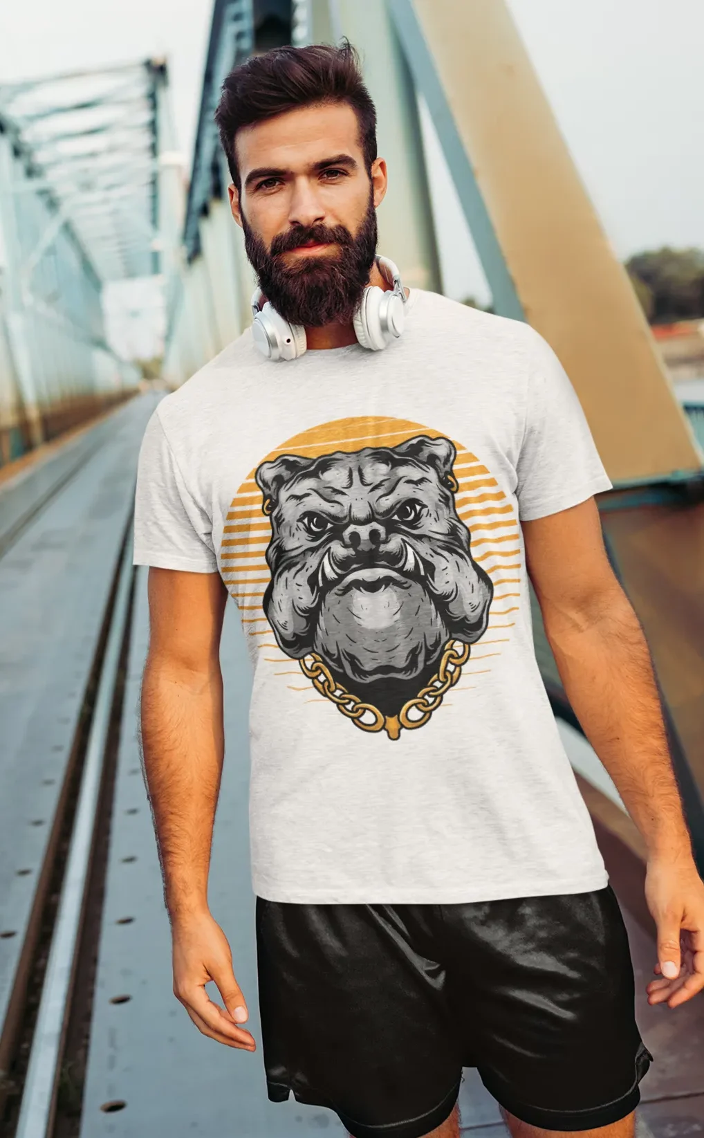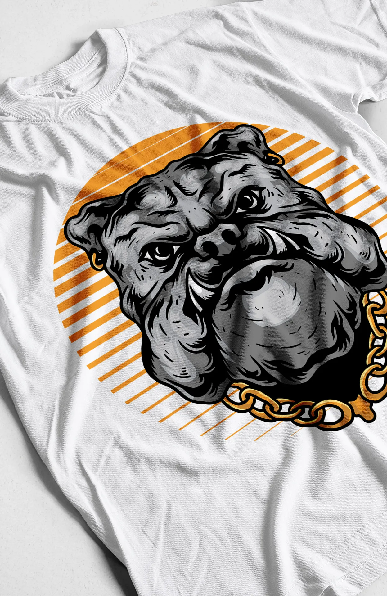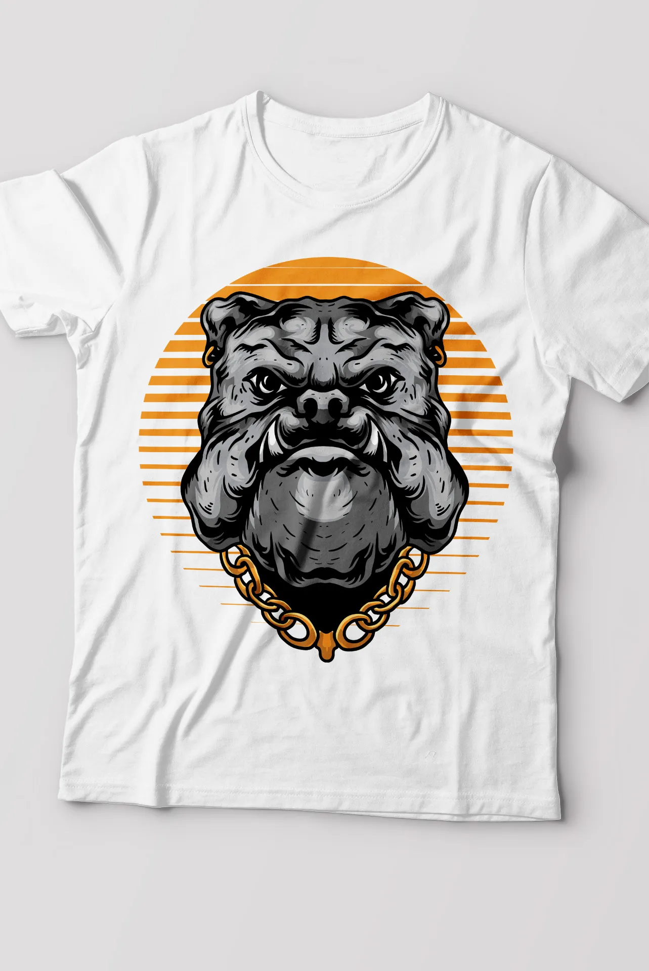 | Diseño | Gráfico de un bulldog con cadena y atardecer |