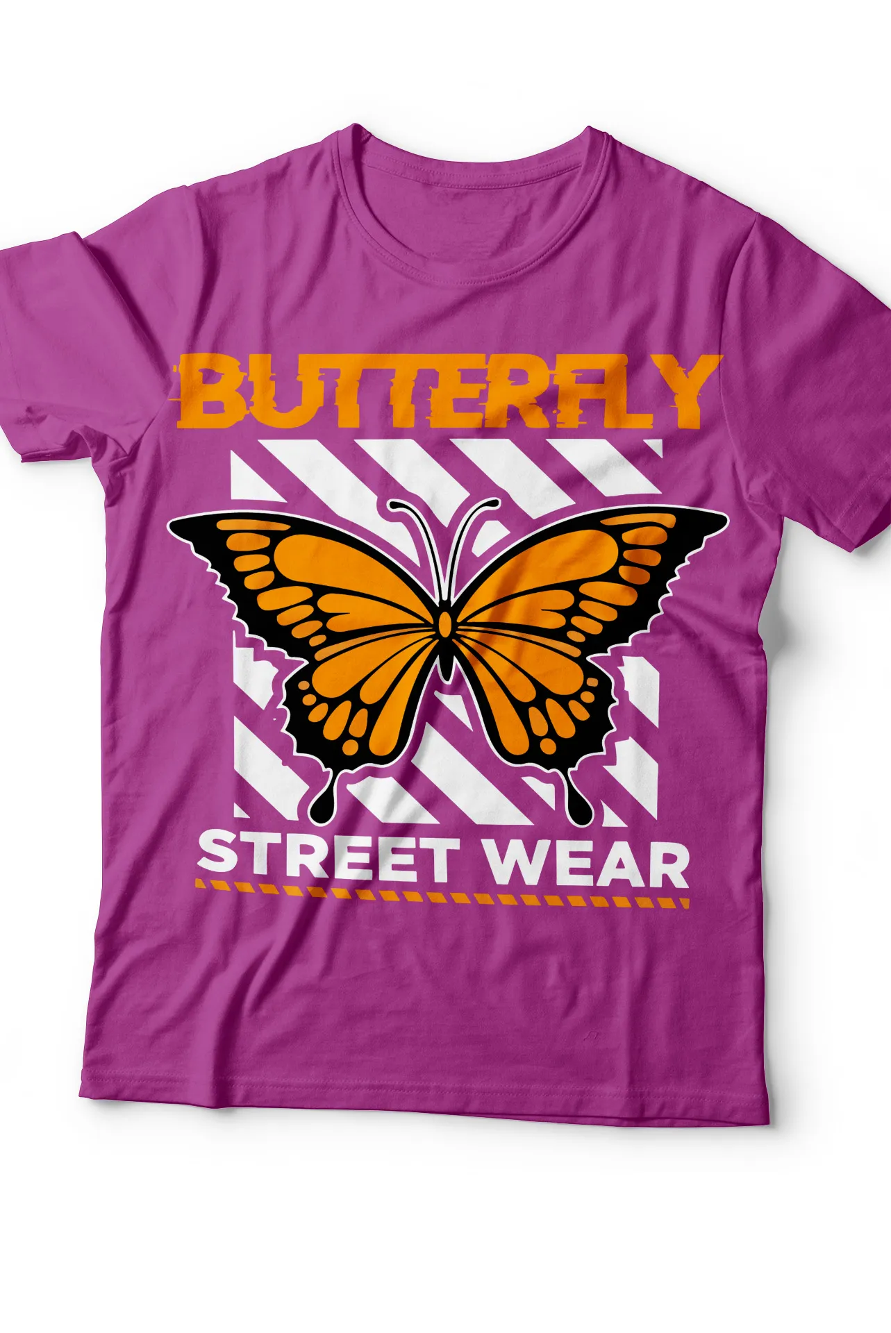 La **camiseta 'Butterfly Street Wear'** es una declaración de estilo. El diseño de la mariposa, con sus alas detalladas, se contrasta con el fondo geométrico de líneas, creando una composición dinámica y moderna. El texto 'BUTTERFLY' y 'STREET WEAR' en una tipografía fuerte refuerza el espíritu urbano de la prenda. Es la elección ideal para quienes se atreven a combinar elementos delicados con una estética más robusta. Perfecta para un paseo por la ciudad, un festival de música o para darle un toque diferente a tu atuendo diario. Es una pieza clave que demuestra que la moda es un lienzo para expresar quién eres.