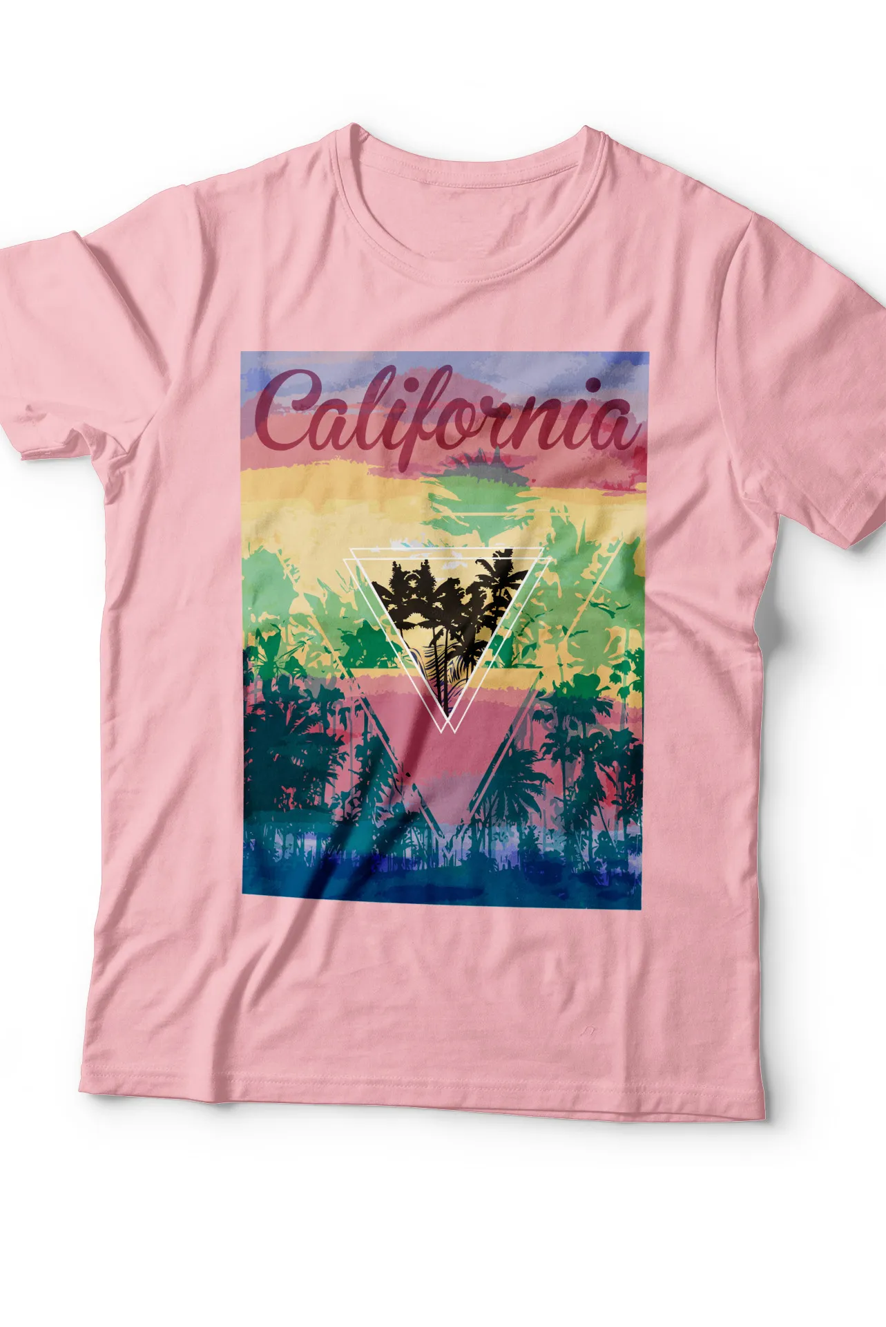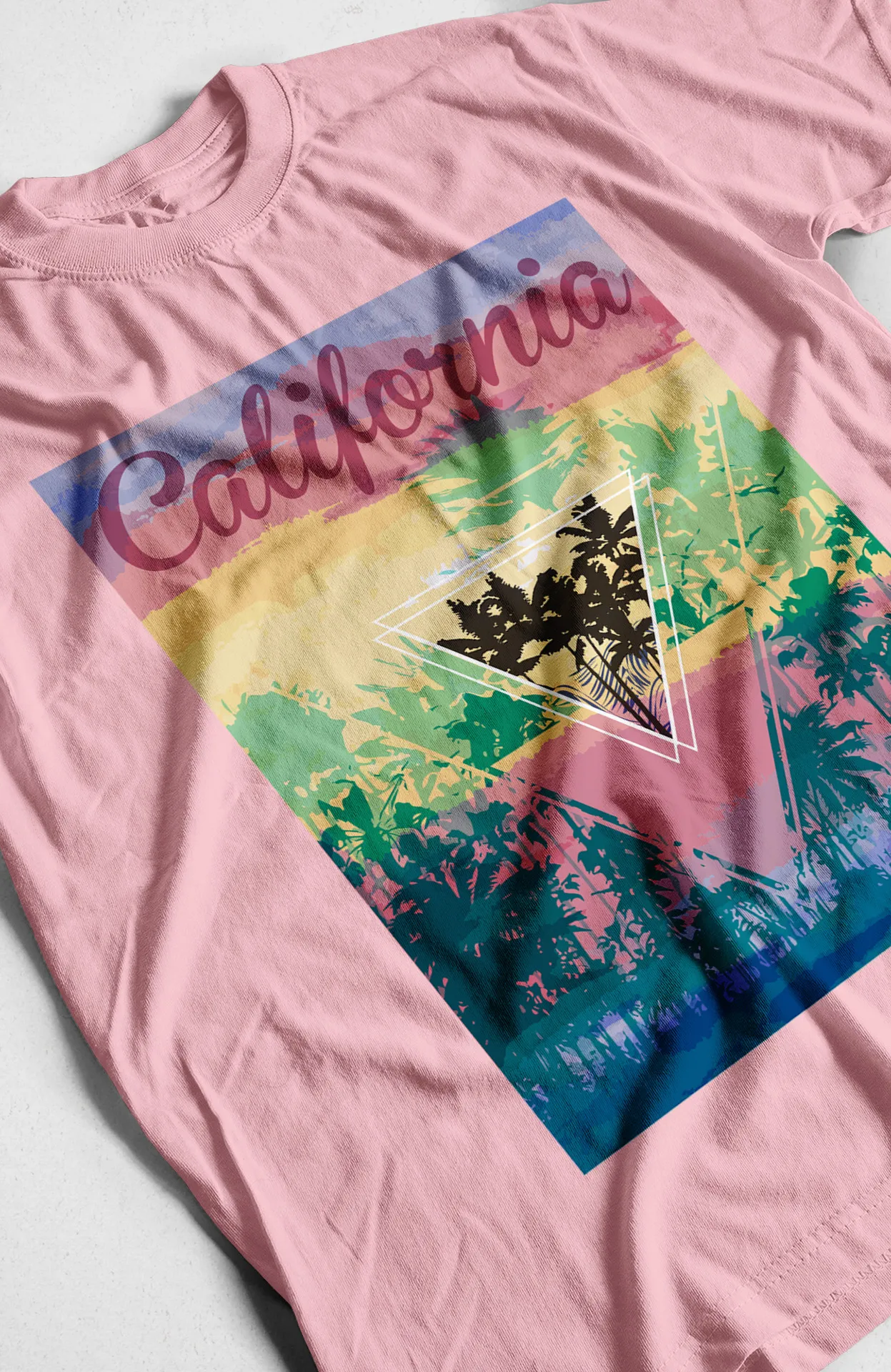 - Estampado: Diseño gráfico que incluye palmas y la palabra "California" en tonos vibrantes.