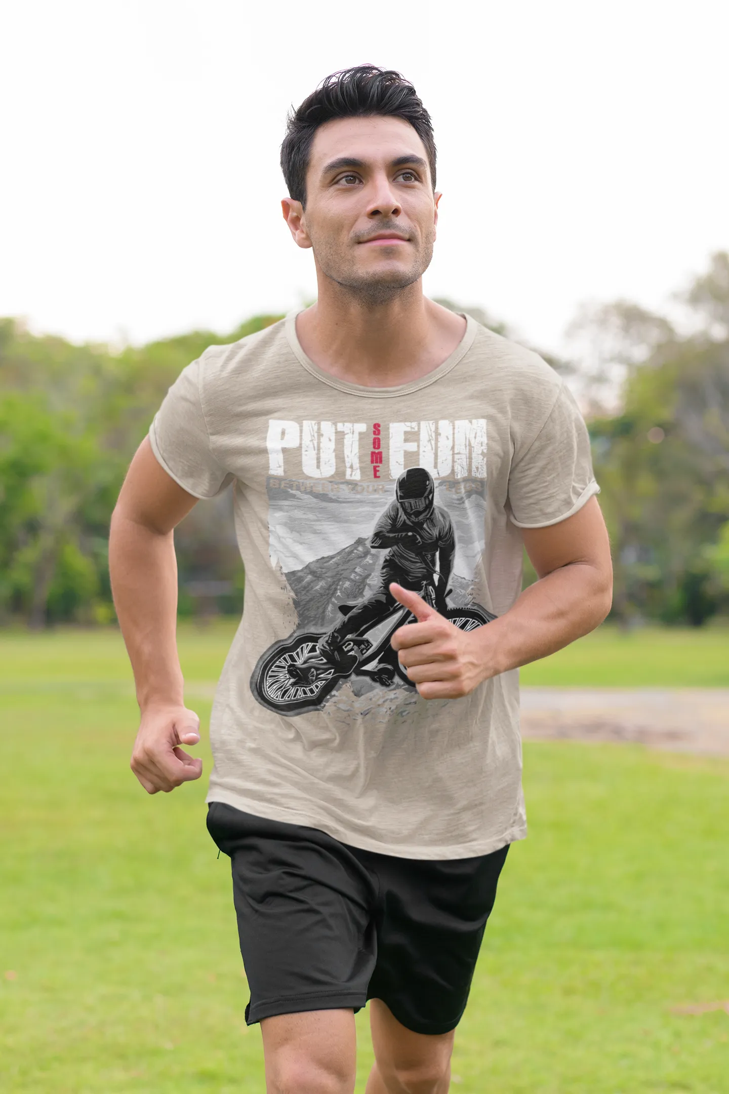 - Diseño: Estampado frontal de un ciclista de BMX en un entorno de montaña, con la leyenda "PUT FUN" en tipografía bold.
