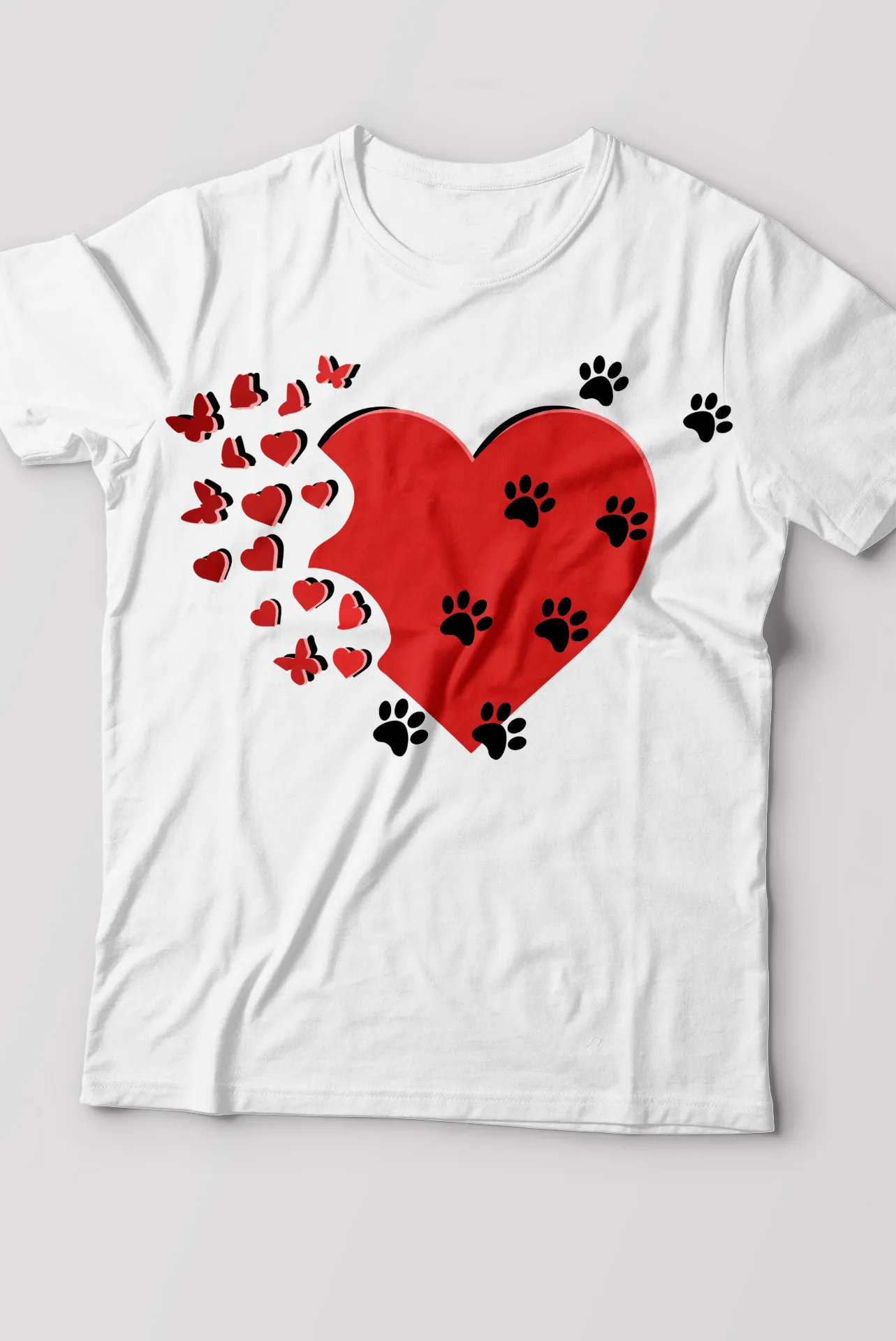 - Estampado frontal: Corazón rojo con huellas negras.