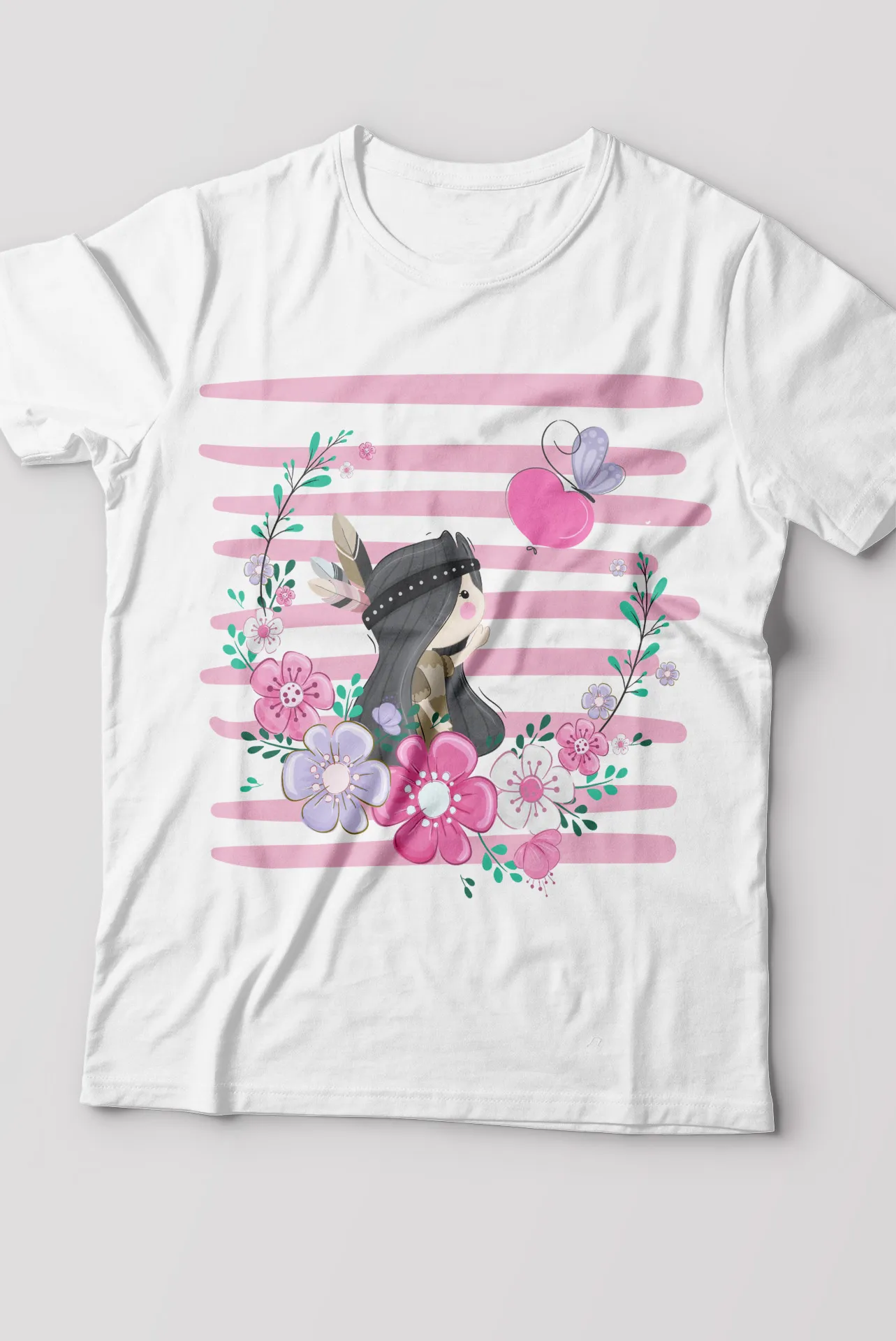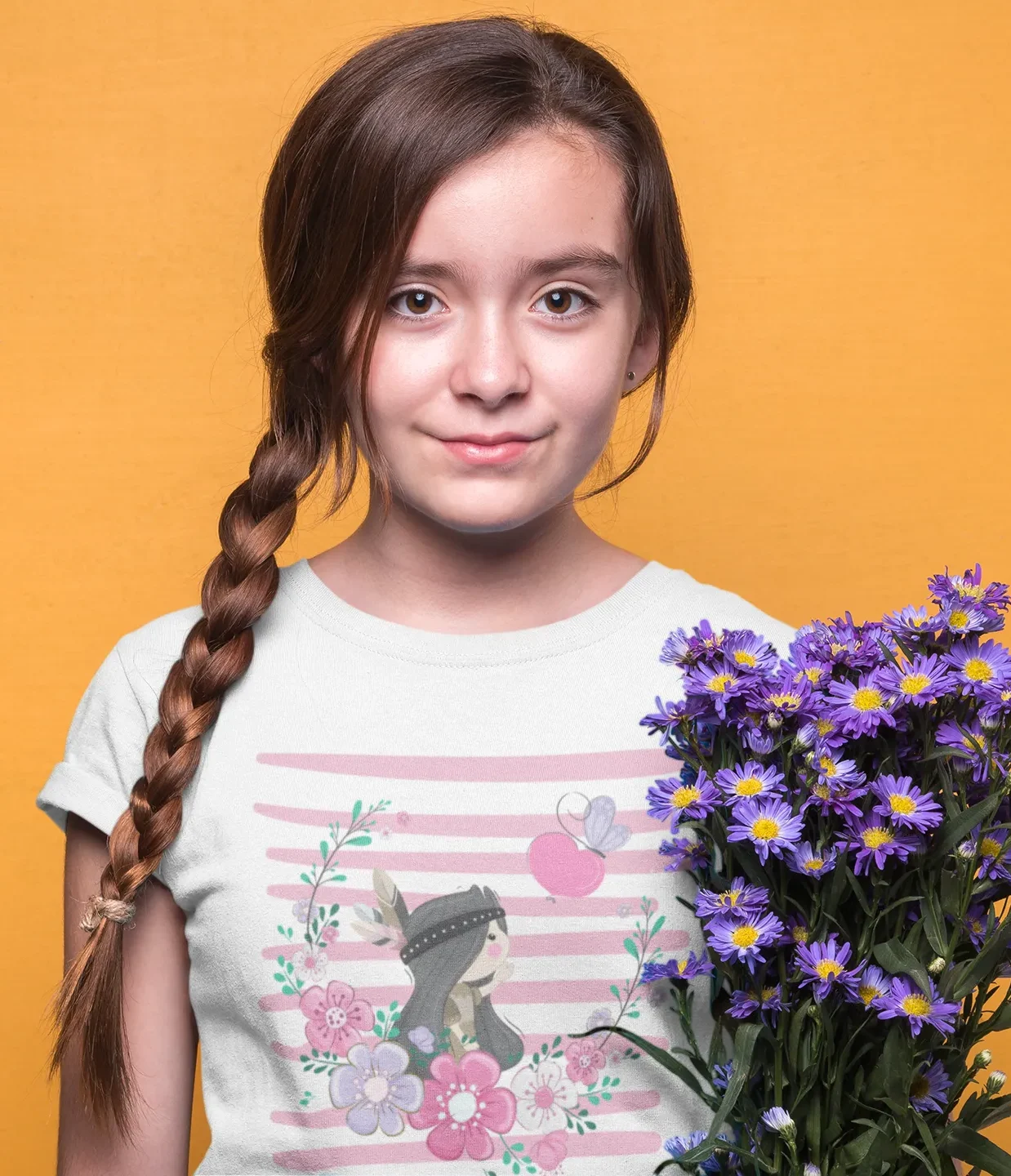 Una camiseta adorable con una niña caricaturesco rodeado de flores y corazones. Ideal para niñas que aman la naturaleza, los animales y un estilo dulce y vintage. ¡Perfecta para cualquier ocasión!