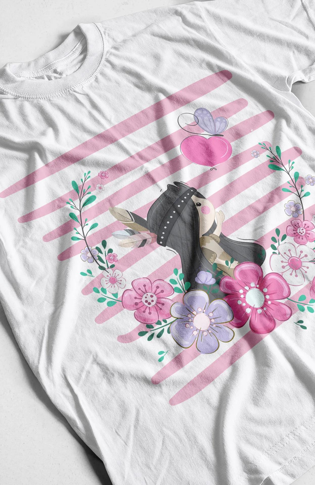 Descubre una camiseta infantil que transmite ternura y conexión con la naturaleza. Su diseño de un burrito con flores en tonos suaves y fondo de líneas rosadas ofrece un look delicado, encantador y con aire vintage, ideal para niñas que aman los animales y la estética campestre.