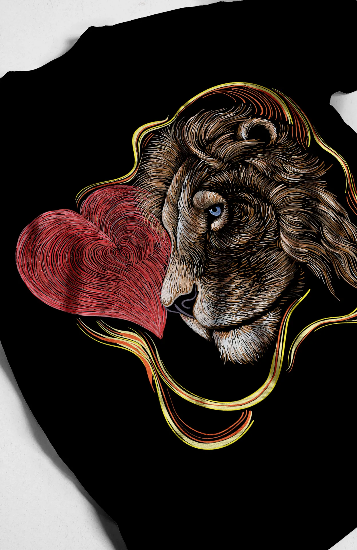 Esta camiseta se distingue por su estampado central de gran tamaño. El diseño artístico muestra la cabeza de un león, con detalles finamente dibujados, fusionada con un corazón de color rojo con una textura que simula un pelaje. Todo el diseño está enmarcado por líneas doradas que le dan un acabado elegante y llamativo. Con cuello redondo y manga corta, su confección es cómoda y clásica, perfecta para cualquier ocasión.