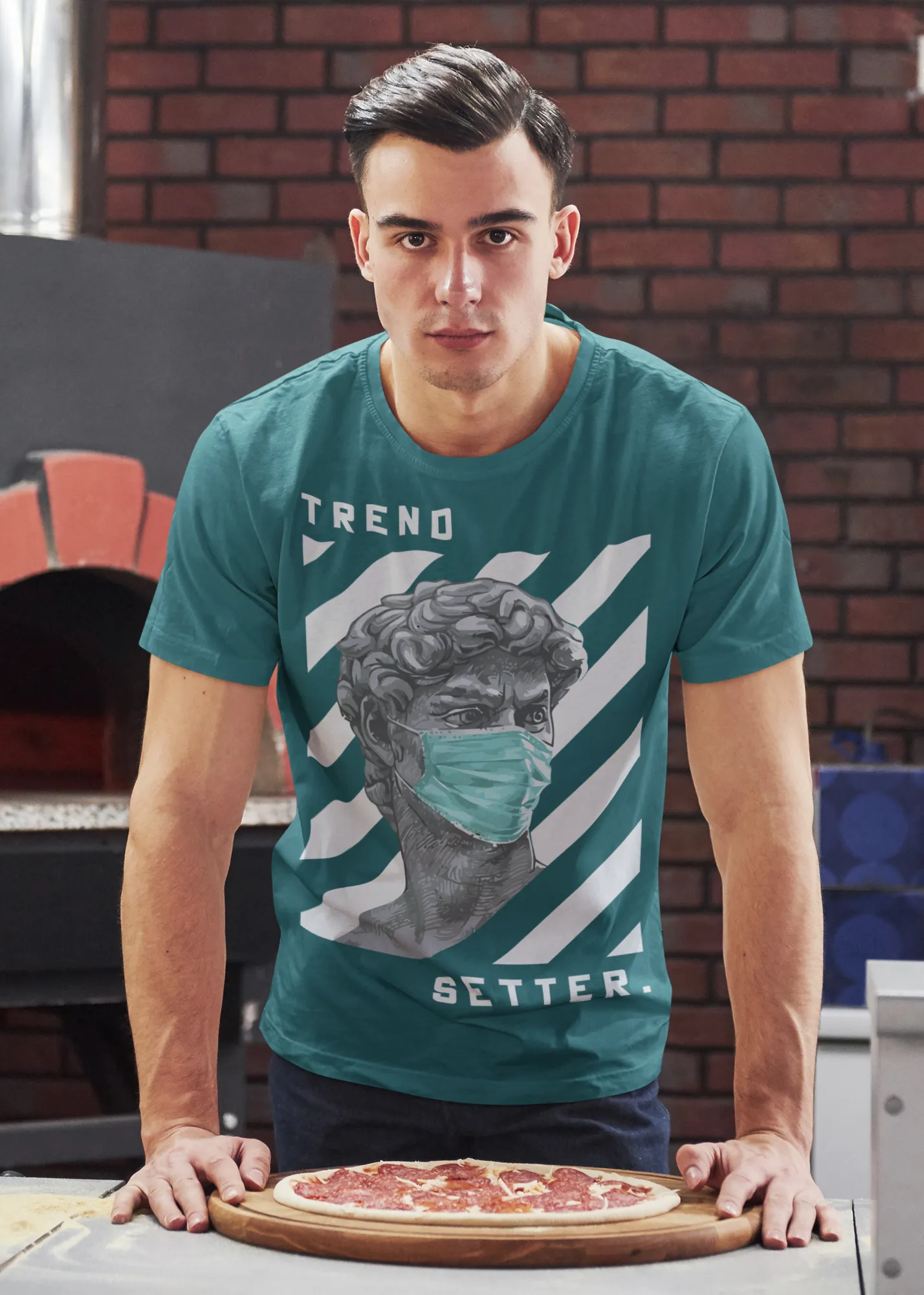 Lleva el espíritu de la innovación contigo a donde vayas con nuestra exclusiva camiseta de "Trend Setter". Esta prenda es un homenaje a la energía y la cultura de la moda, con un diseño que presenta una estatua de David con una mascarilla, con la audaz frase "TREND SETTER". Es la elección perfecta para quienes desean infundir su look con un mensaje de confianza y conexión con una de las épocas más icónicas del mundo.
