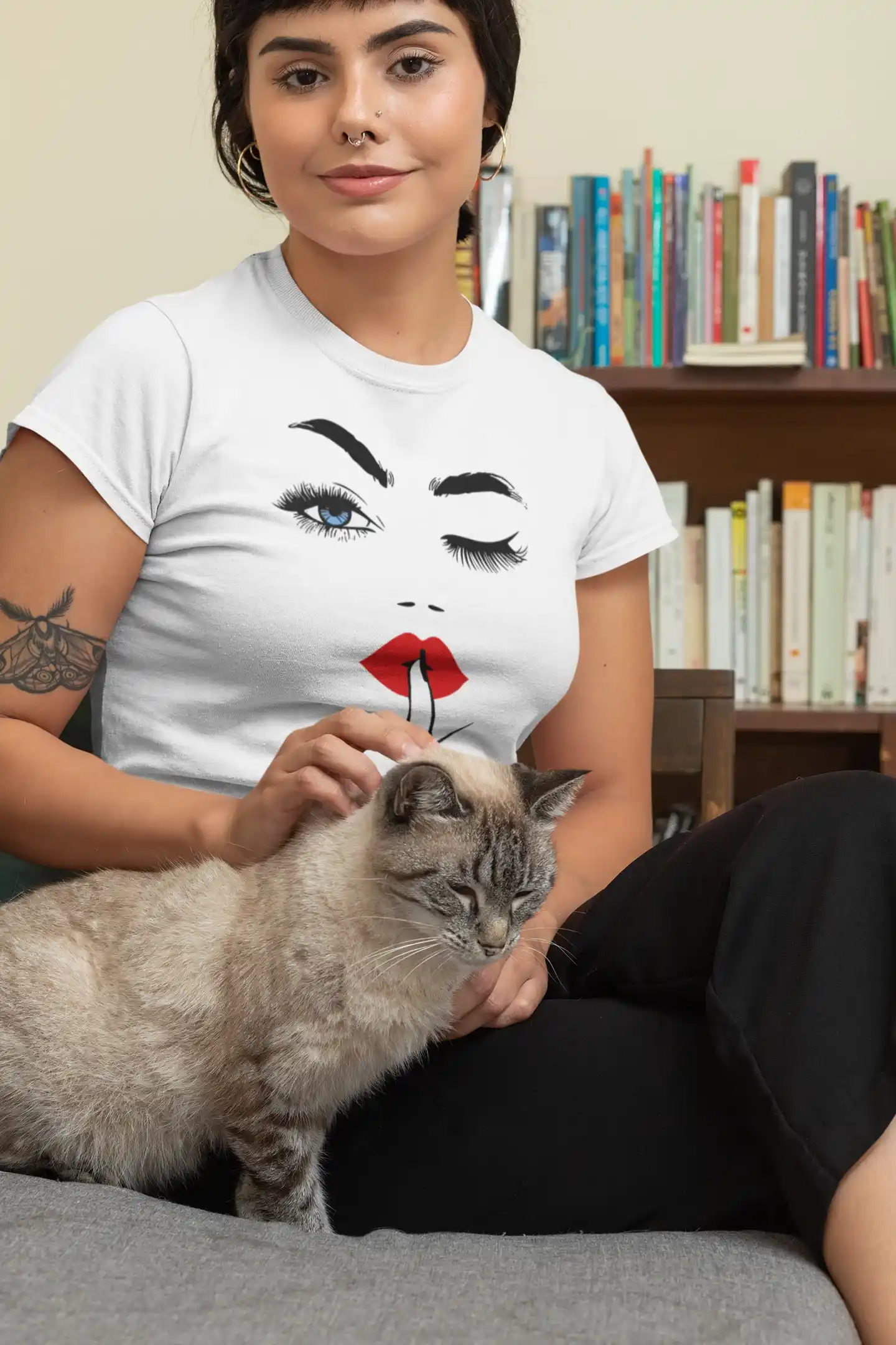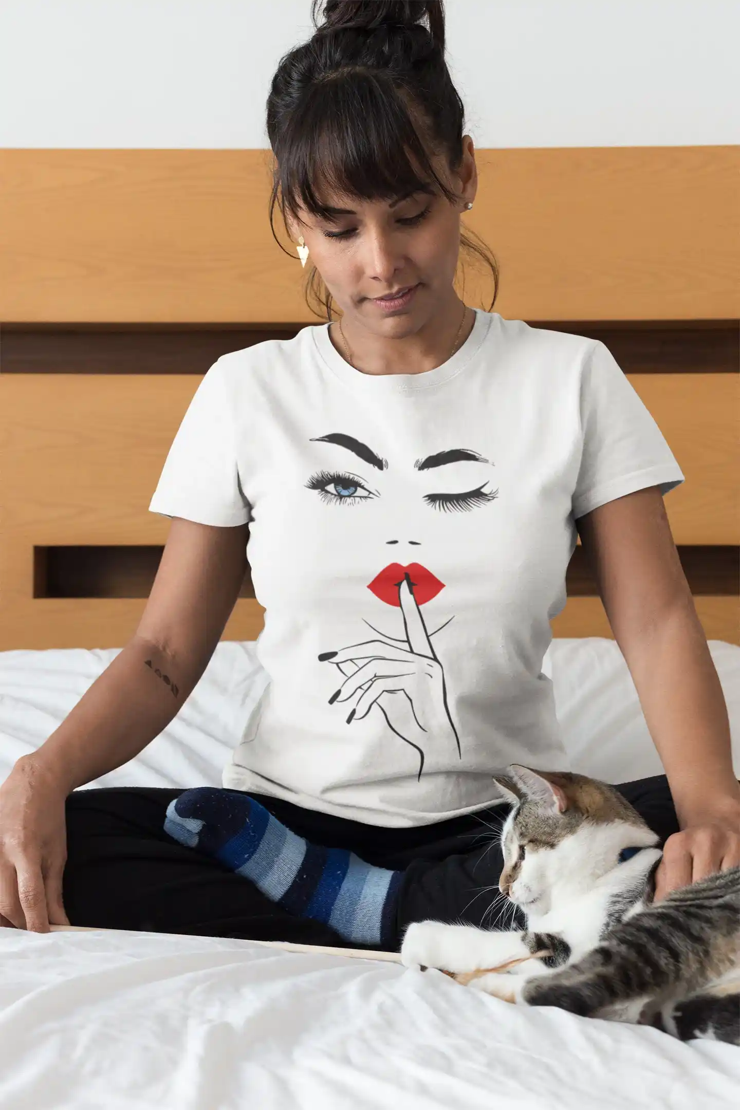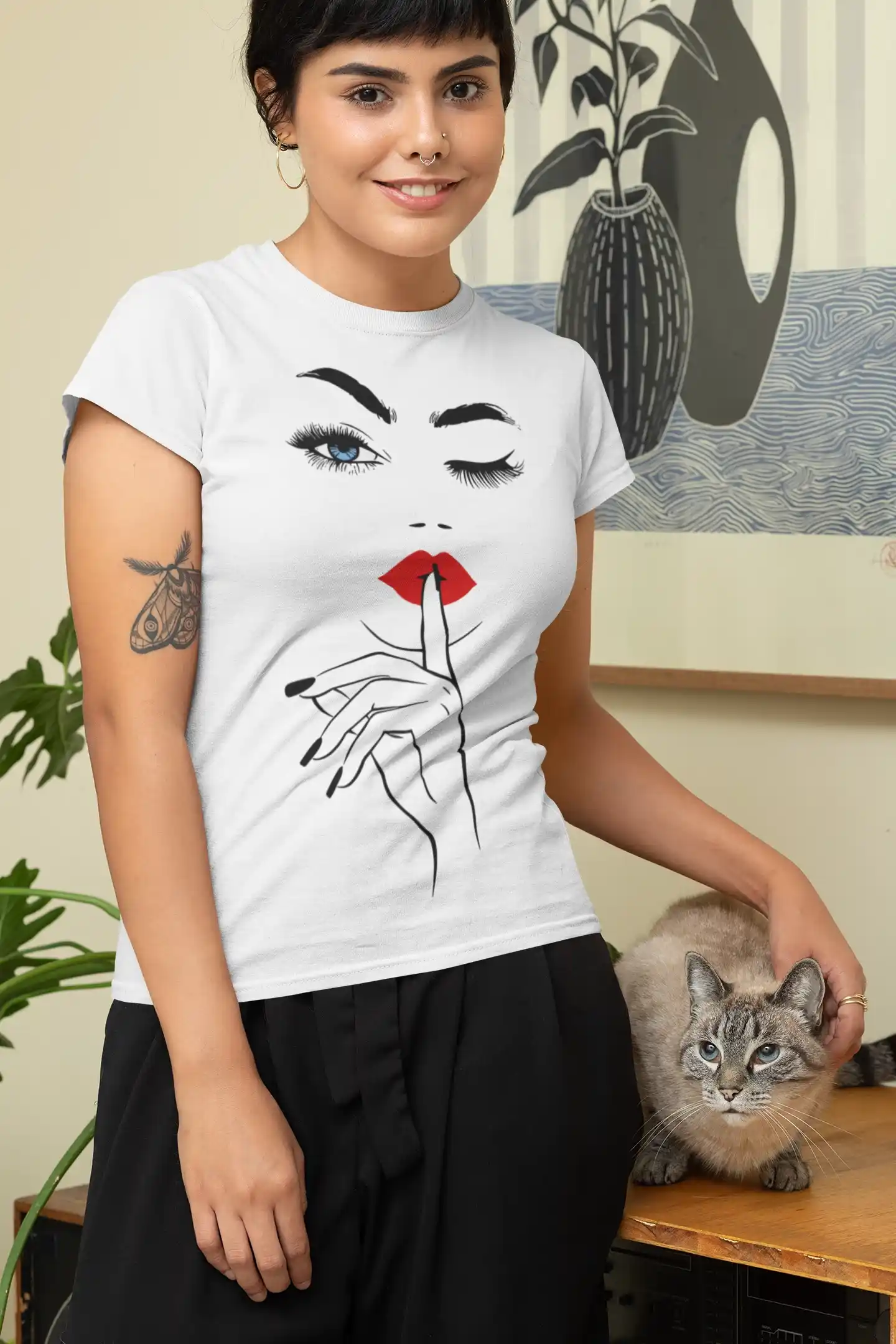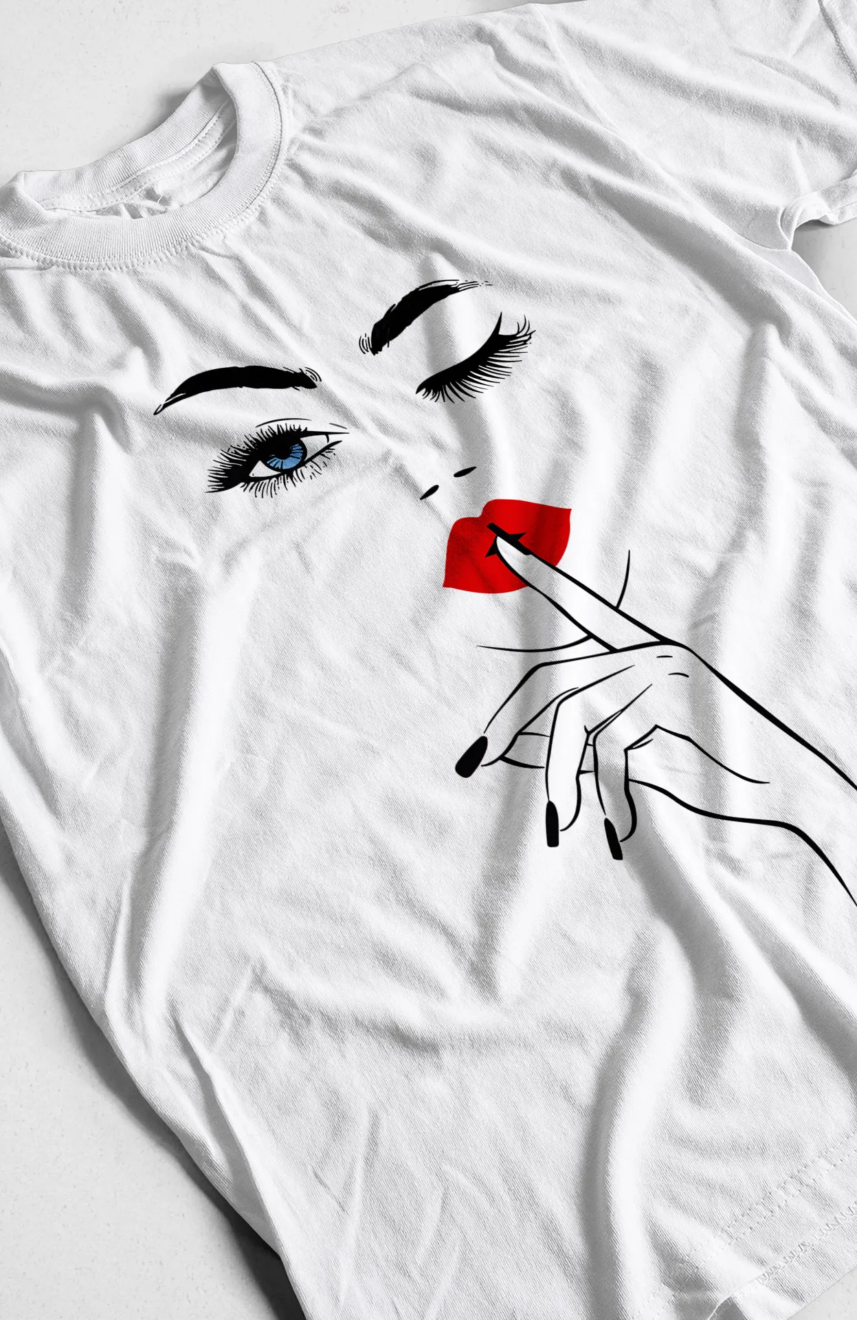 Lo que hace única a esta camiseta es la audacia y el minimalismo de su diseño. A diferencia de los estampados comunes, este gráfico tiene una elegancia y un simbolismo que lo hacen especial. La combinación del guiño, los labios rojos y el gesto de silencio crea una narrativa visual que invita a la interpretación, haciendo que la prenda sea una pieza de conversación. Es ideal para quienes buscan ropa que no solo se vea bien, sino que también refleje su personalidad enigmática y segura de sí misma.