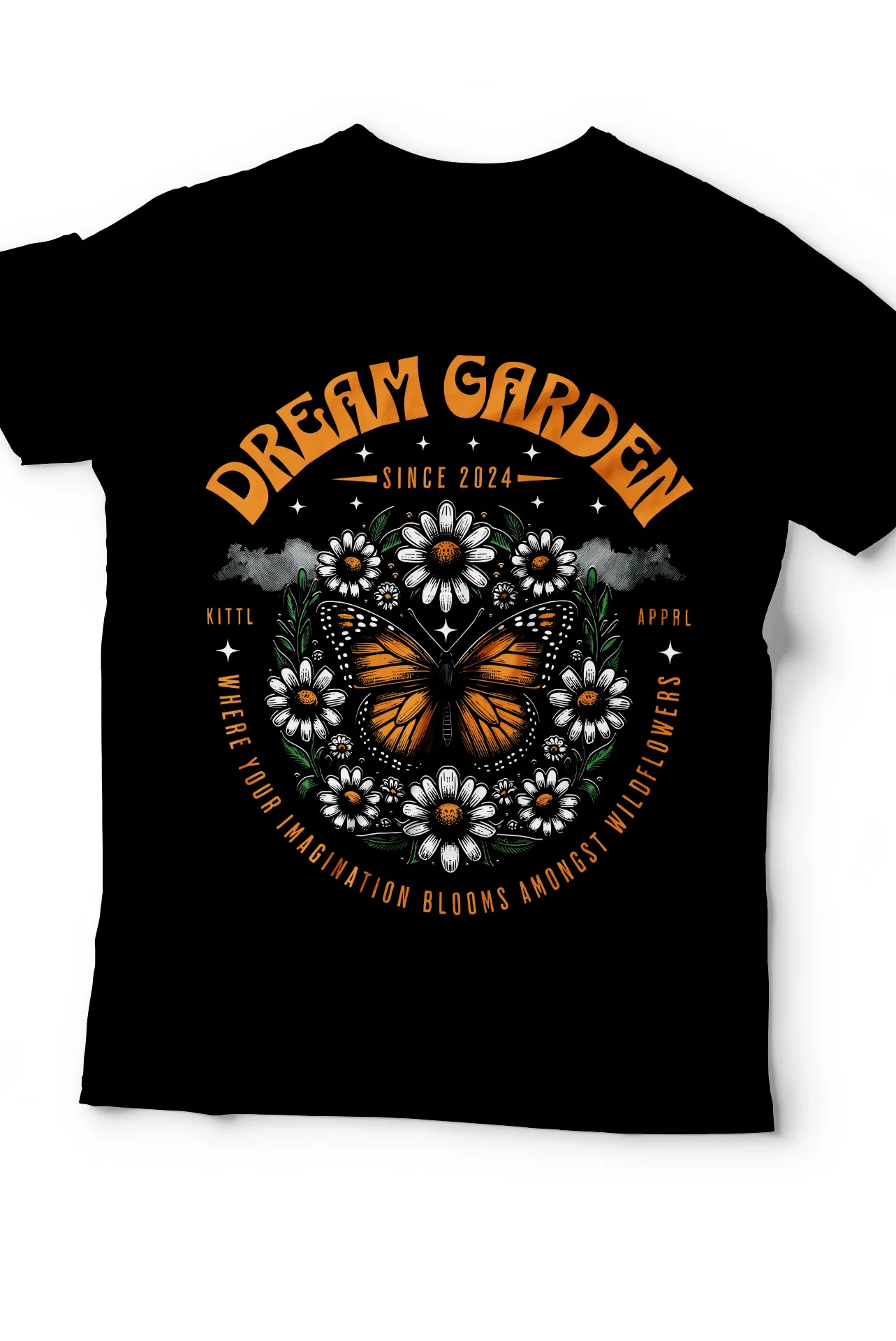 | Estampado | Mariposa monarca y margaritas con la frase "Dream Garden" |