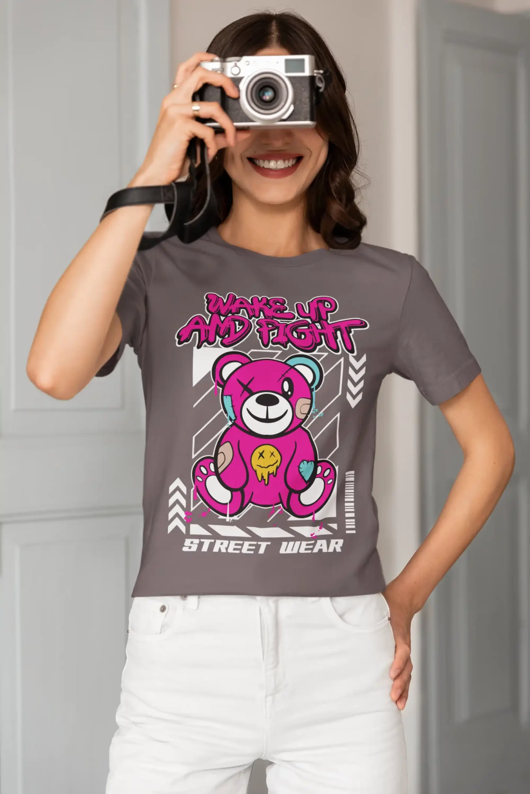 Adopta un estilo que desafía lo convencional con nuestra camiseta de inspiración urbana. Esta prenda es una mezcla única de lo tierno y lo rebelde, presentando un osito de peluche con parches y una sonrisa "dañada", complementado con la frase "WAKE UP AND FIGHT". Los gráficos en zigzag y los códigos de barras añaden una estética streetwear inconfundible. Es la elección perfecta para quienes no temen destacar y expresar su actitud.