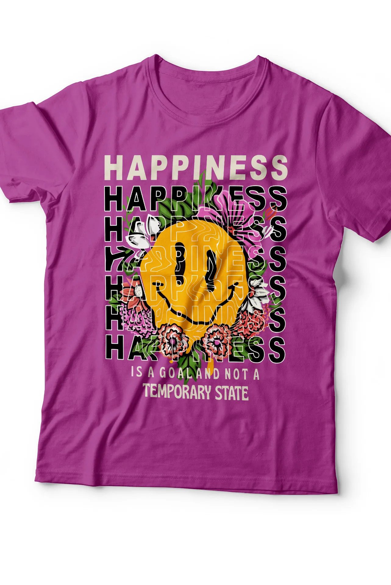 Adopta una actitud positiva y un estilo inconfundible con nuestra camiseta de estilo urbano. Esta prenda va más allá de un simple estampado: es un manifiesto de alegría y perseverancia. El vibrante diseño de un smiley transformado, con sus ojos llenos de flores, y la poderosa frase "HAPPINESS IS A GOAL AND NOT A TEMPORARY STATE" te invitan a llevar la felicidad como un objetivo de vida. Es la elección perfecta para quienes desean infundir su look con energía y optimismo.