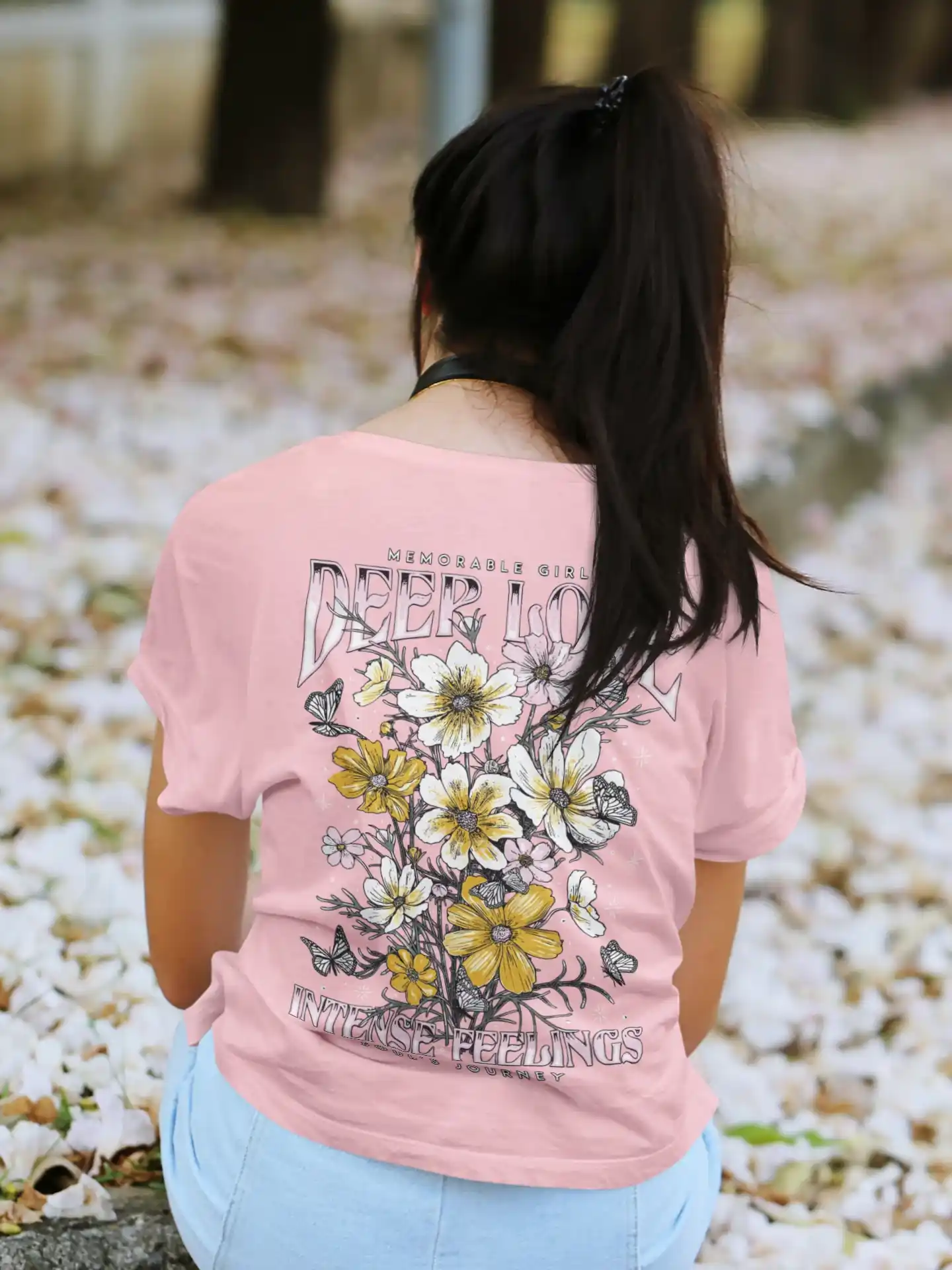 Lleva tus sentimientos más profundos en la espalda con nuestra exclusiva camiseta de "Deep Love". Esta prenda es un lienzo de estilo y emoción, con un diseño que presenta un ramo de flores silvestres que evoca una sensación de paz y tranquilidad. Las frases "MEMORABLE GIRL" (Chica memorable), "DEEP LOVE" (Amor profundo) e "INTENSE FEELINGS" (Sentimientos intensos) añaden un toque de poesía y misticismo. Es la elección perfecta para quienes aprecian la moda con un toque de arte, un estilo soñador y un mensaje de calma.