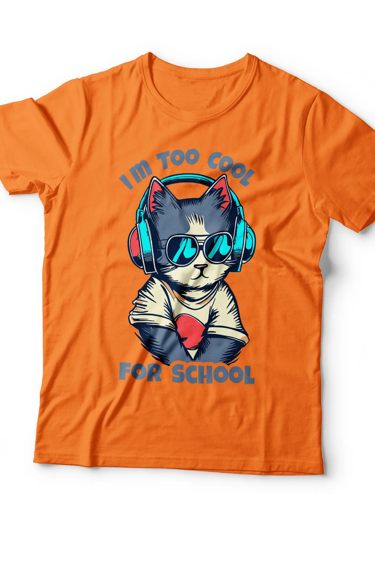 Lleva el estilo y la actitud a tu guardarropa con esta camiseta única. El diseño central presenta un gato con gafas de sol, audífonos y un corazón, con la frase "I'm Too Cool for School" en la parte inferior. Esta prenda es ideal para quienes aman a los gatos y un estilo de vida divertido y despreocupado. Perfecta para el día a día, esta camiseta se adapta a cualquier ocasión, desde un día de clases hasta una tarde de juegos con amigos.
