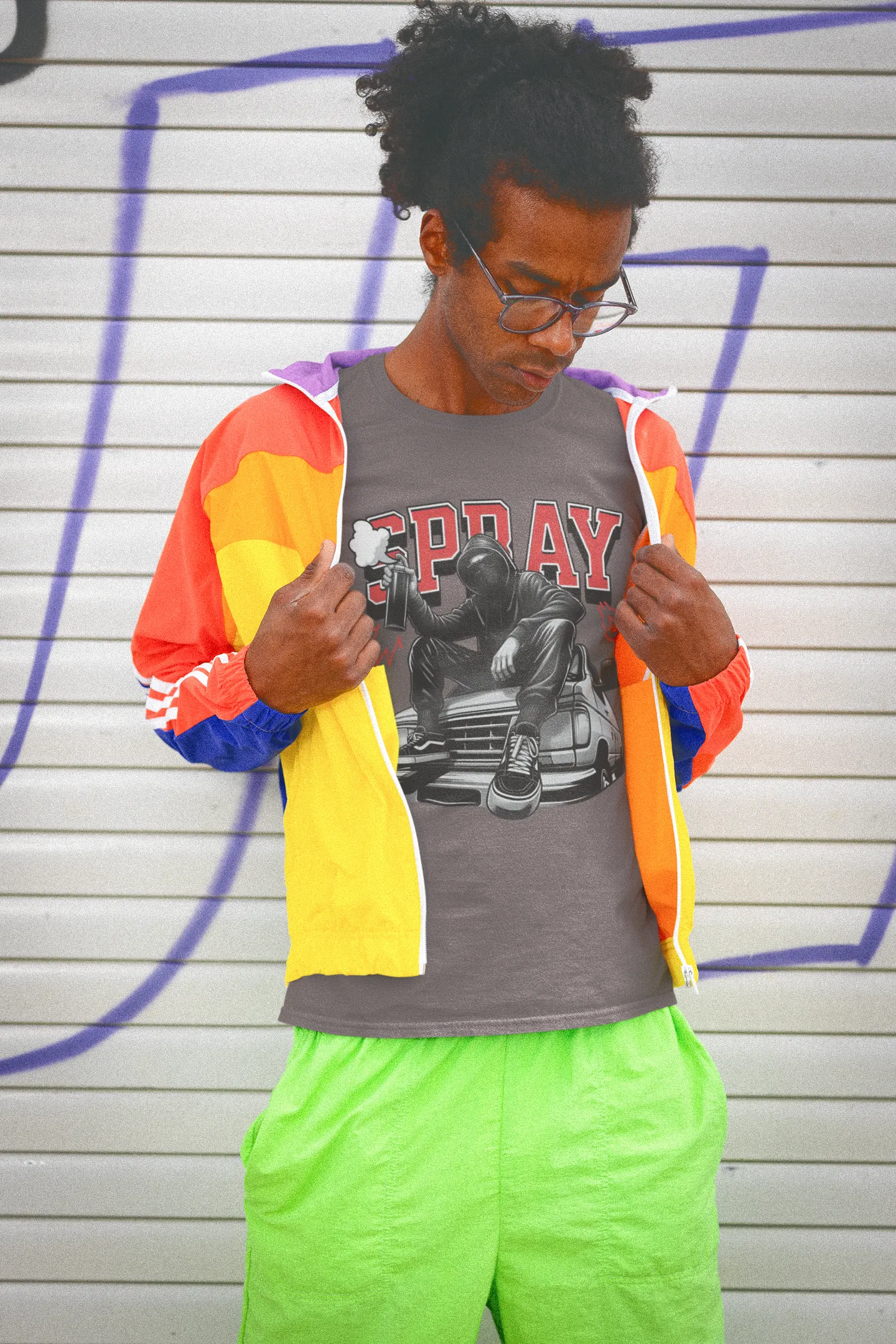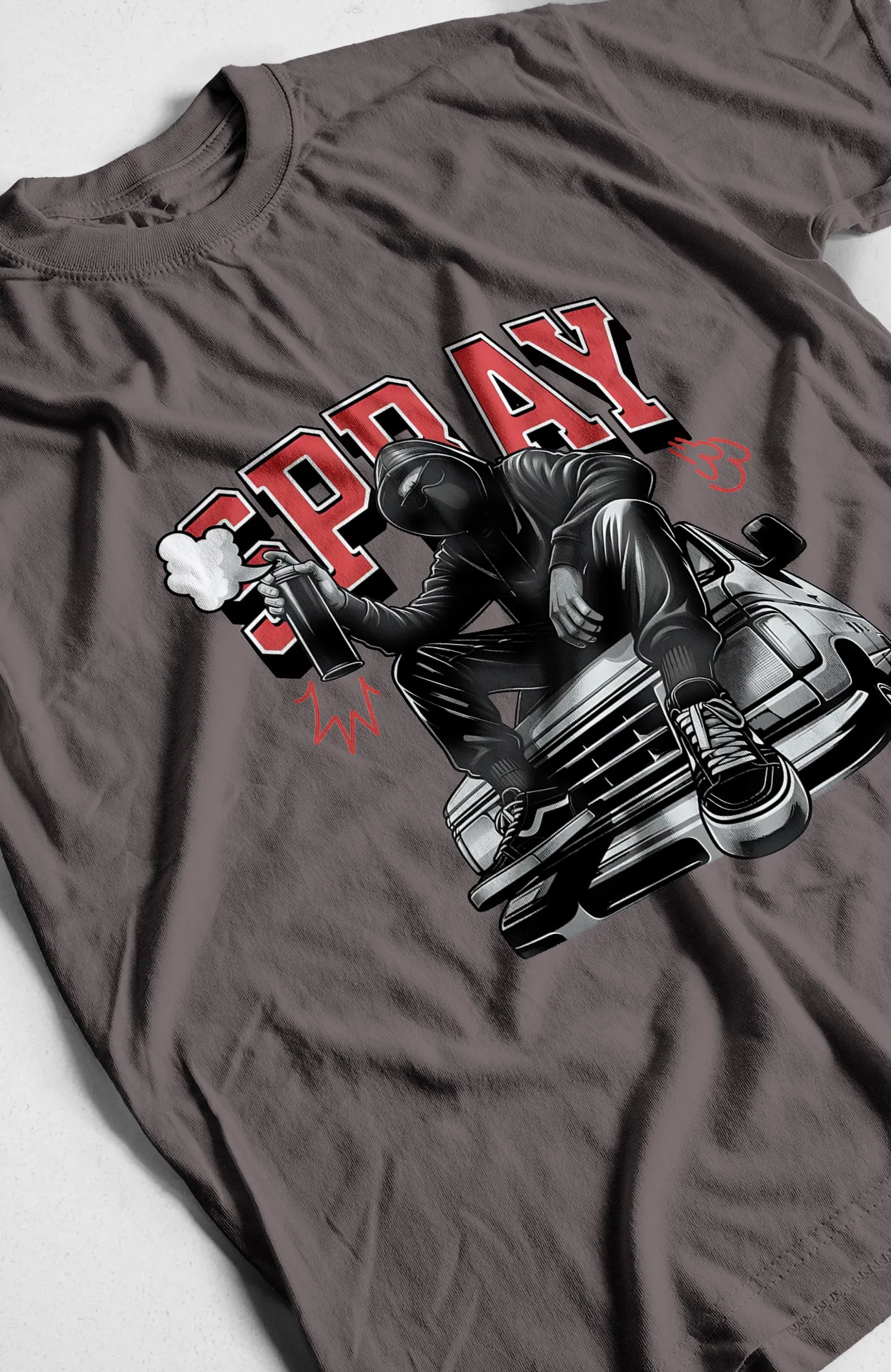 - Diseño: Estampado frontal de un artista de graffiti con un bote de spray, con la leyenda "SPRAY" en tipografía de bloques.
