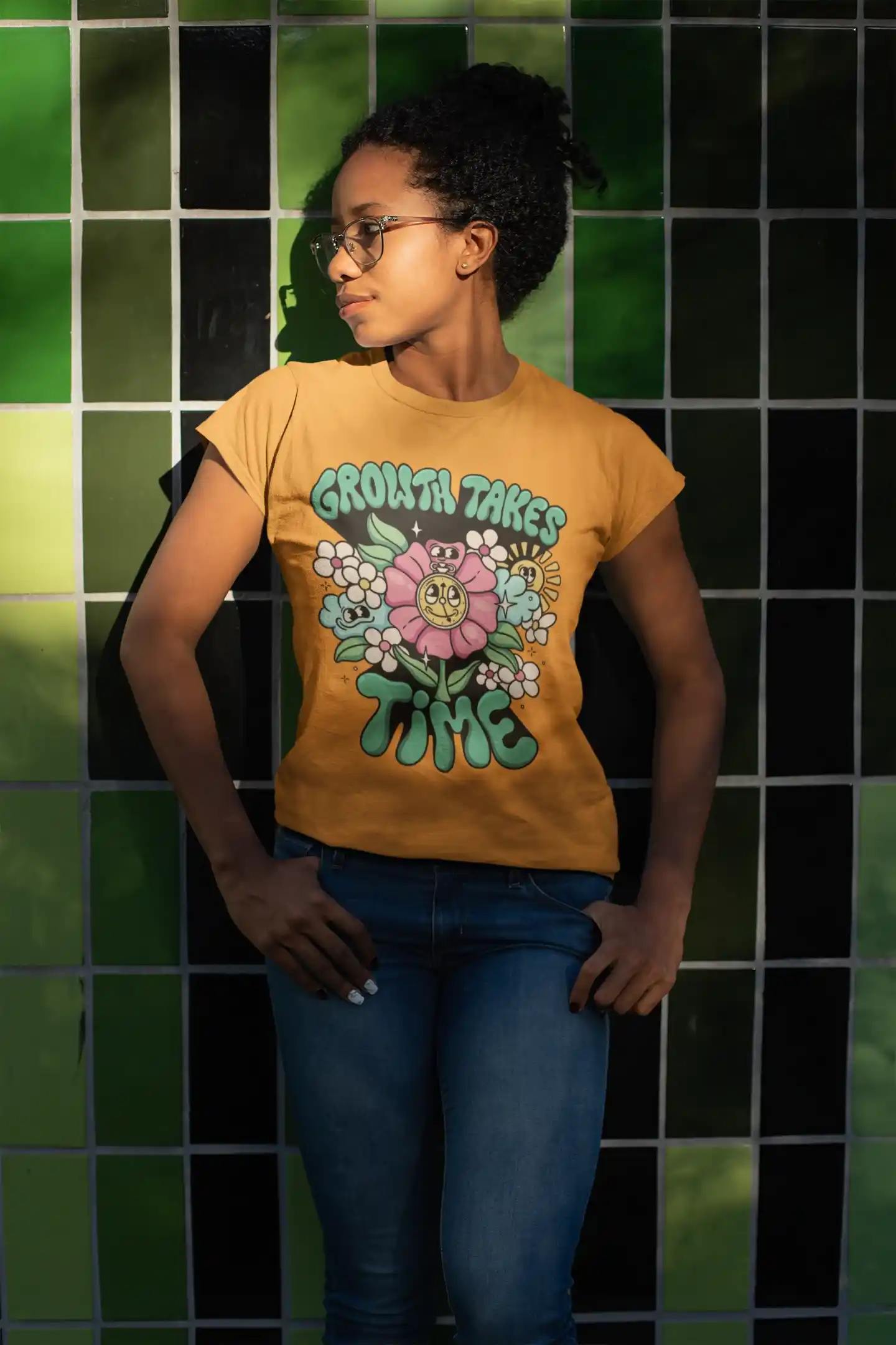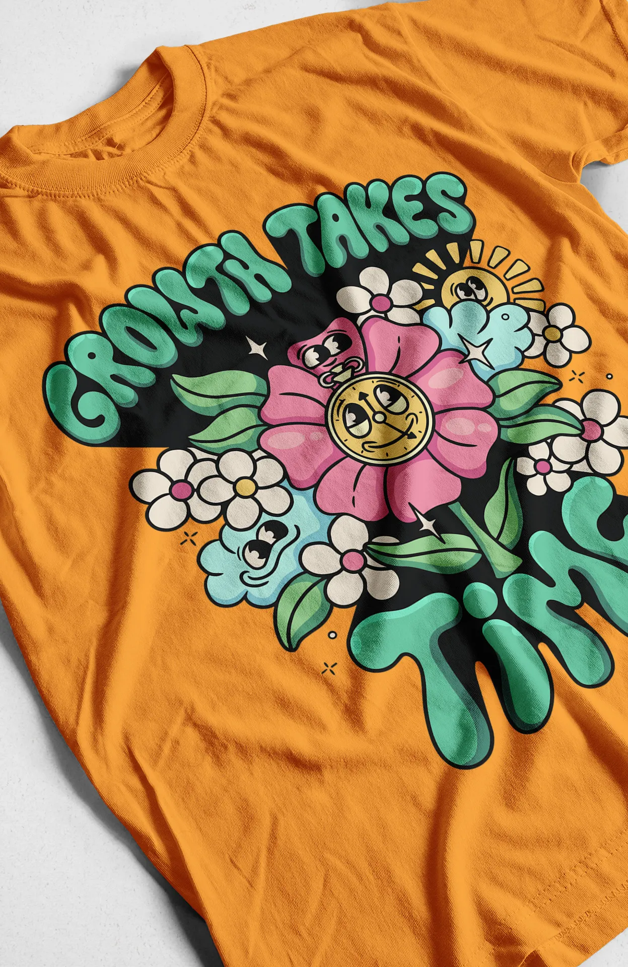 Abraza el proceso de la vida con nuestra exclusiva camiseta de "Growth Takes Time". Esta prenda es un lienzo de estilo retro que te invita a abrazar la paciencia y a confiar en el crecimiento personal. El diseño central, con una flor sonriente rodeada de nubes y soles con caras, evoca una estética de los años 70 que irradia buen rollo y positividad. La frase "GROWTH TAKES TIME" (El crecimiento toma tiempo) refuerza el mensaje de que los cambios importantes ocurren a su propio ritmo. Es la elección perfecta para quienes aprecian la moda con un toque de nostalgia y un mensaje profundo.