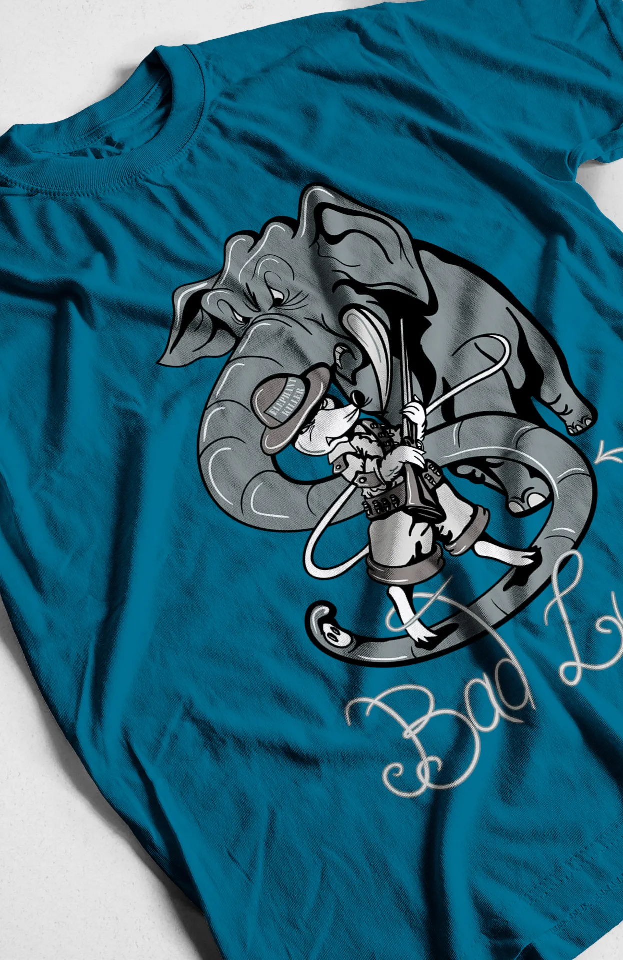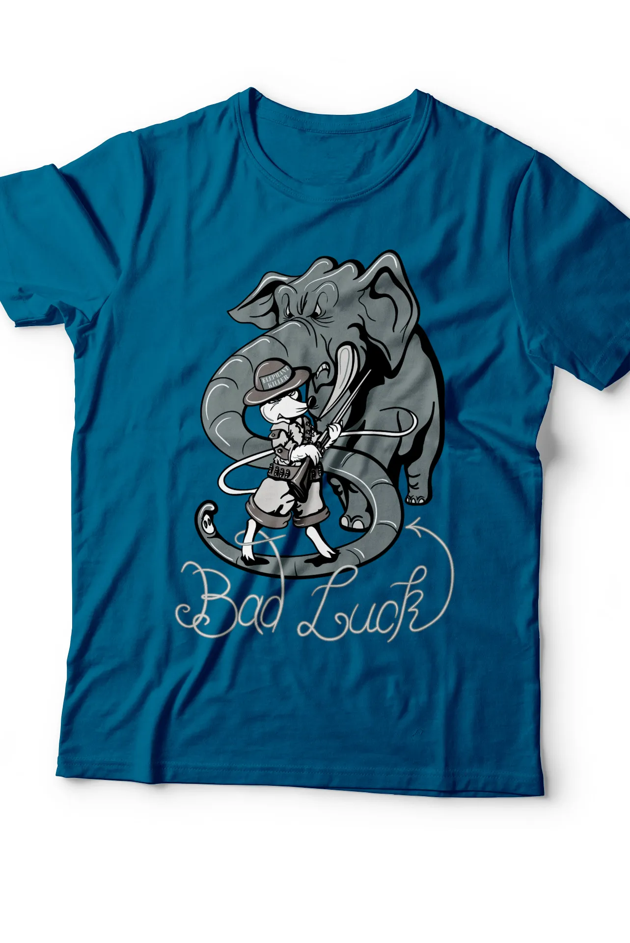 - Diseño Exclusivo: Estampado de un héroe montando un elefante con armadura y la frase "Bad Luck".