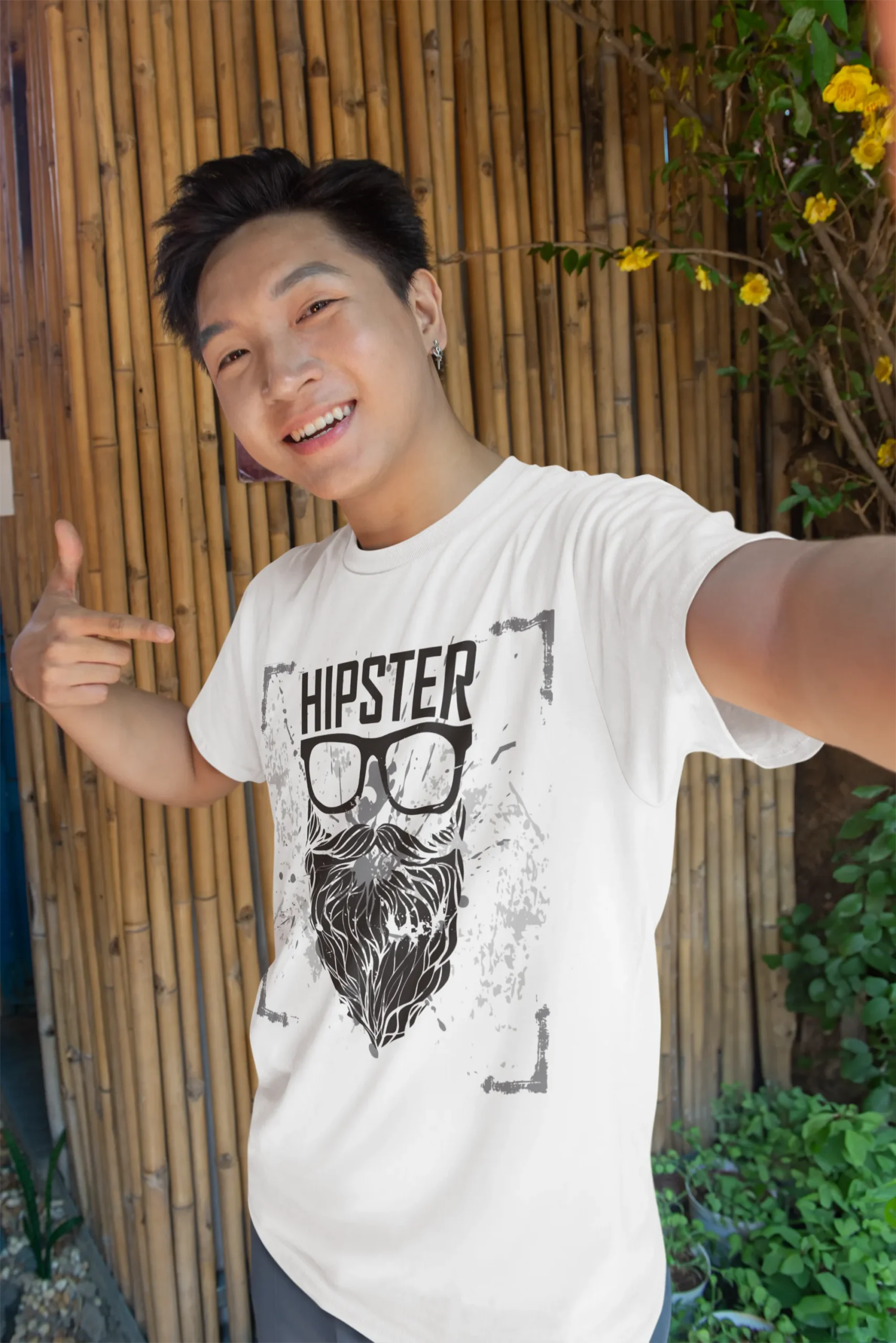 | Estampado | Barba larga y gafas con la frase "Hipster" en tipografía audaz |