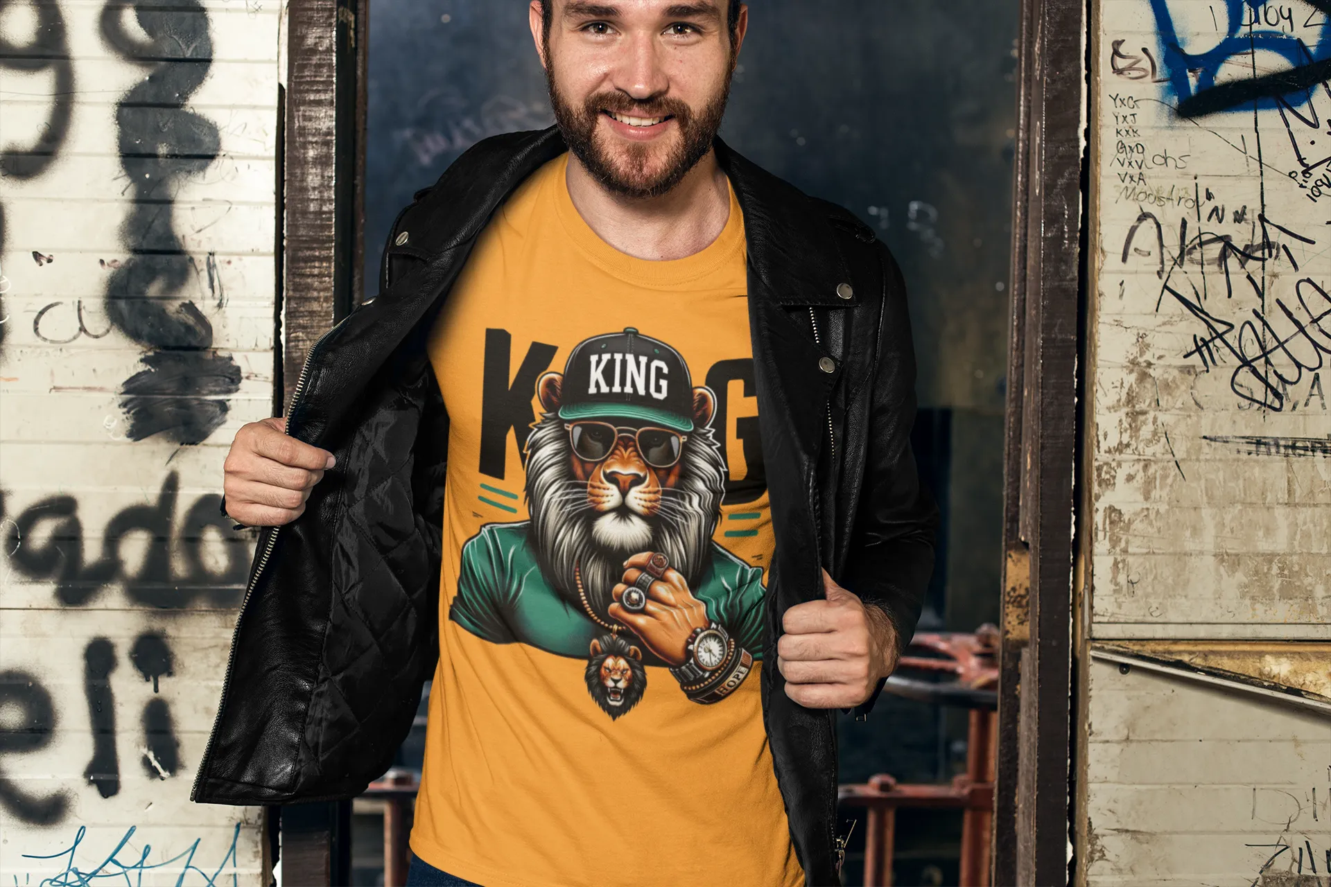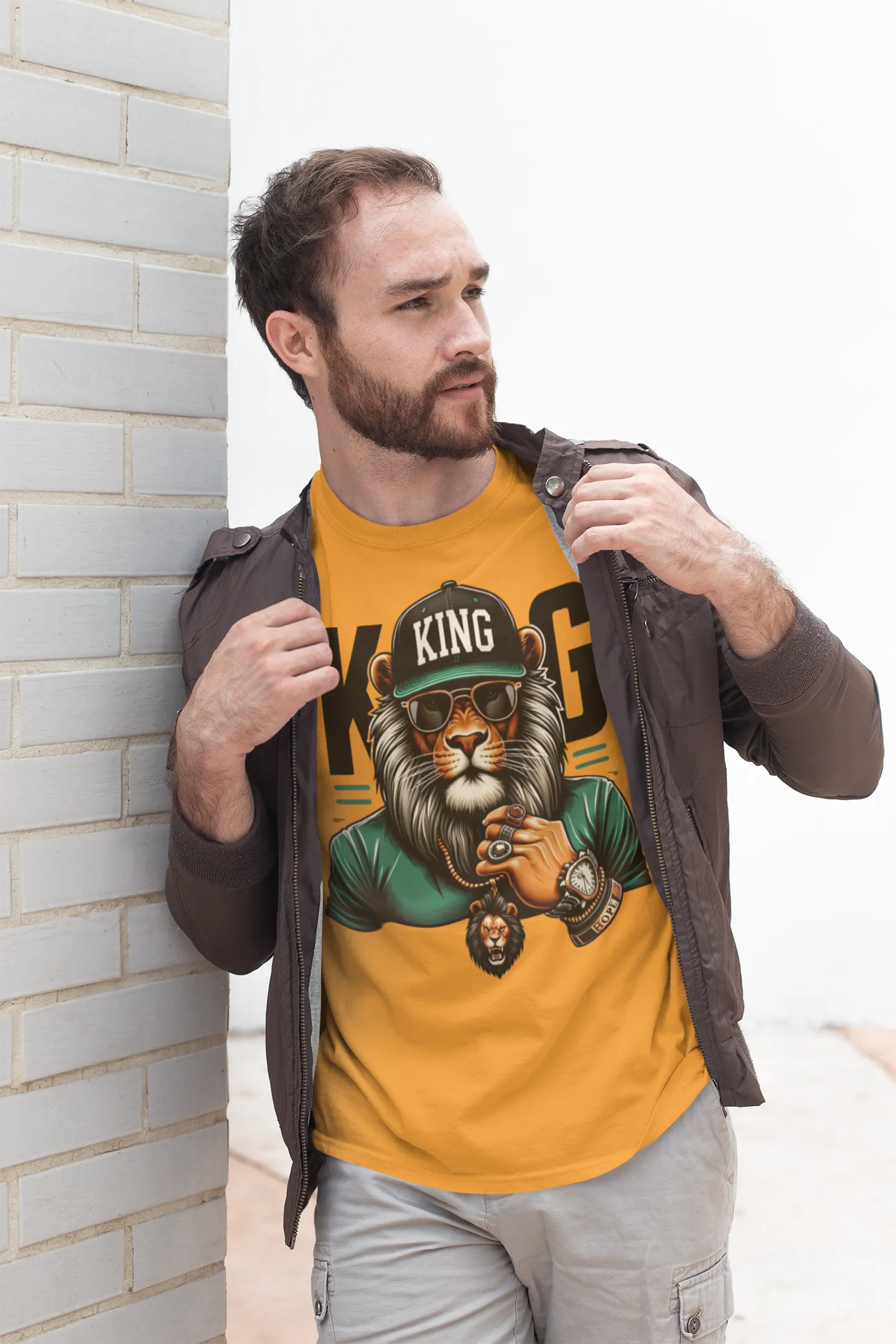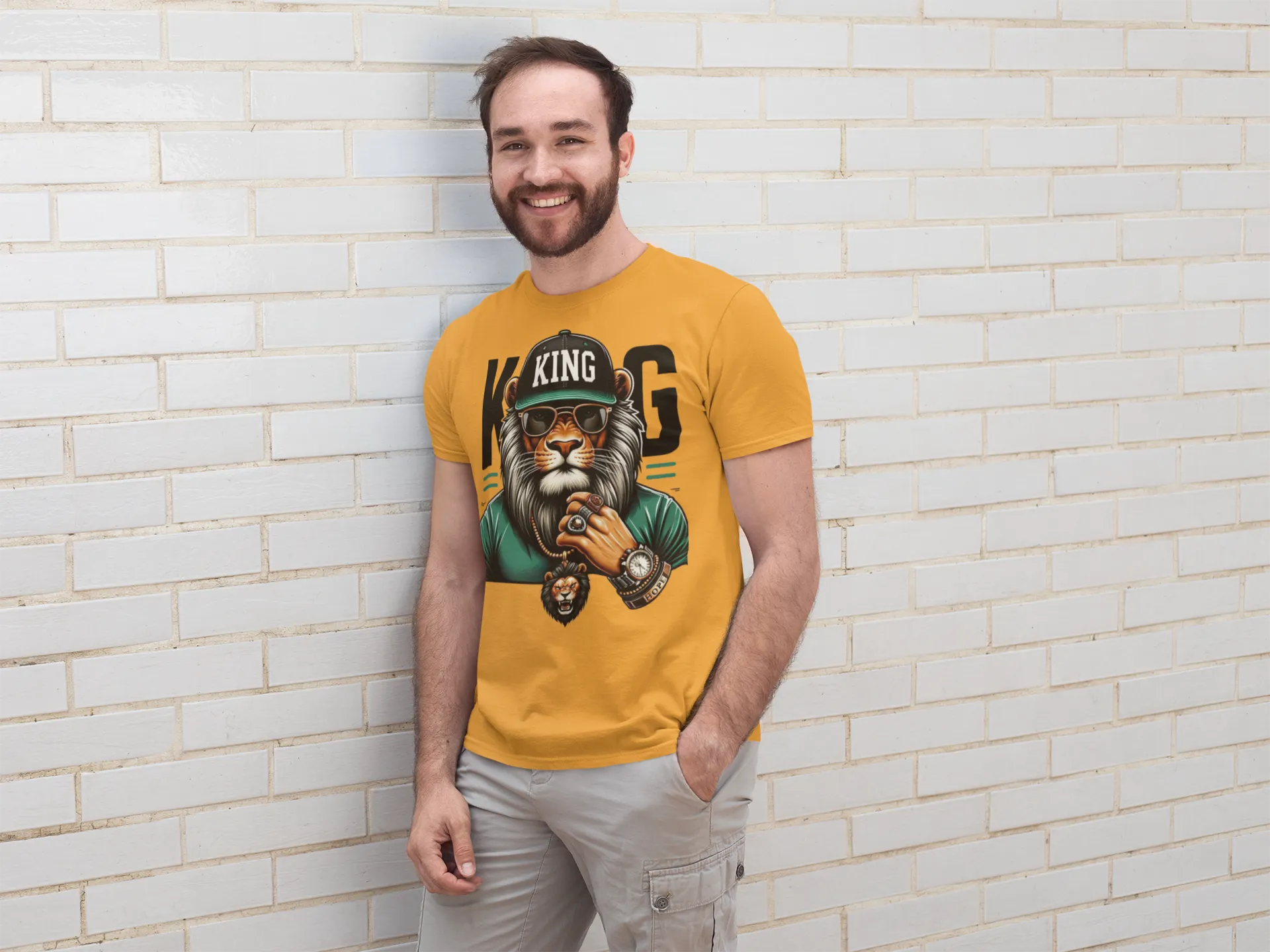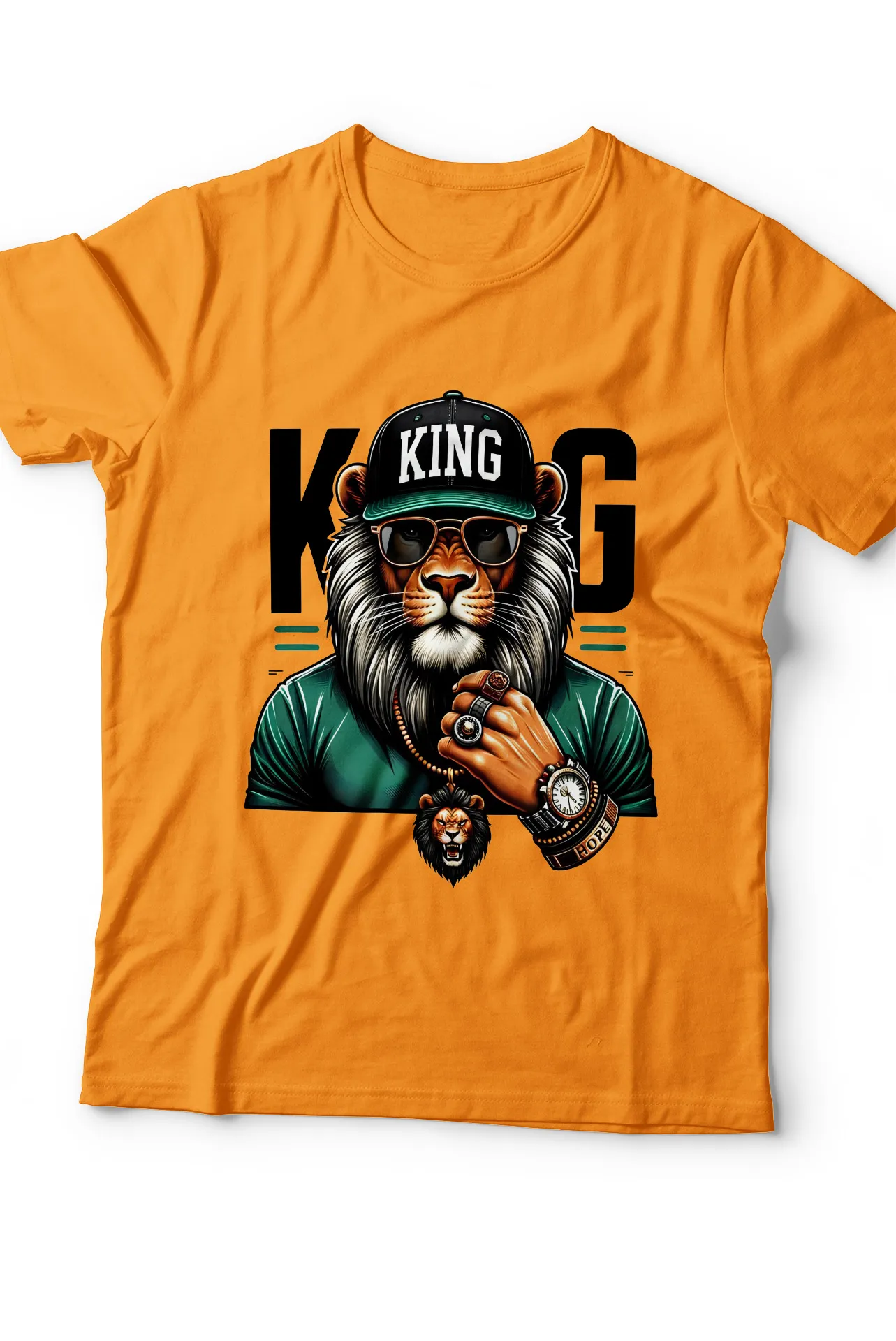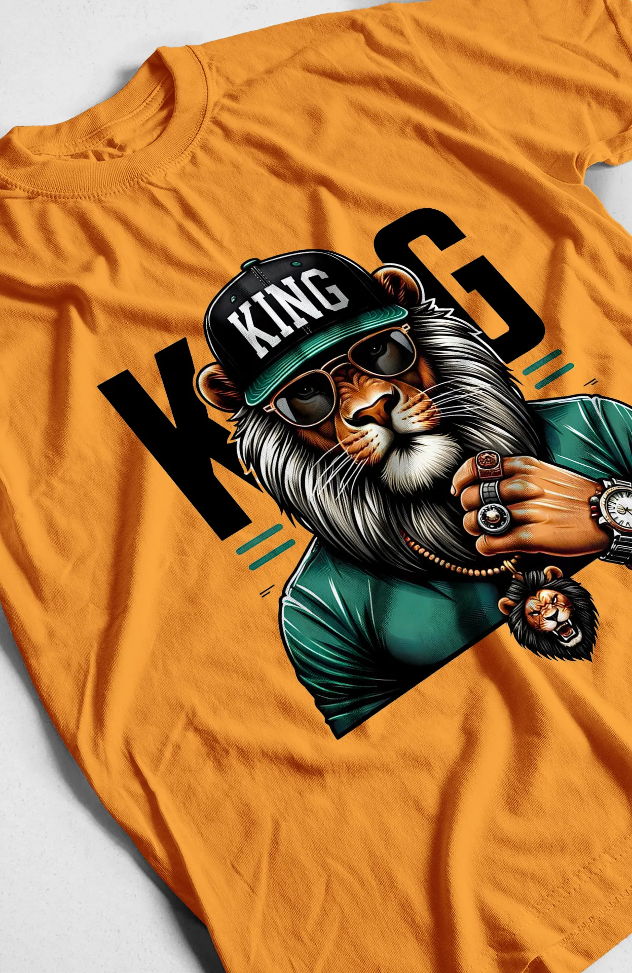 • Diseño: Estampado frontal de un león con gorra, gafas de sol, joyas y un reloj, con la leyenda "KING" en la gorra.
