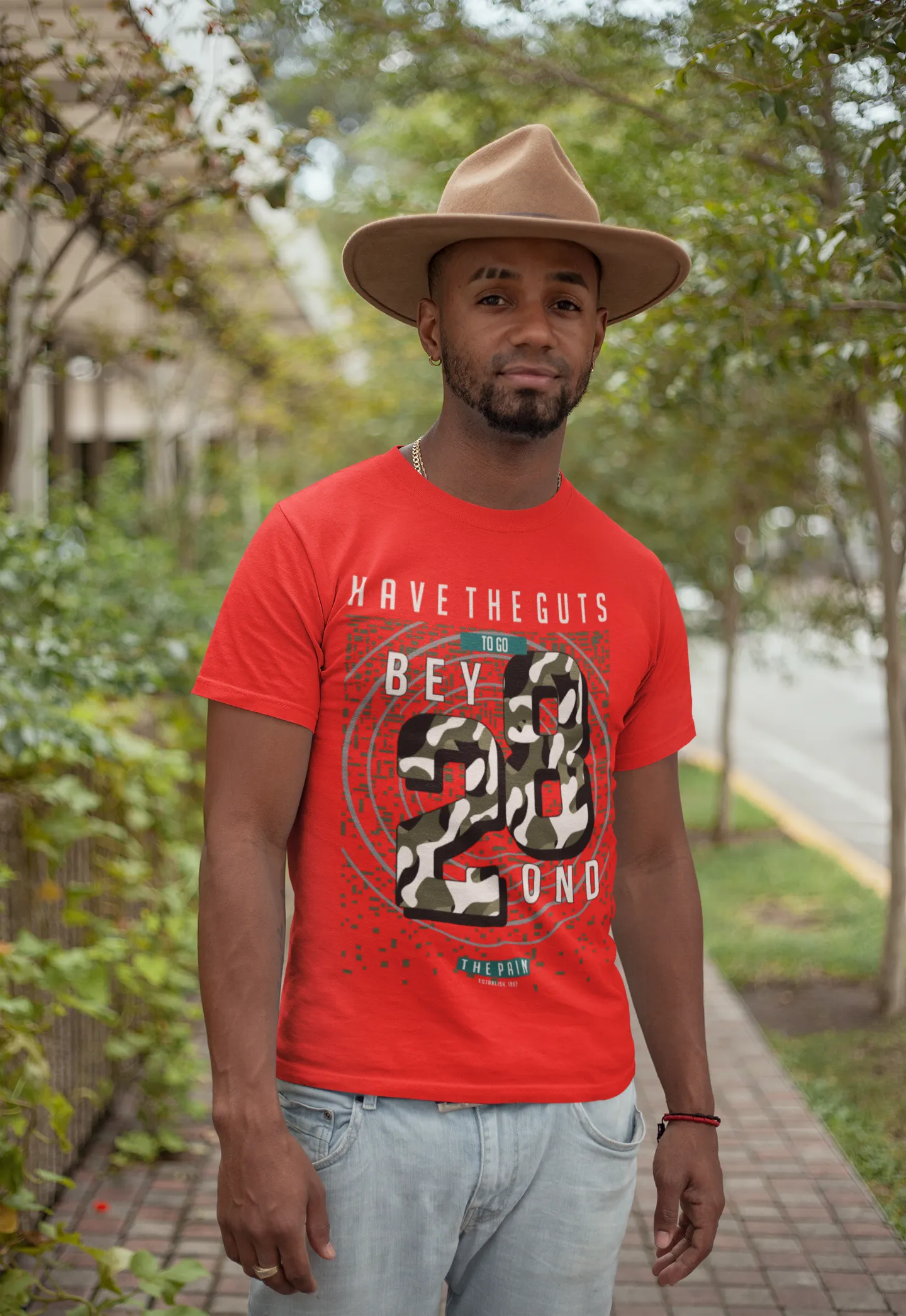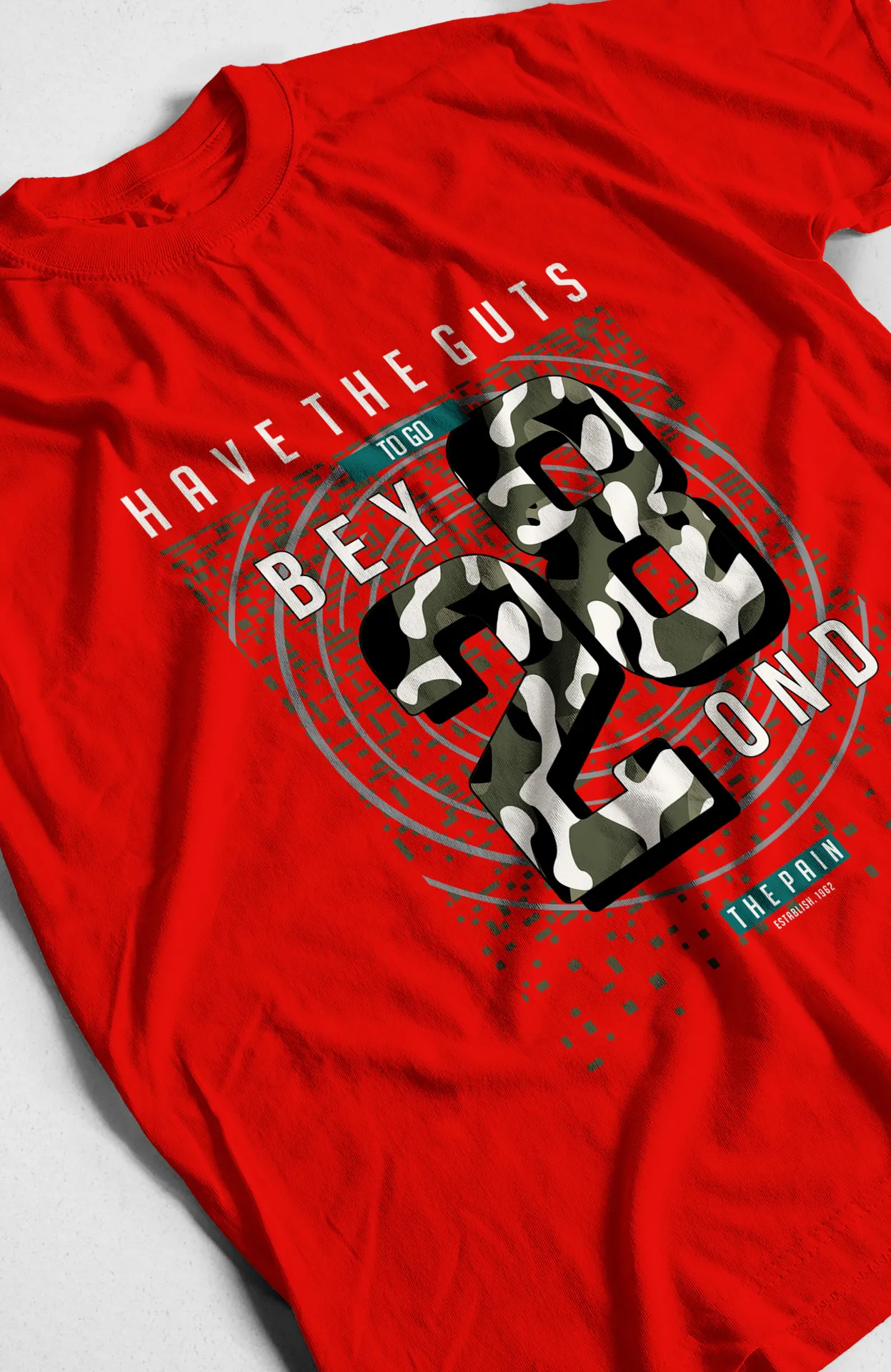 Rompe tus límites y atrévete a más con nuestra camiseta **"Have The Guts To Go Beyond"**. Este diseño inspirador presenta un mensaje claro y poderoso en una tipografía audaz y con un estampado de camuflaje. Es la prenda perfecta para quienes buscan un recordatorio visual de su valentía y su capacidad para superar cualquier desafío. Ideal para atletas, aventureros y cualquiera que crea en el poder de la mente para lograr la grandeza.