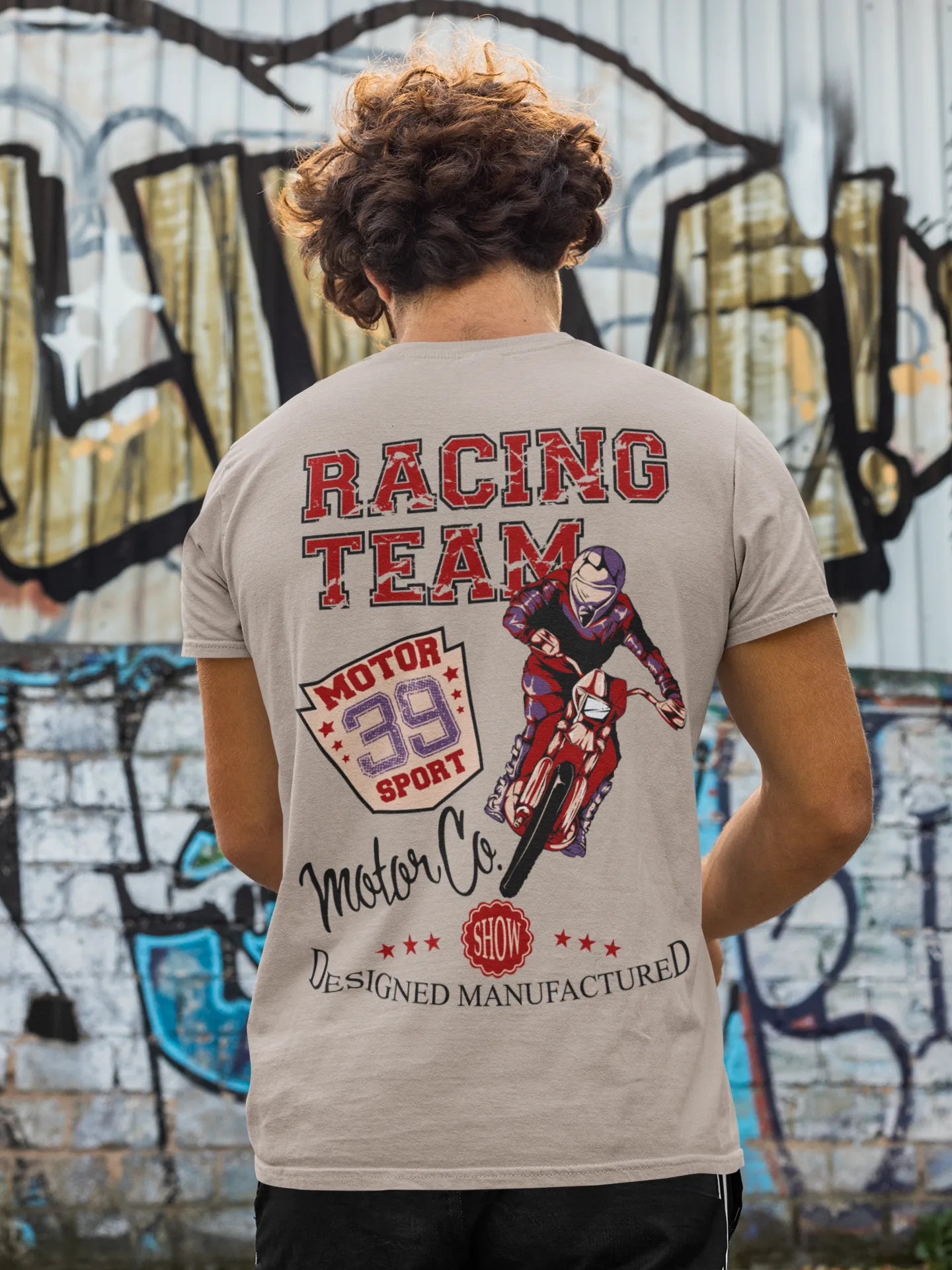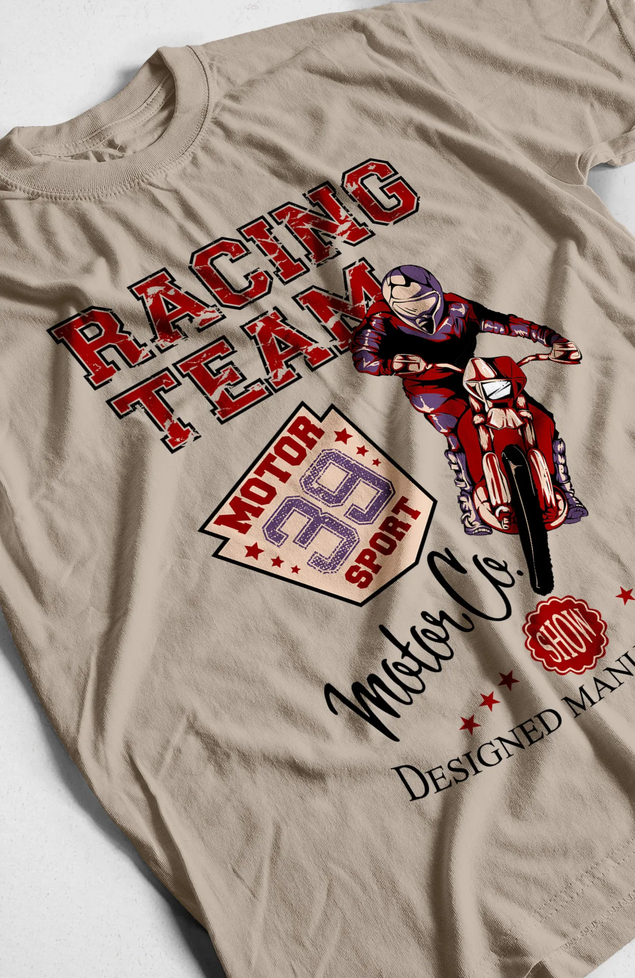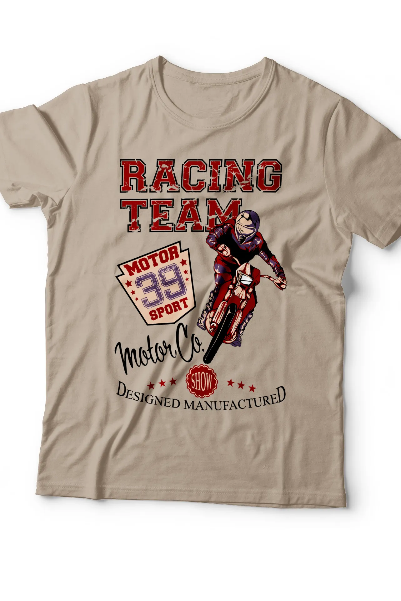 | Estampado | Motociclista con tipografía audaz y la frase "Racing Team Motor Co." |