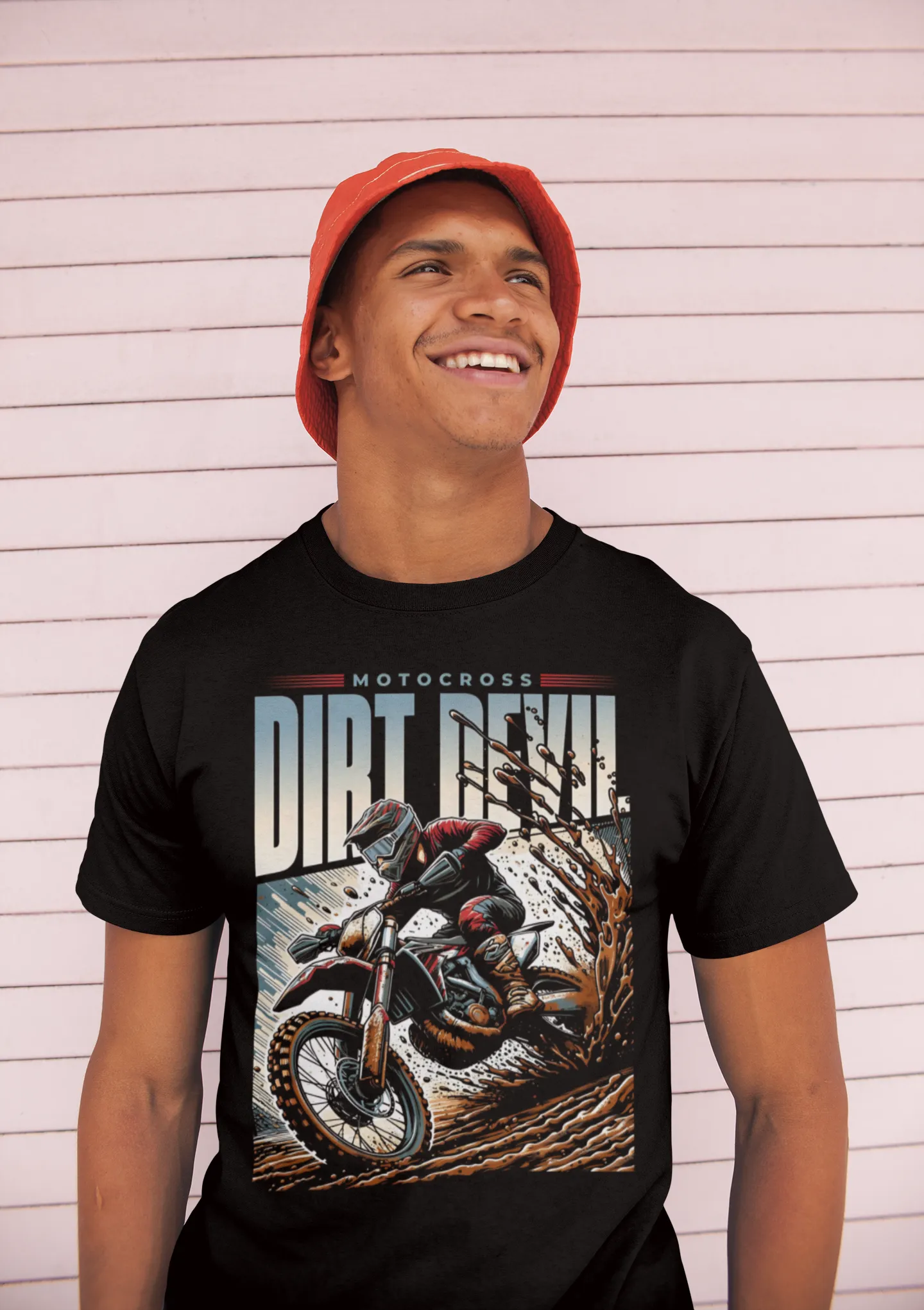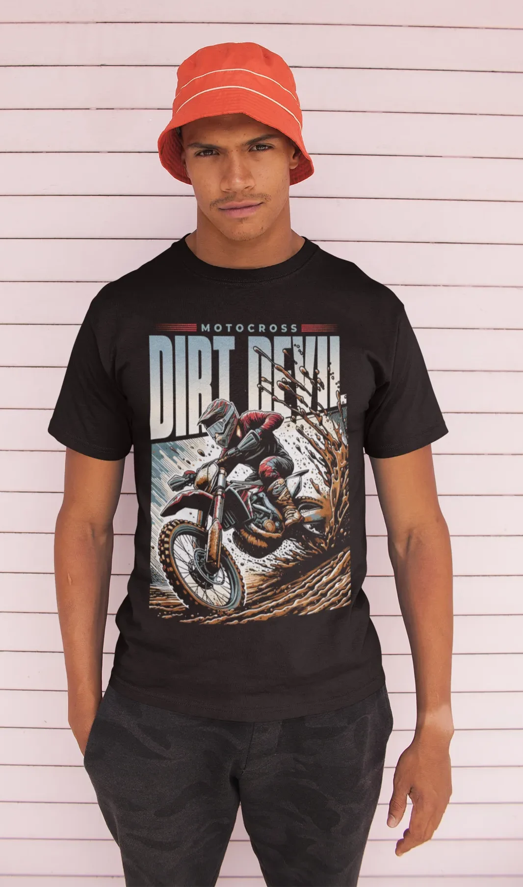 Siente la adrenalina del off-road con nuestra camiseta **"Dirt Devil"**. Con un gráfico dinámico de un motociclista en plena acción, levantando tierra y lodo, esta prenda es un tributo a la emoción y la valentía del motocross. Ideal para los amantes de la velocidad y los deportes extremos, esta camiseta es una declaración de estilo y pasión por la aventura.