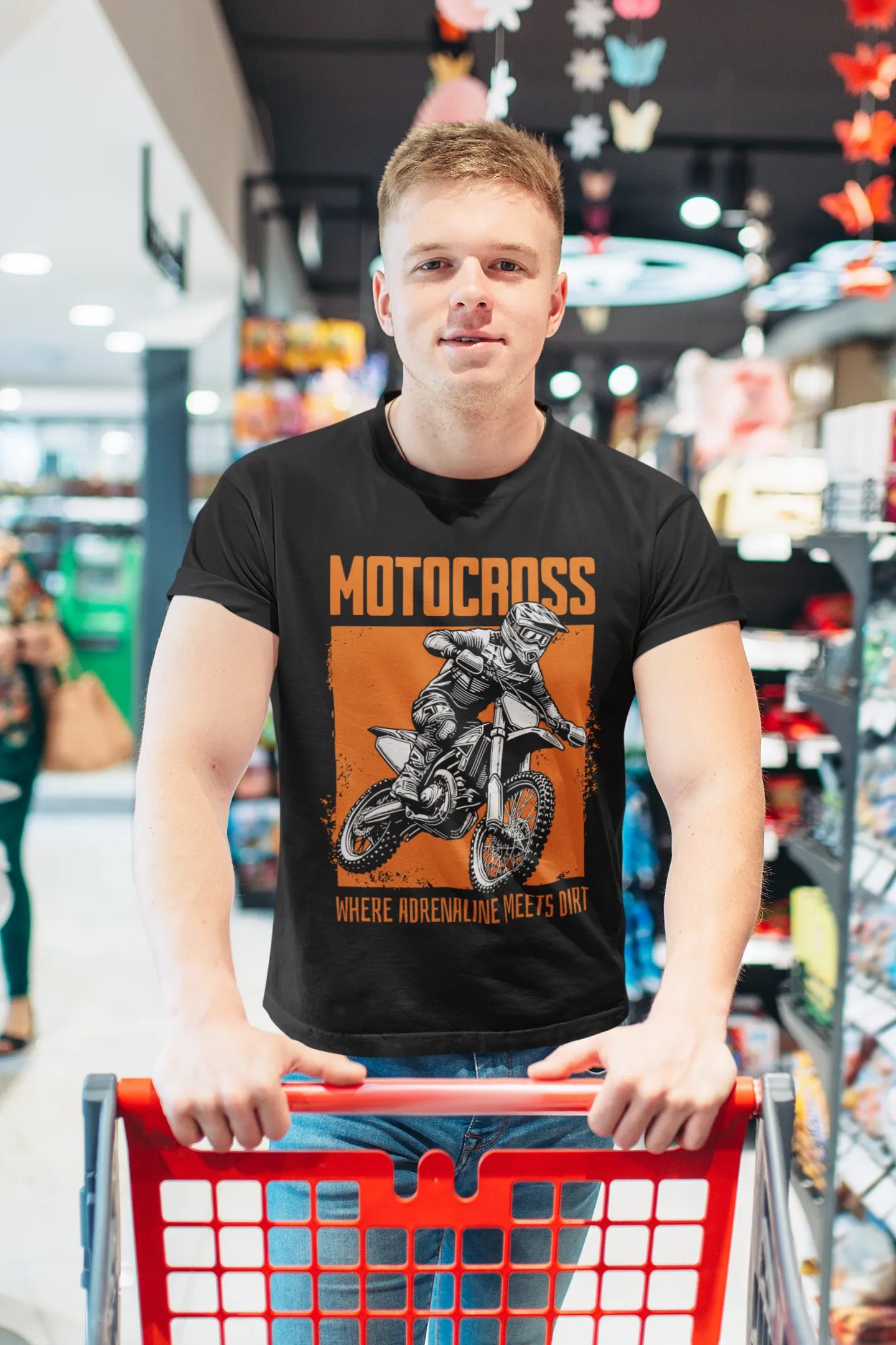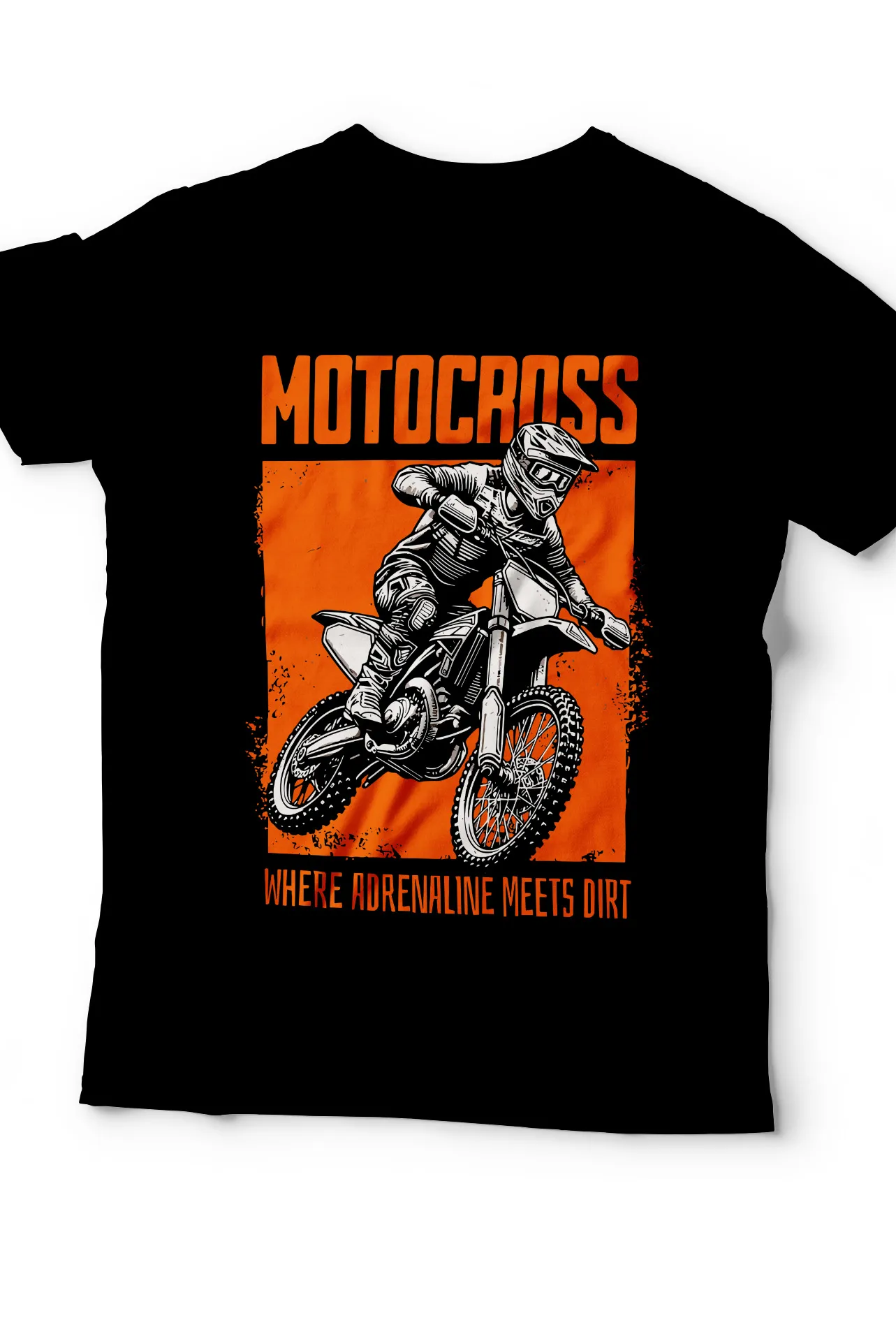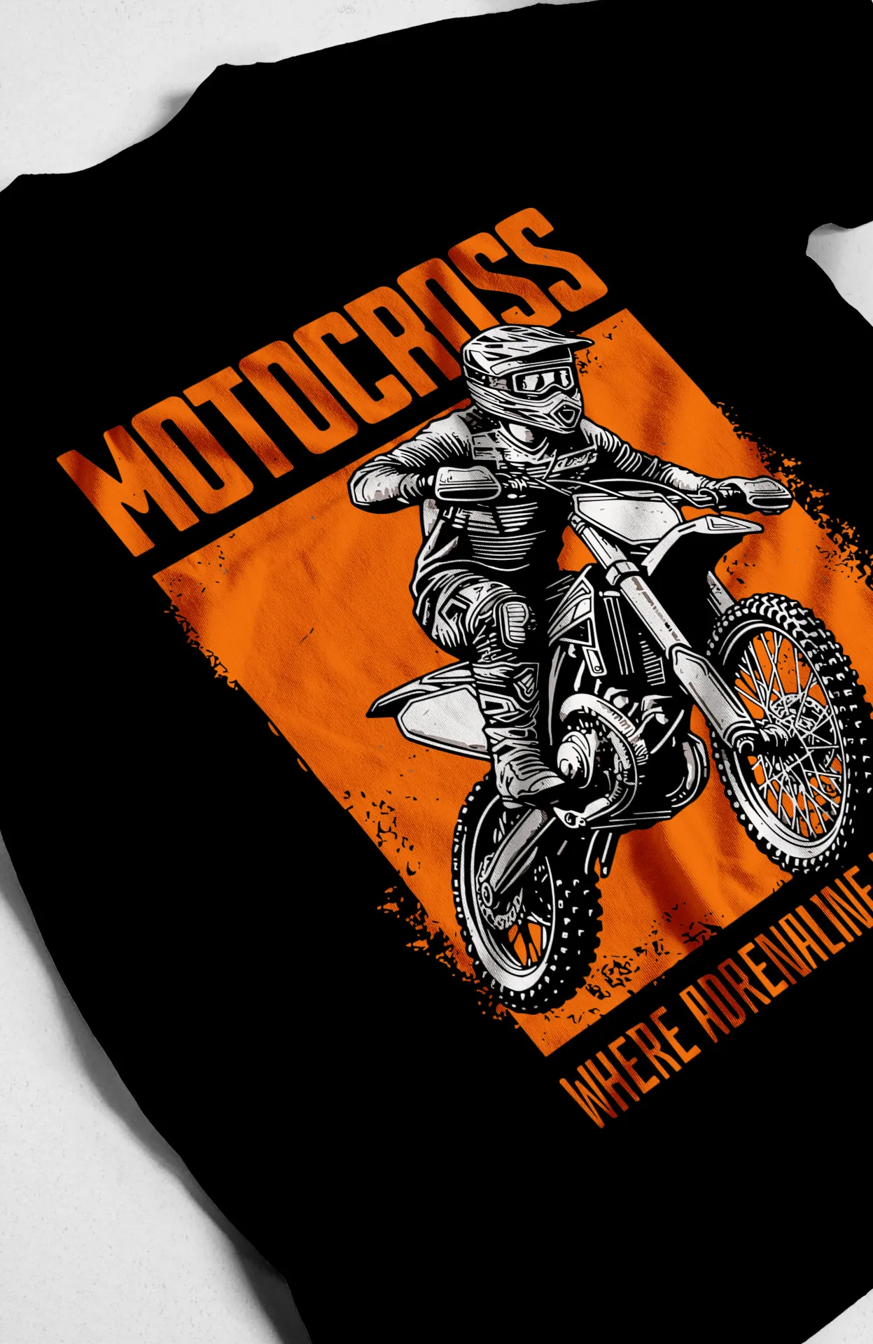 - Diseño: Estampado frontal de un motociclista en un fondo de color, con las leyendas "MOTOCROSS" y "WHERE ADRENALINE MEETS DIRT".