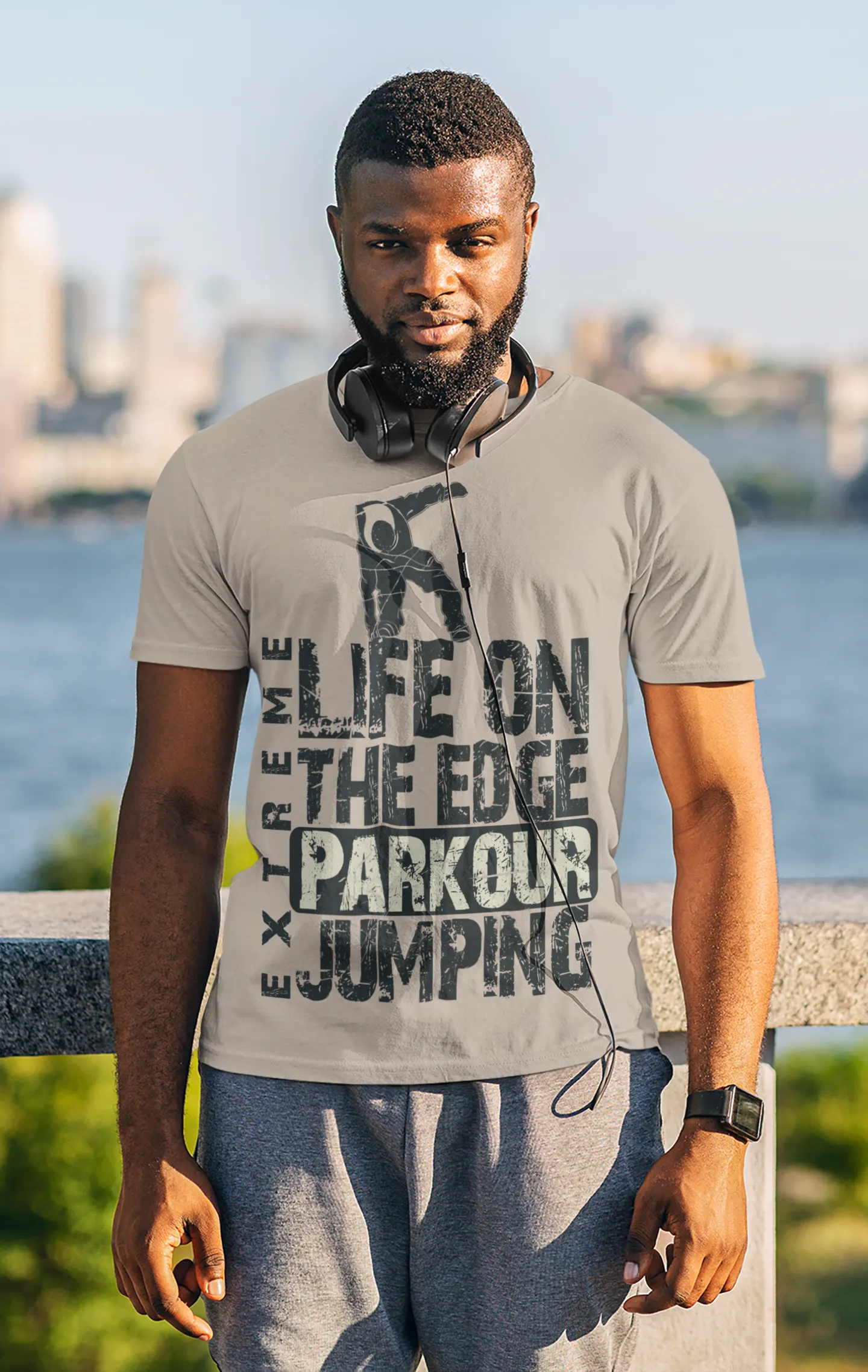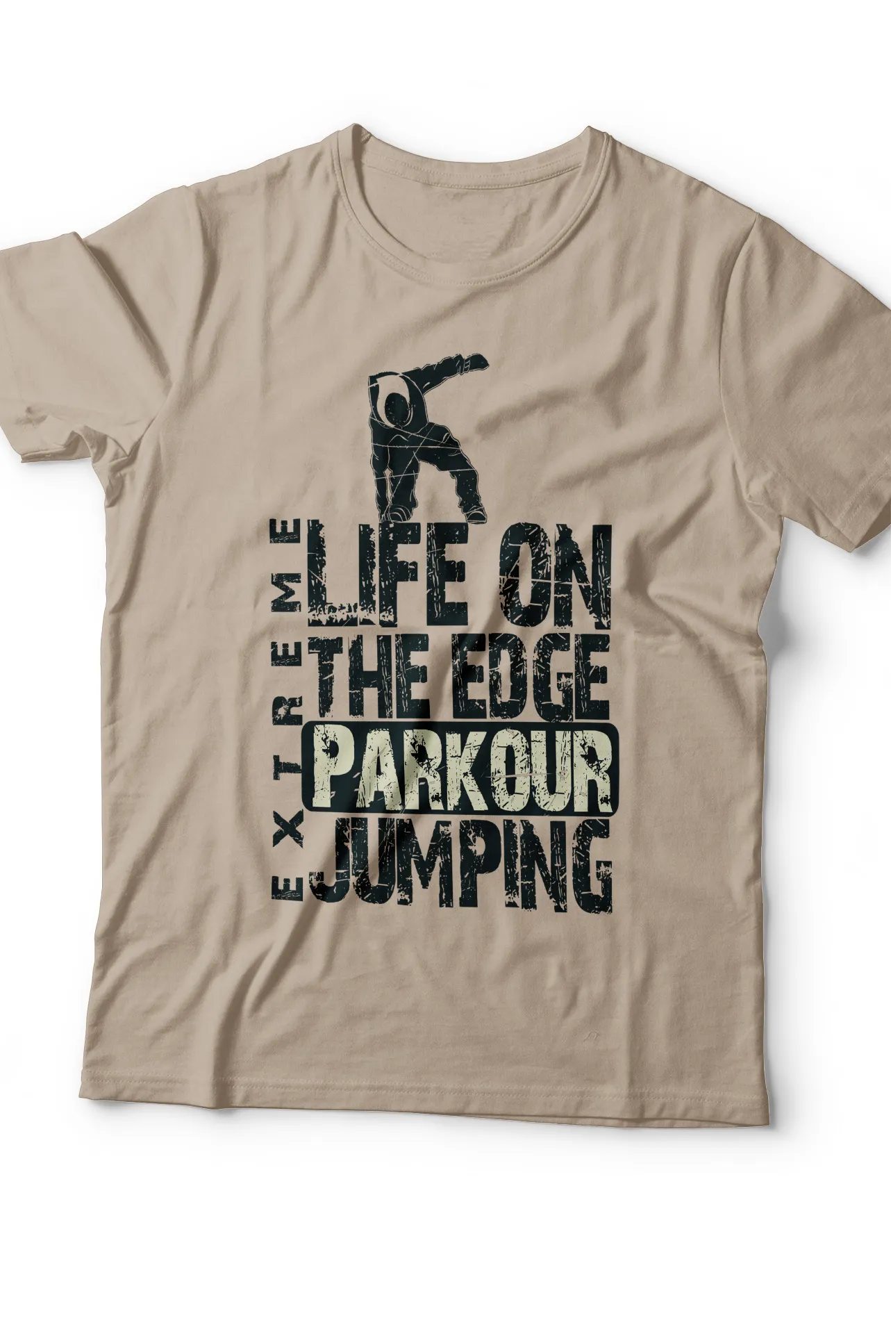 Lo que hace única a esta camiseta es la audacia de su concepto. A diferencia de los estampados comunes de deportes, este diseño tiene un carácter que combina el estilo visual con un mensaje de autenticidad y rebeldía. La superposición de las palabras "LIFE ON THE EDGE" y "EXTREME PARKOUR JUMPING" con el estilo vintage crea una narrativa visual que la convierte en una prenda distintiva que no pasará desapercibida. Es ideal para quienes buscan ropa que no solo se vea bien, sino que también refleje su personalidad única y sin complejos.
