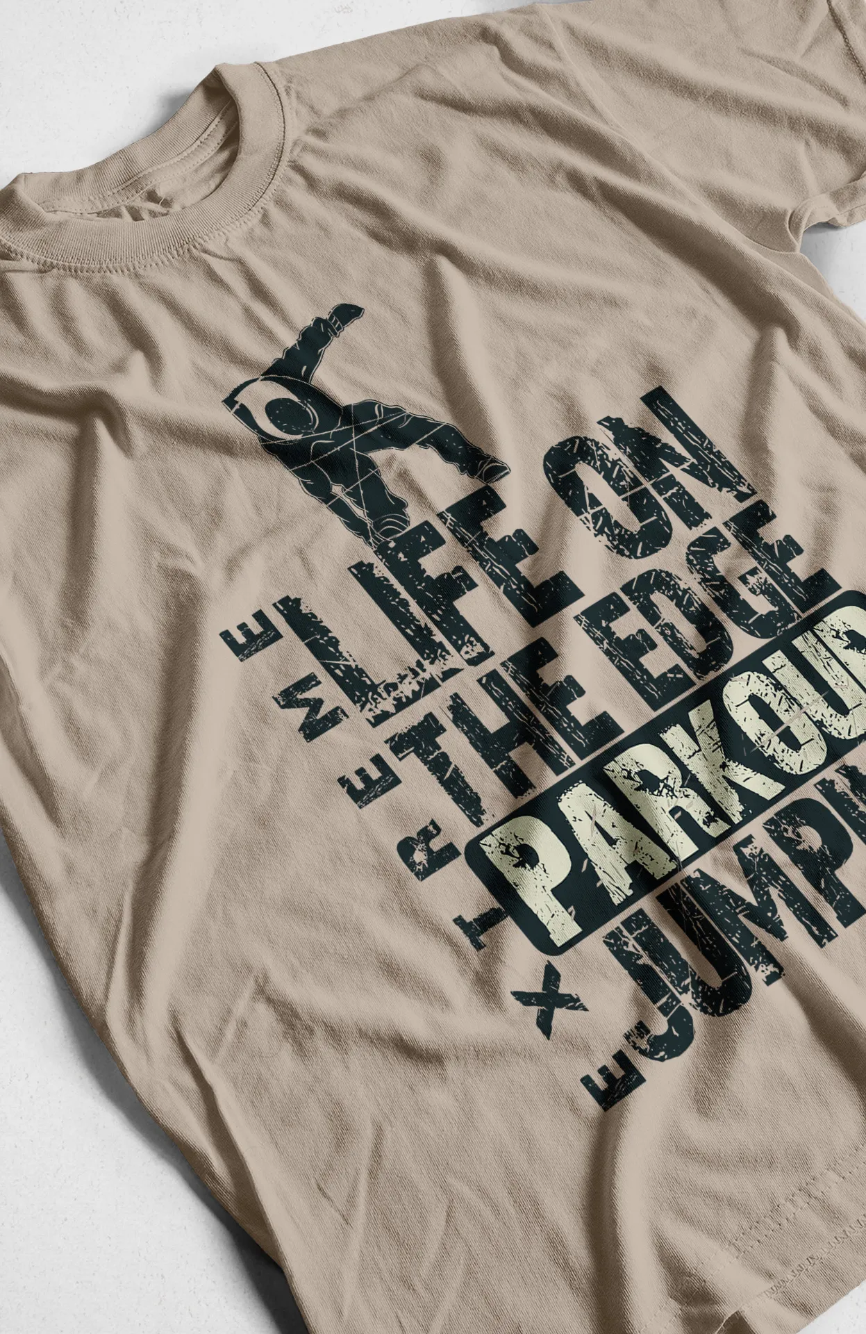 Inyecta una dosis de adrenalina a tu estilo con nuestra camiseta de parkour. El diseño presenta un estilo grunge y audaz con una silueta de parkour en acción, junto con la audaz frase «LIFE ON THE EDGE». Es una prenda que combina un estilo retro y moderno, ideal para quienes buscan un look original y con personalidad. Perfecta para un atuendo casual o para un evento de deportes extremos.
