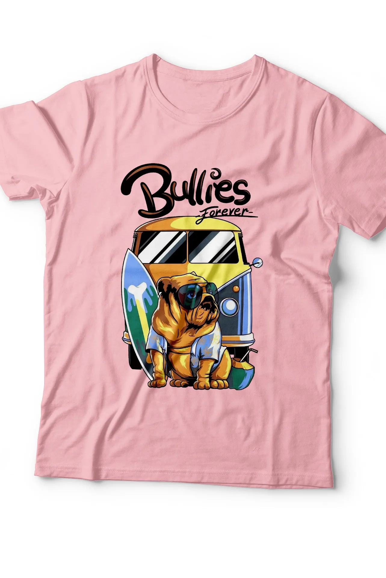 Estampado Pug con gafas, furgoneta y tabla de surf con la frase "Bullies Forever"