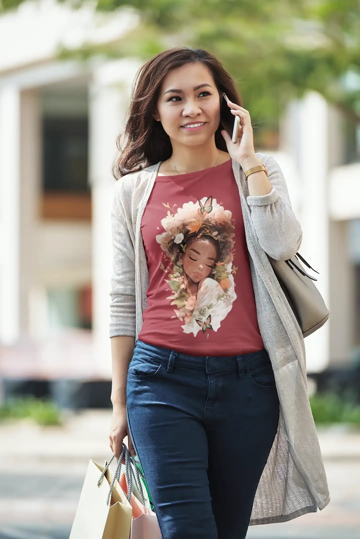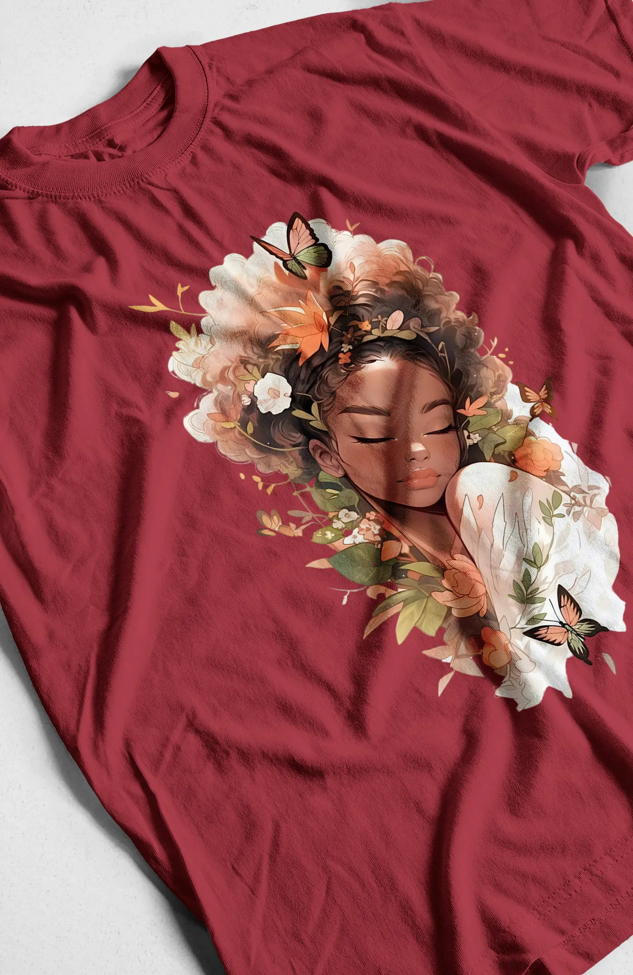 Lleva un look soñador y lleno de belleza con nuestra camiseta de retrato femenino. El diseño presenta un retrato de una mujer con los ojos cerrados, rodeada de un halo de flores y mariposas que evocan una sensación de paz y tranquilidad. Es una prenda que combina un estilo casual y bohemio con un toque de arte, ideal para quienes buscan un look único y significativo. Perfecta para un atuendo casual y para recordarte la importancia de la paz interior.