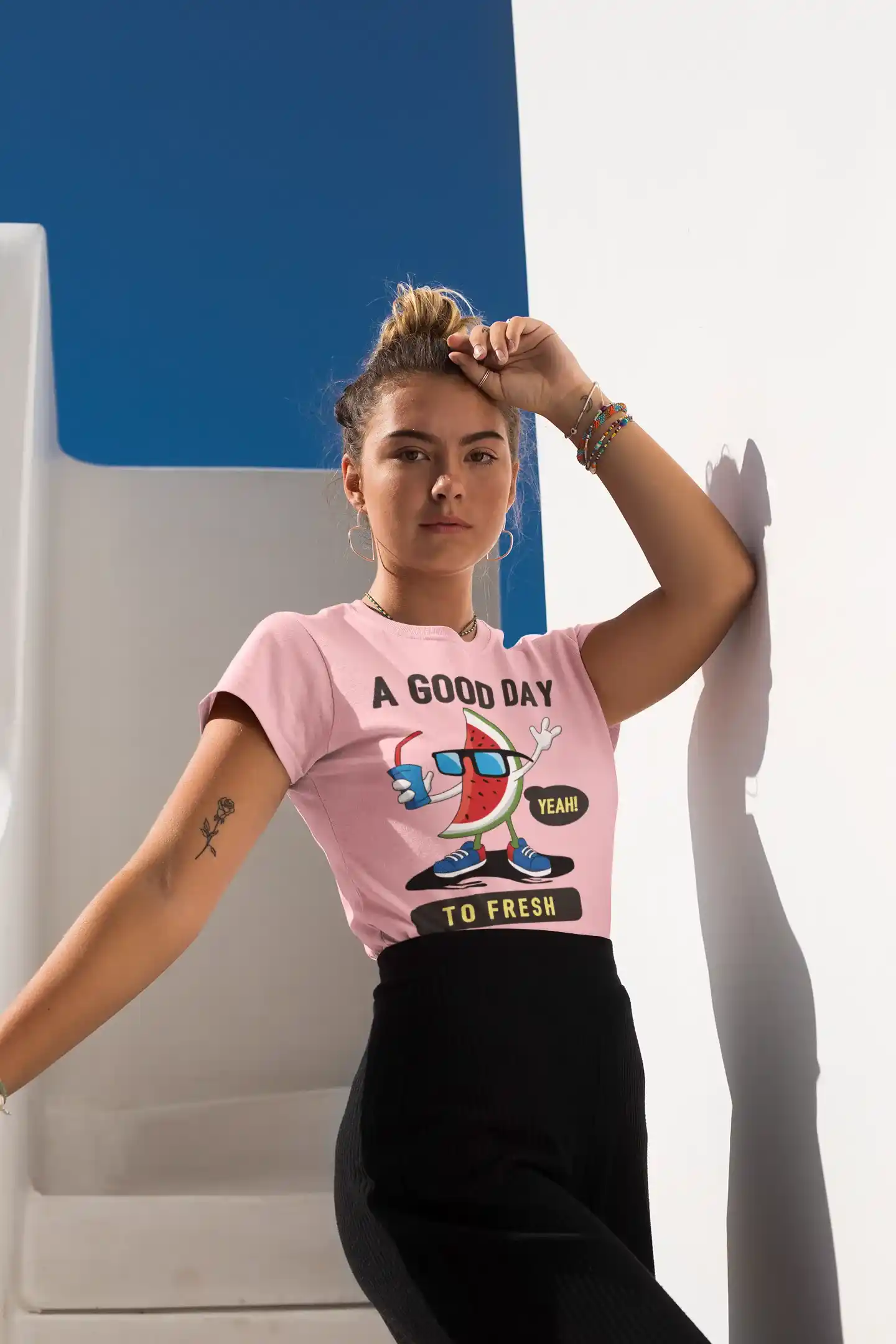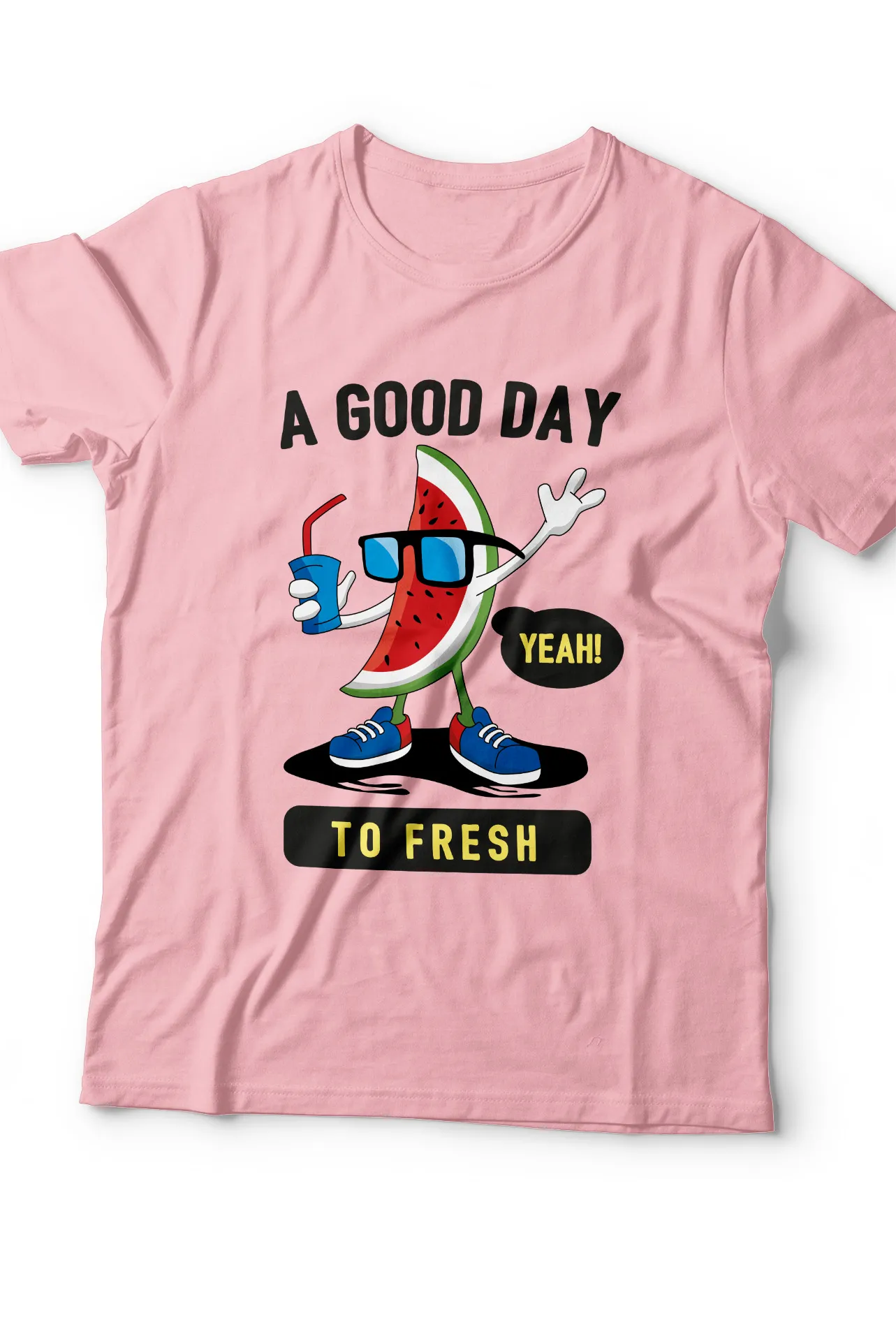 Lo que hace única a esta camiseta es la audacia de su concepto. A diferencia de los estampados de sandías genéricos, este diseño subverte la imagen de la fruta y la convierte en un ícono de estilo urbano y diversión. El mensaje de "A GOOD DAY TO FRESH" va más allá de un simple eslogan y se convierte en una declaración de vida. Es ideal para quienes buscan ropa que no solo se vea bien, sino que también refleje su personalidad única y sin complejos.