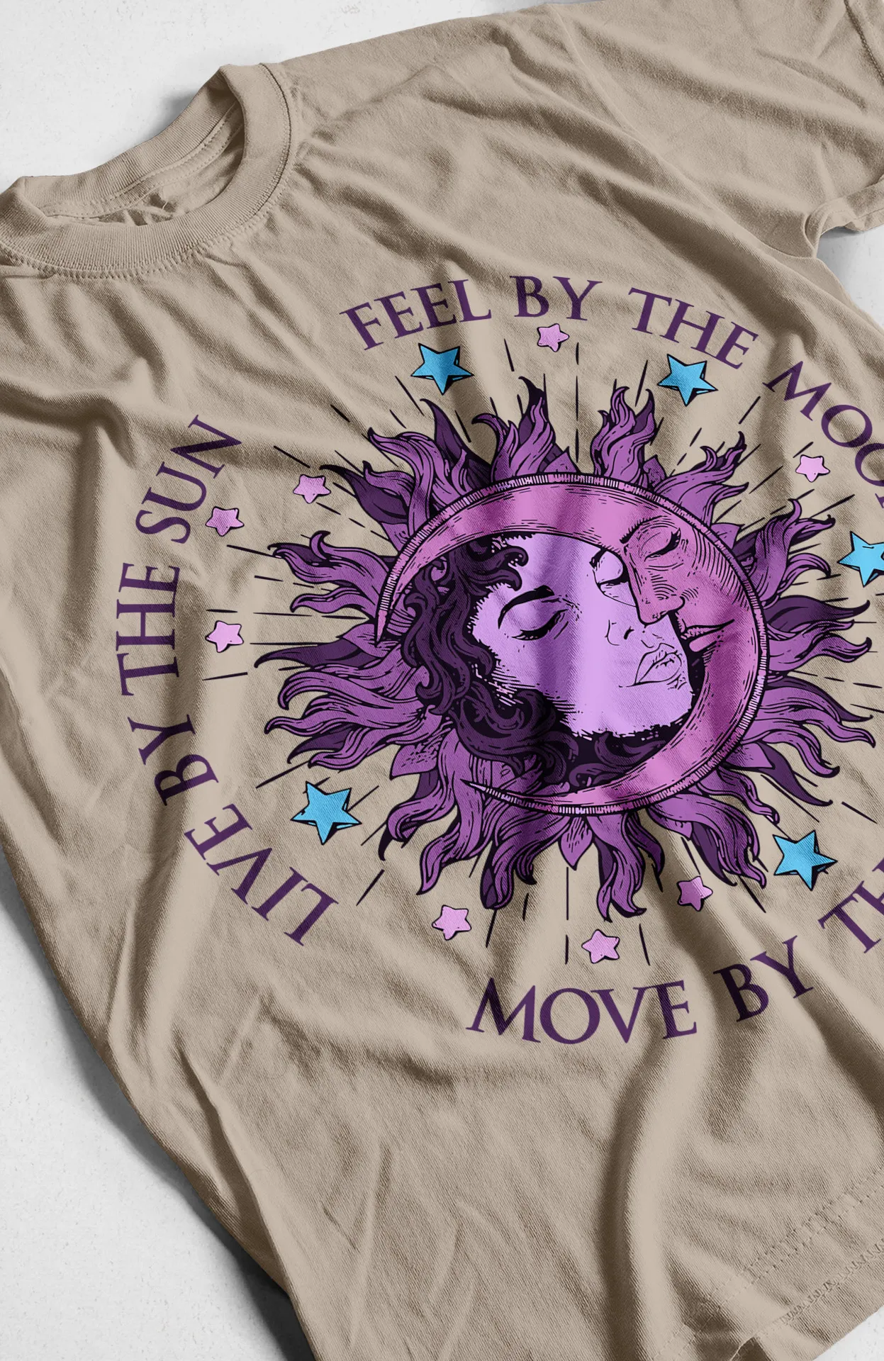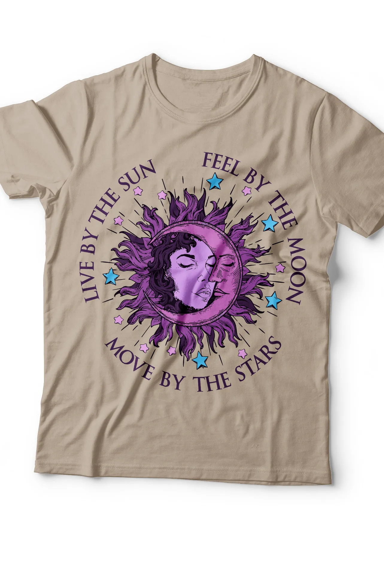 Lleva la energía del universo contigo a donde vayas con nuestra exclusiva camiseta de sol y luna. Esta prenda es un lienzo de estilo bohemio que te invita a vivir en armonía con los ciclos naturales. El diseño central, con un sol místico que alberga una luna y el rostro de una mujer, evoca un sentido de conexión con el cosmos y sus elementos. La inspiradora frase "LIVE BY THE SUN, FEEL BY THE MOON, MOVE BY THE STARS" (Vive por el sol, siente por la luna, muévete por las estrellas) añade un toque de magia y espiritualidad. Es la elección perfecta para quienes aprecian la moda con un mensaje profundo y un estilo soñador.