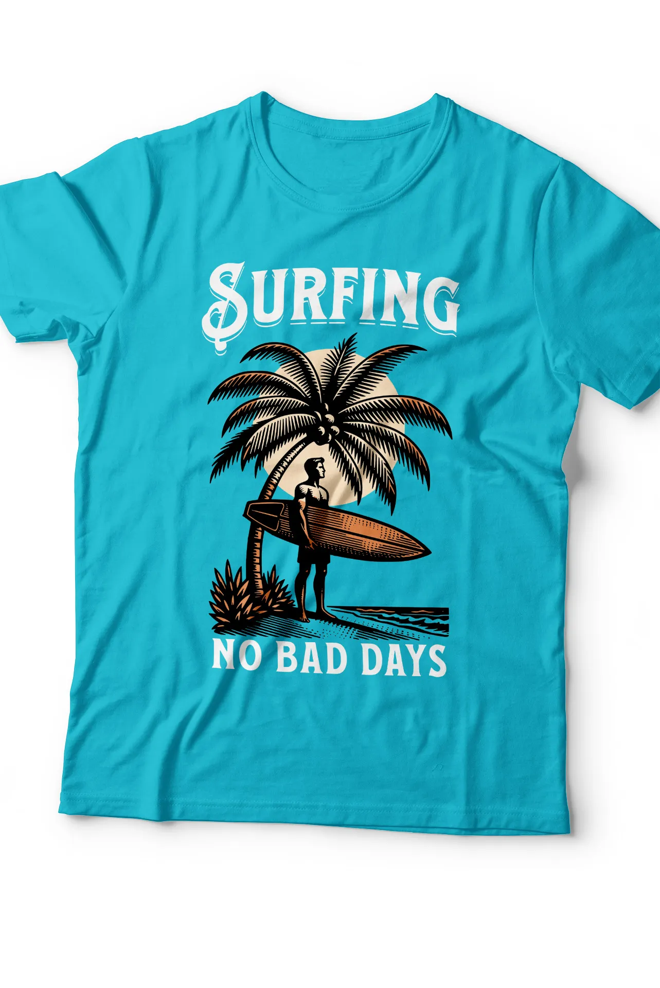 - Diseño: Estampado frontal de un surfista bajo una palmera, con un atardecer de fondo, las leyendas "SURFING" y "NO BAD DAYS".