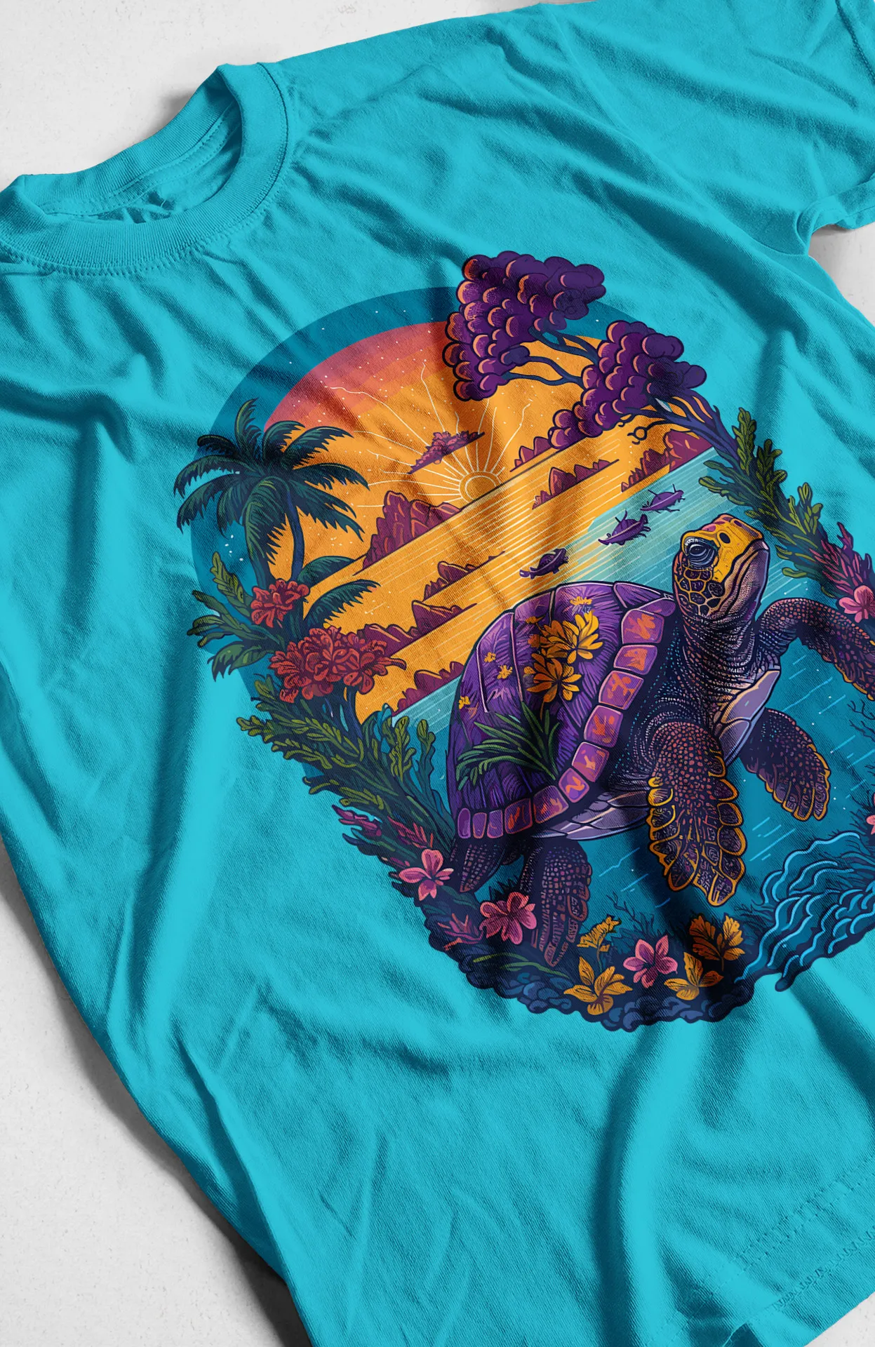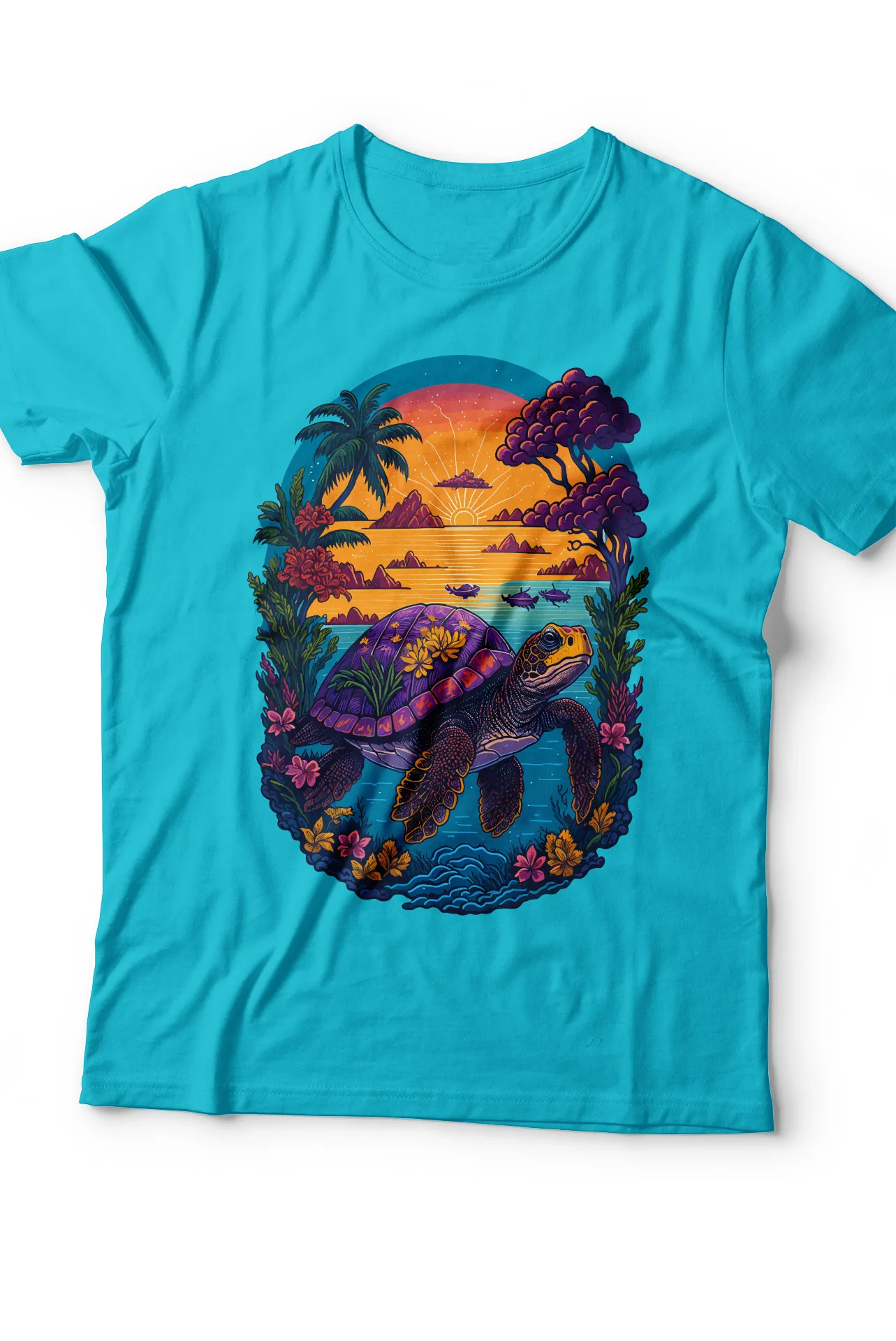 Embárcate en un viaje exótico con esta camiseta que captura la magia del océano. El diseño vibrante y detallado de una tortuga marina nadando en un paraíso tropical, rodeada de palmeras, un sol radiante y flores, es una obra de arte. Esta prenda es ideal para quienes aman la naturaleza, los animales y la moda original. Perfecta para el día a día, esta camiseta se adapta a cualquier ocasión, ya sea para un paseo por la playa o una tarde de juegos con amigos.