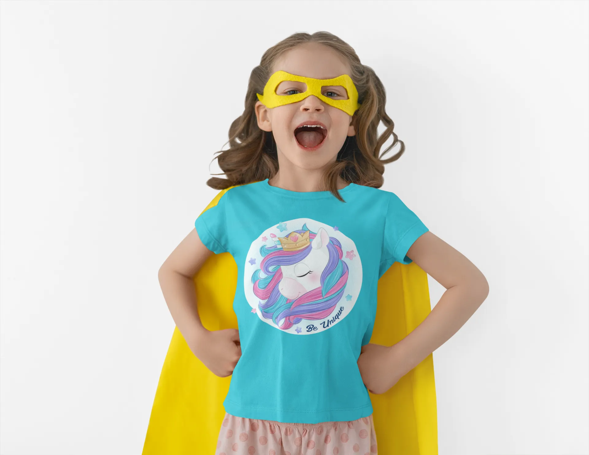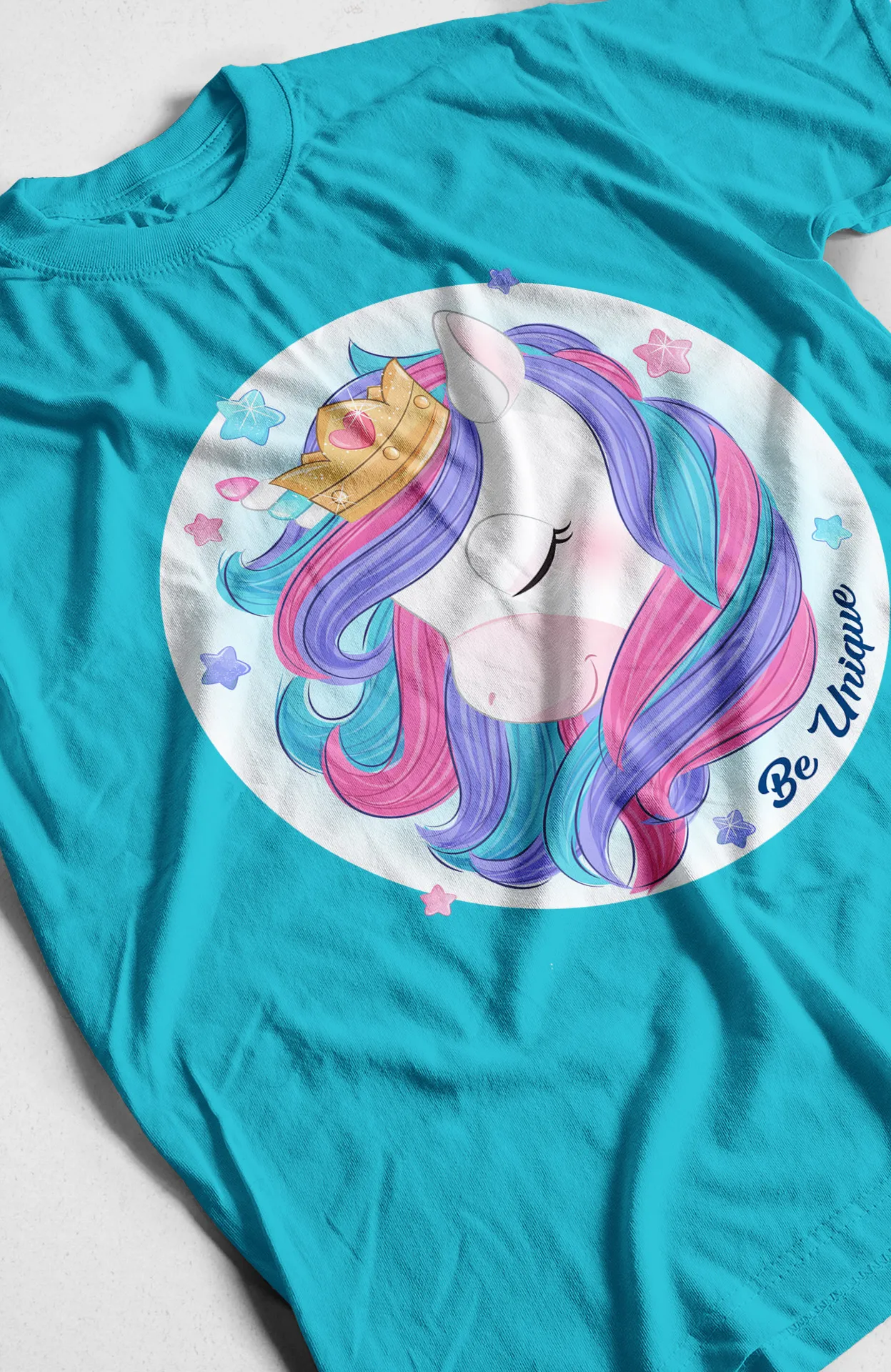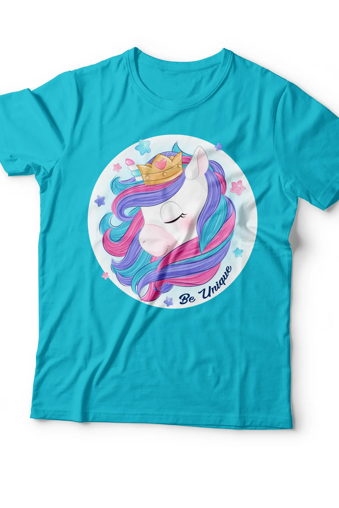 Destaca con esta camiseta de unicornio con corona mágica y mensaje «Be Unique». Su diseño colorido y alegre aporta un estilo único y lleno de confianza, ideal para cualquier ocasión casual.
