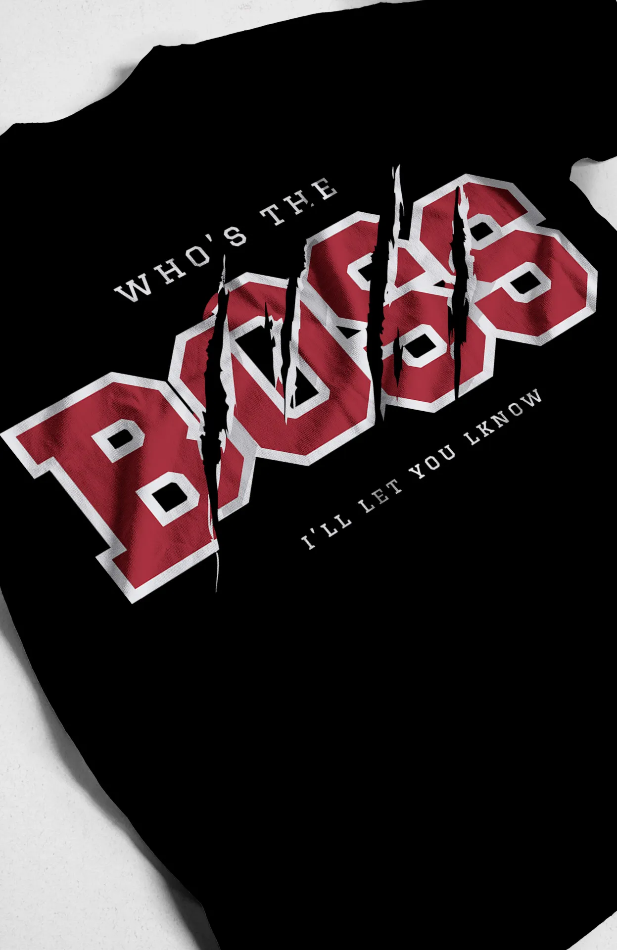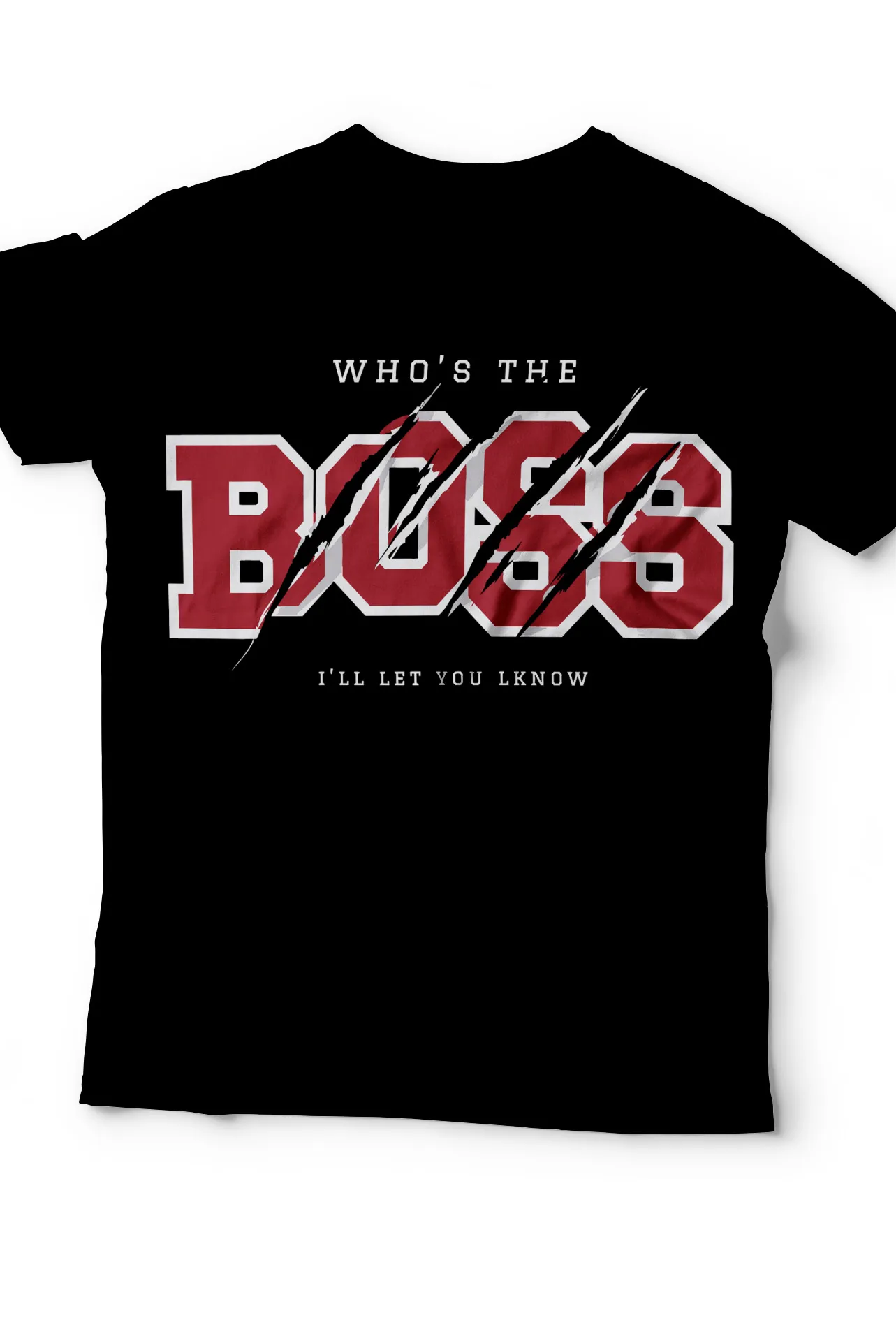 Lleva tu estilo al siguiente nivel con nuestra exclusiva camiseta de "Who's the Boss". Esta prenda es una mezcla audaz de lo divertido y lo rebelde, con un diseño que presenta una tipografía audaz y superpuesta que evoca una estética streetwear, con las frases "WHO'S THE BOSS" y "I'LL LET YOU KNOW". Los rasguños de garra añaden un toque de autenticidad urbana. Es la elección perfecta para quienes no temen destacar y quieren infundir su look con un mensaje de confianza y diversión.