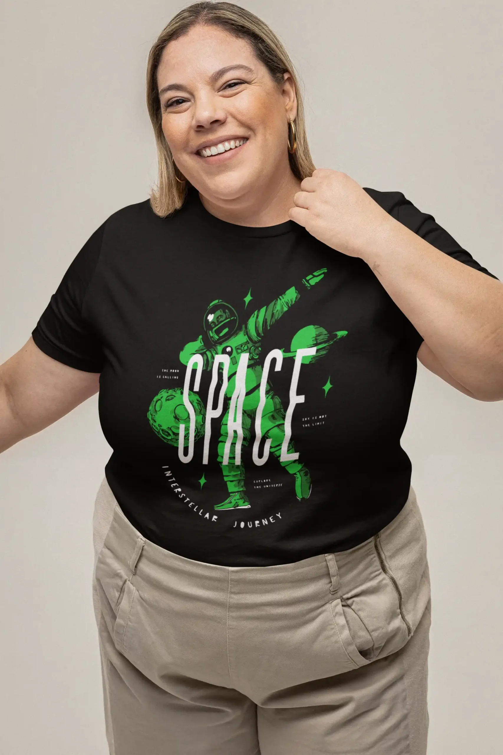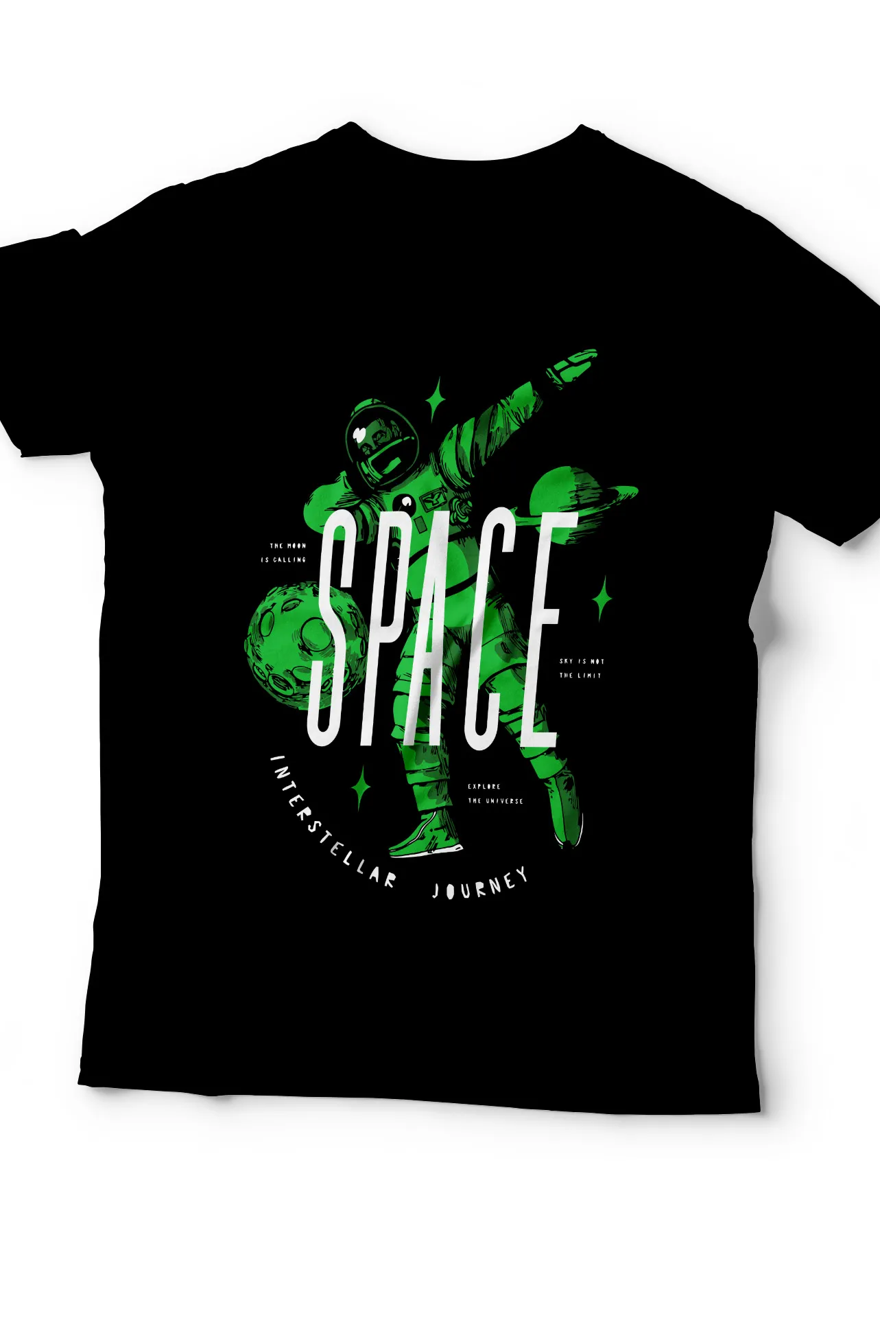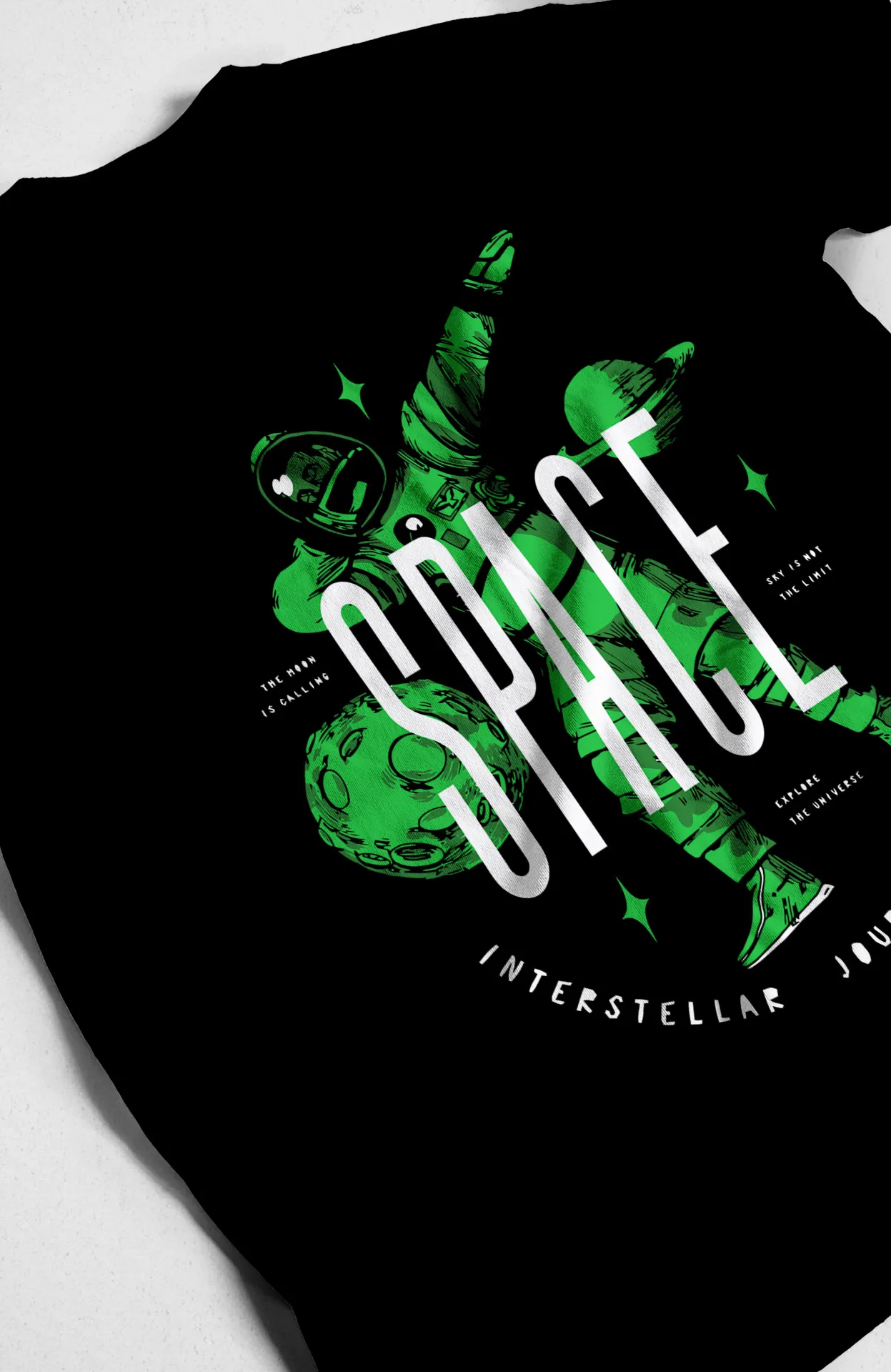 Esta camiseta presenta un cuello redondo clásico y un corte que se adapta cómodamente a tu figura. El estampado del astronauta y la palabra "SPACE" en verde neón crea un efecto visual llamativo y moderno. La tipografía de "INTERSTELLAR JOURNEY" en la parte inferior le da un toque extra al diseño. La calidad de la impresión asegura que los colores se mantengan intensos y la definición nítida lavado tras lavado.