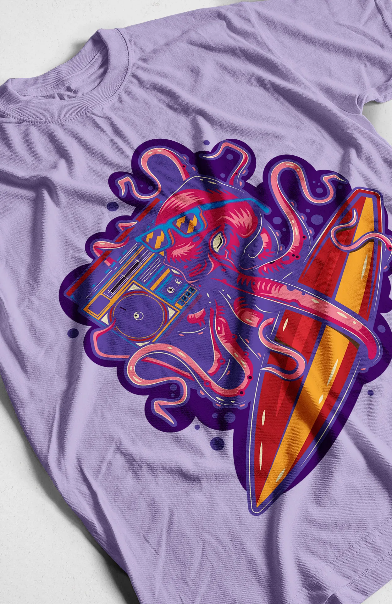 Camiseta Diseño Pulpo Surfeando con Radio Retro