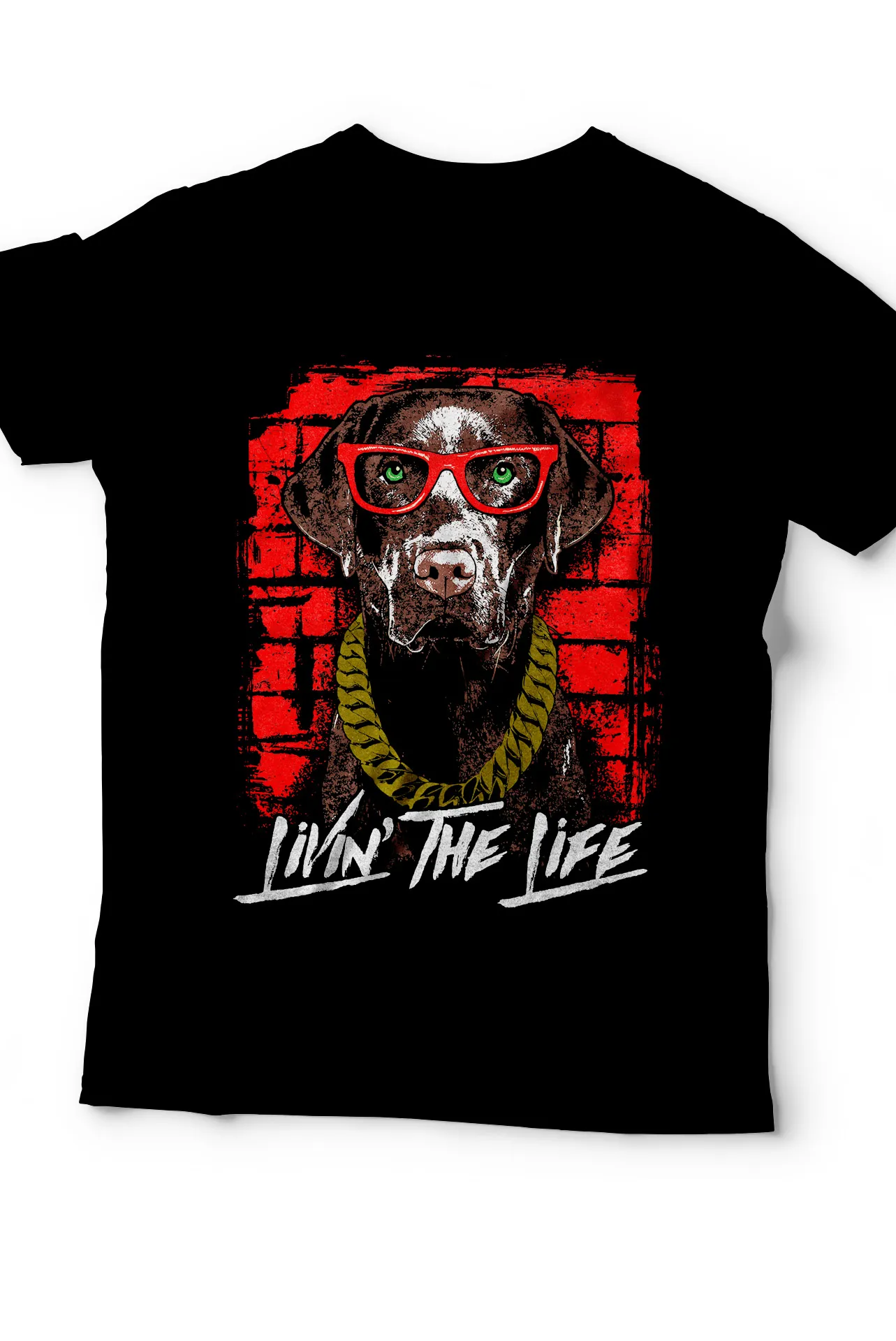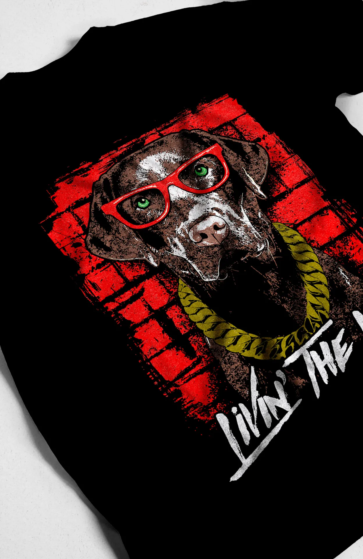Lleva tu estilo al siguiente nivel con la camiseta "Livin' the Life". Esta prenda es más que una simple camiseta; es una obra de arte que celebra el humor y la moda callejera. El diseño de un perro con gafas de sol y una cadena de oro sobre un fondo de ladrillos rojos crea una estética potente y memorable. Perfecta para quienes aman el arte gráfico y las prendas con personalidad.