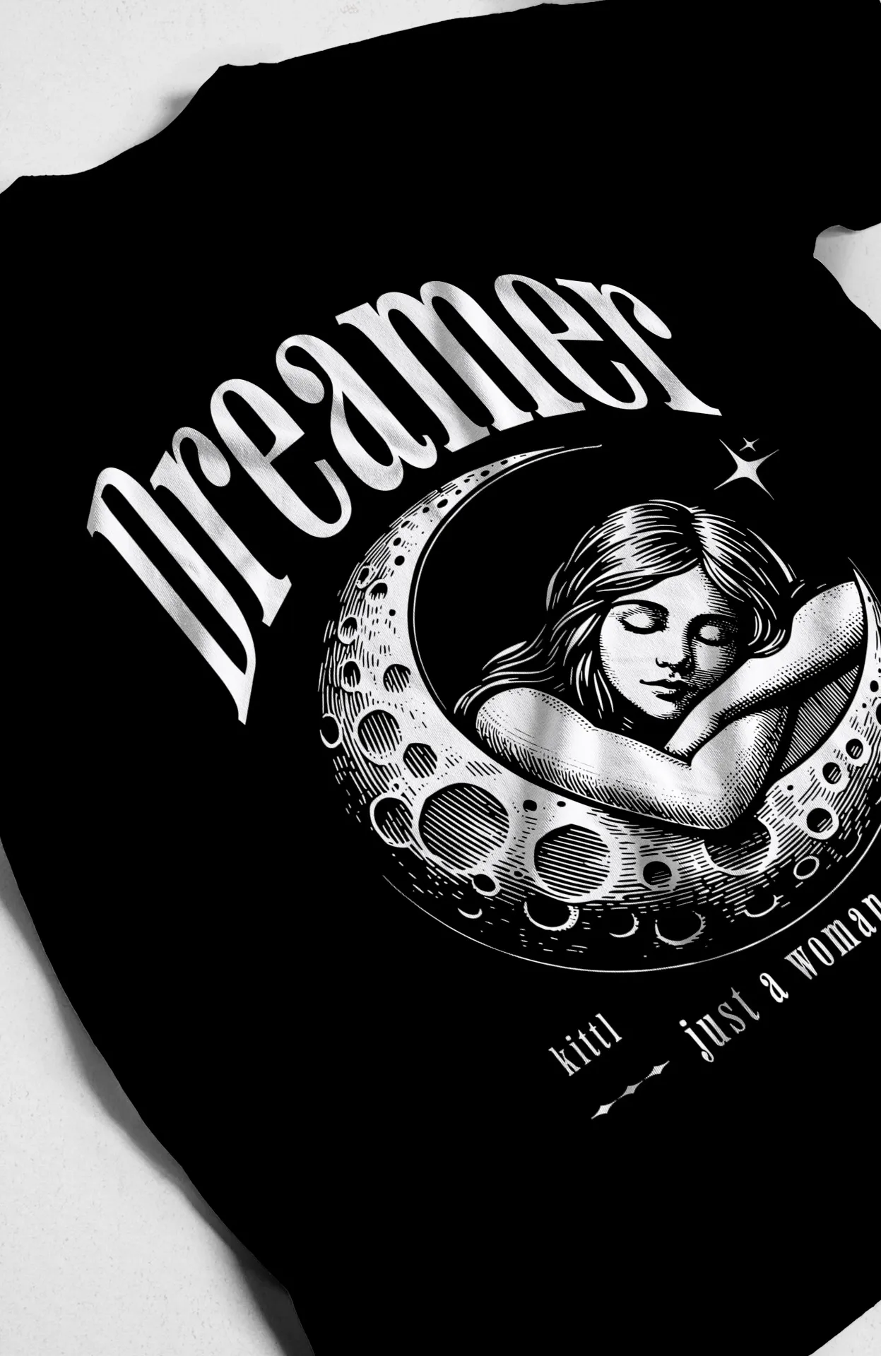 | Diseño | Gráfico de una mujer durmiendo en una luna creciente con texto "DREAMER" en la espalda |