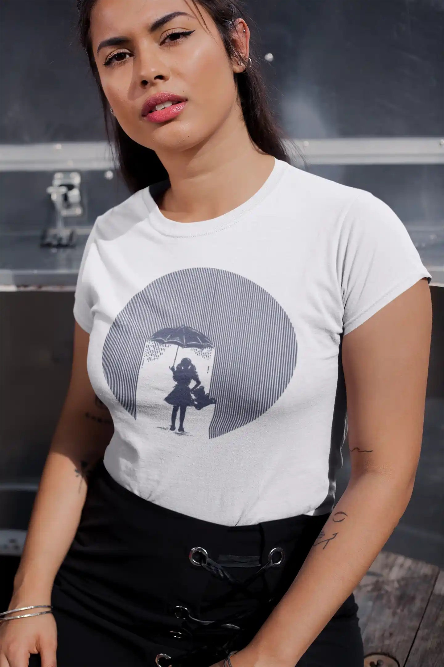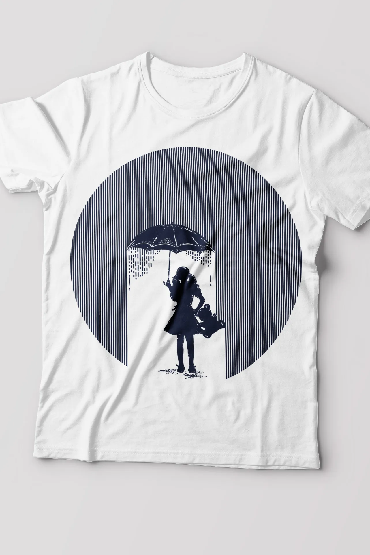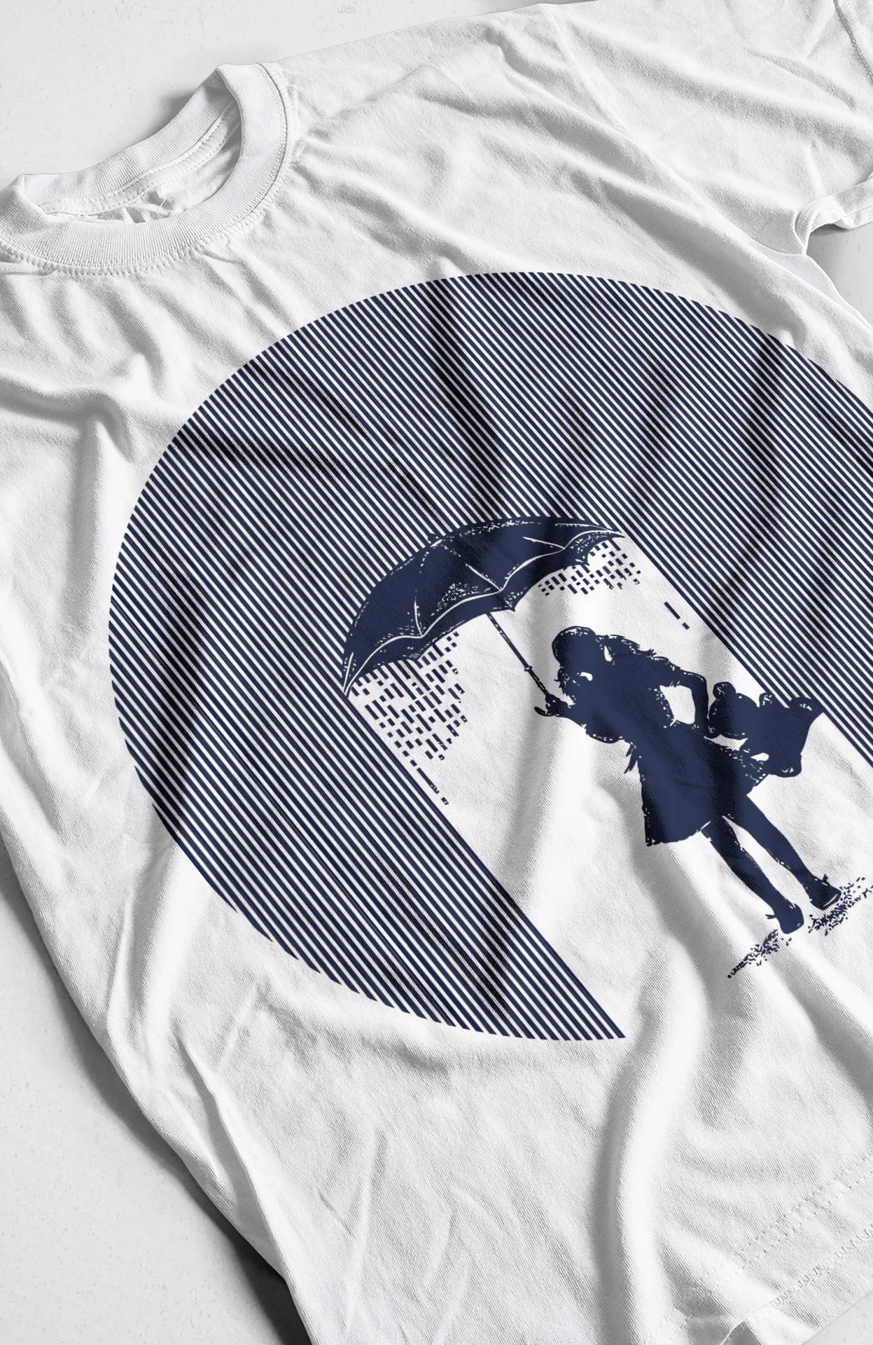 Agrega un toque artístico a tu armario con nuestra camiseta estampada con un diseño gráfico único. Esta prenda presenta a una figura estilizada con paraguas, creando una atmósfera minimalista y elegante que captura la esencia del arte moderno. Perfecta para quienes buscan una prenda con estilo y un mensaje visual poderoso.