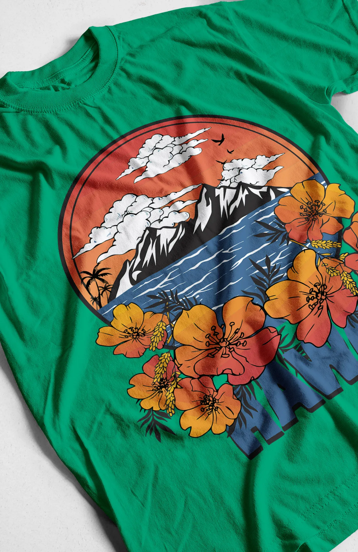 • Diseño tropical único: Con montañas, flores y colores vibrantes, esta camiseta te transporta a las playas de Hawái.