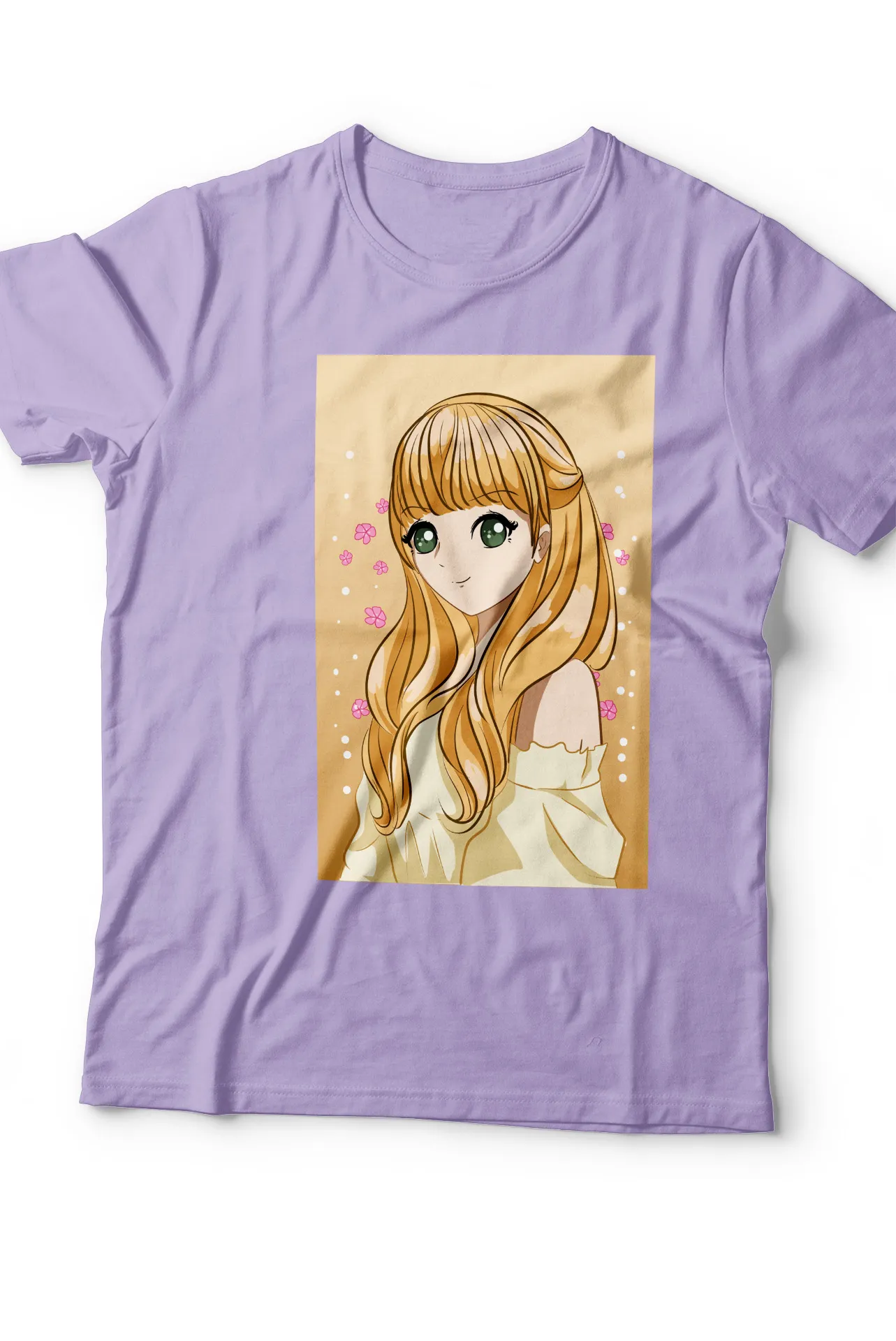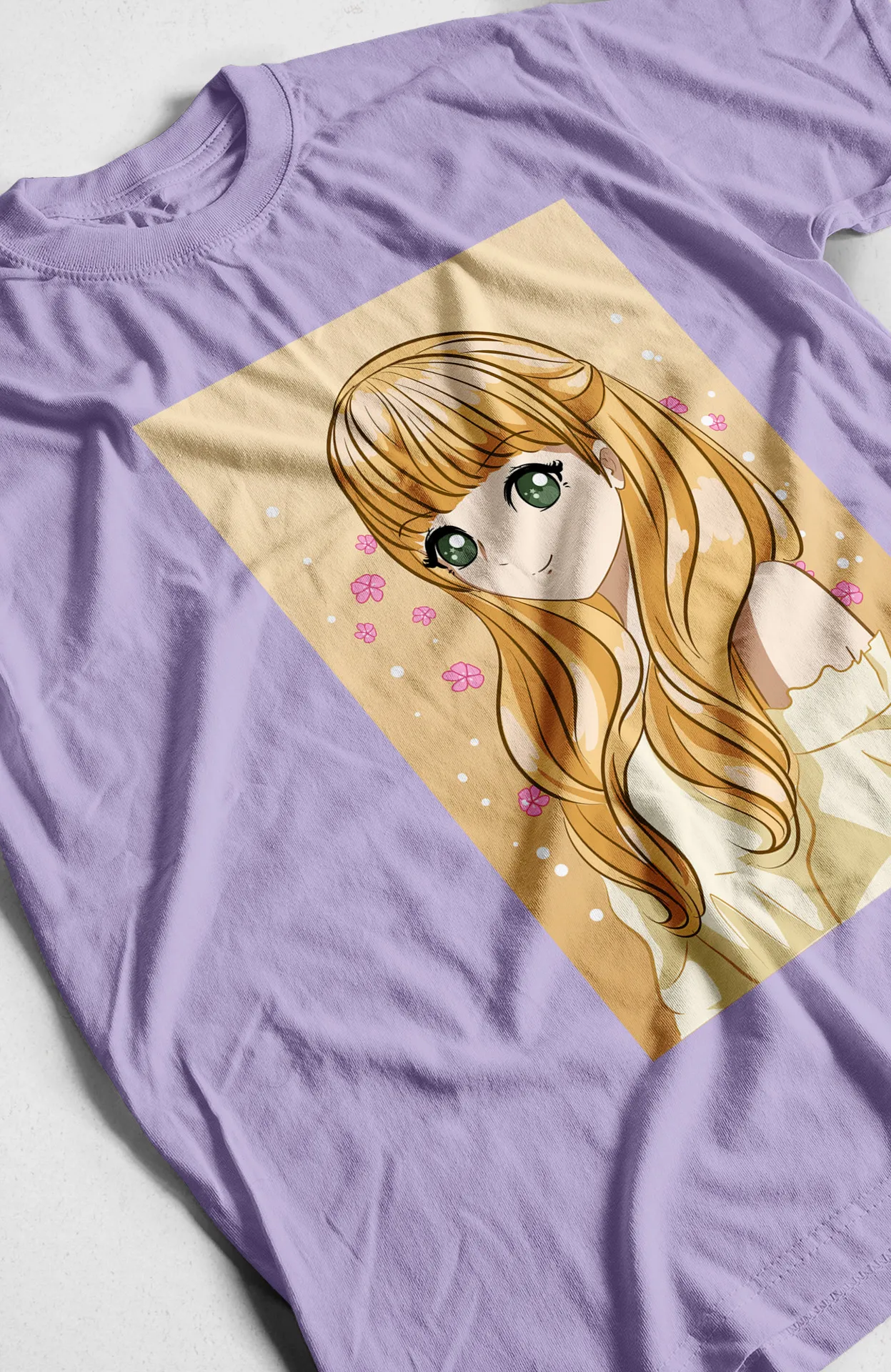 • Estilo gráfico: Ilustración tipo anime/manga de chica rubia con flores