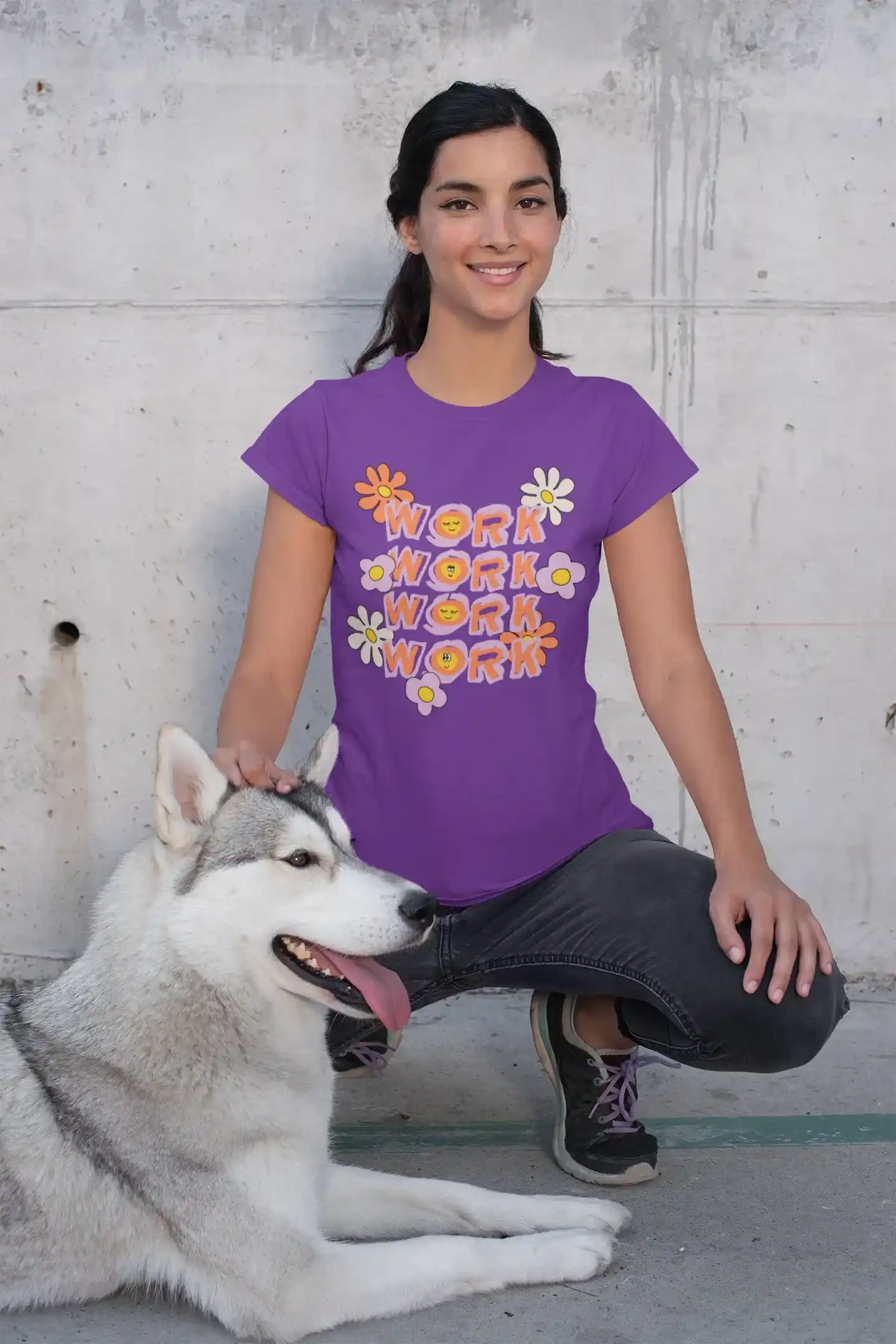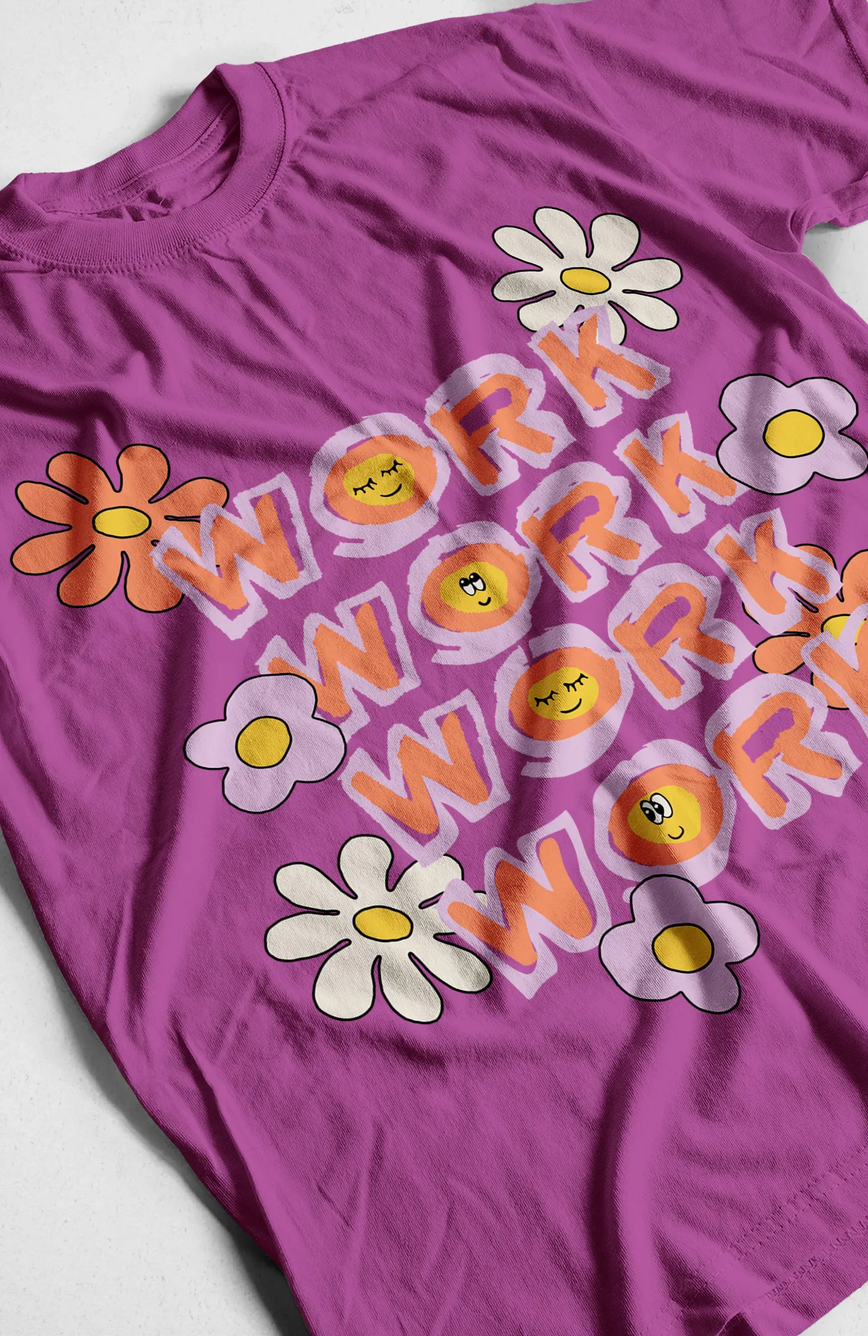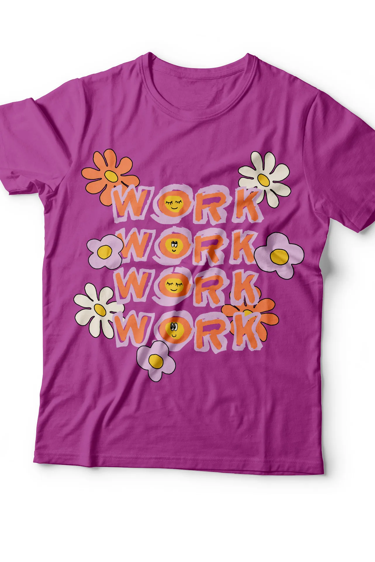 Dale un toque divertido y retro a tus días de trabajo con la camiseta "Work Work Work". Esta prenda única presenta un diseño de estilo retro que combina la palabra "Work" con emoticones sonrientes y ojos en forma de "X", enmarcados por un fondo de flores coloridas. Es más que una simple camiseta; es un recordatorio de que la actitud lo es todo. Ideal para quienes buscan un estilo que refleje su personalidad alegre y su deseo de dejar una impresión duradera. Sin duda, una camiseta que te hará sentir bien por dentro y por fuera.