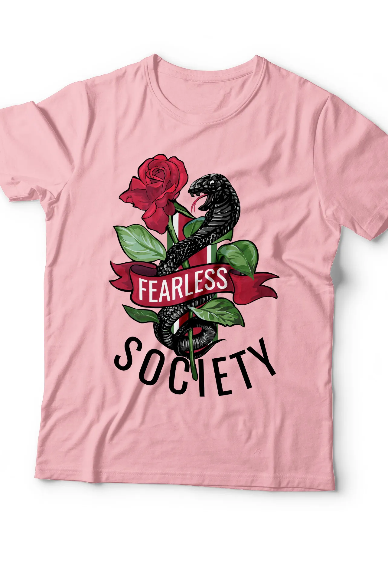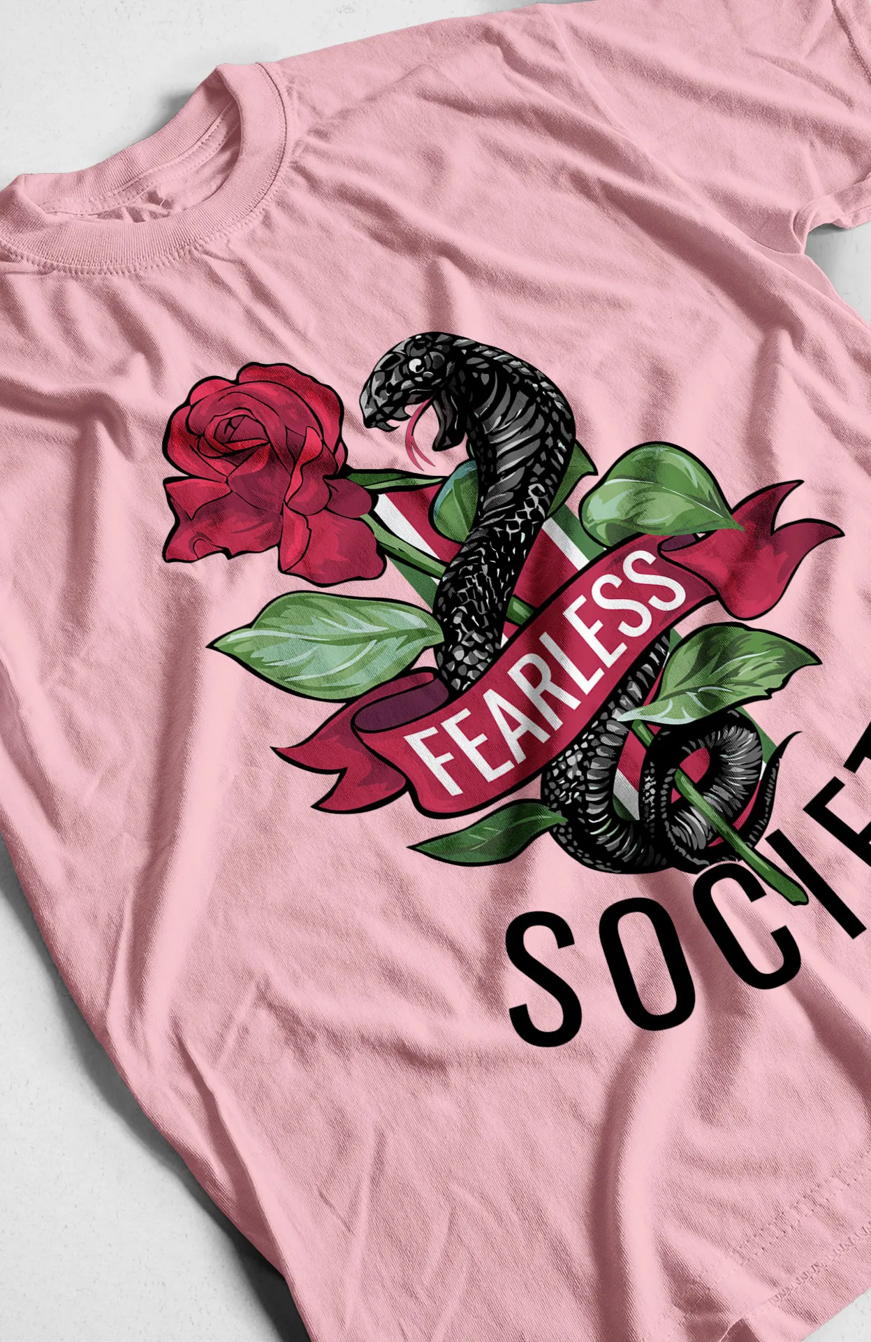 El mensaje "FEARLESS SOCIETY" hace de esta camiseta una prenda empoderadora, mientras que el diseño de la rosa agrega un toque de elegancia. Ideal para quienes buscan algo más que una simple camiseta, ¡es un estilo de vida!